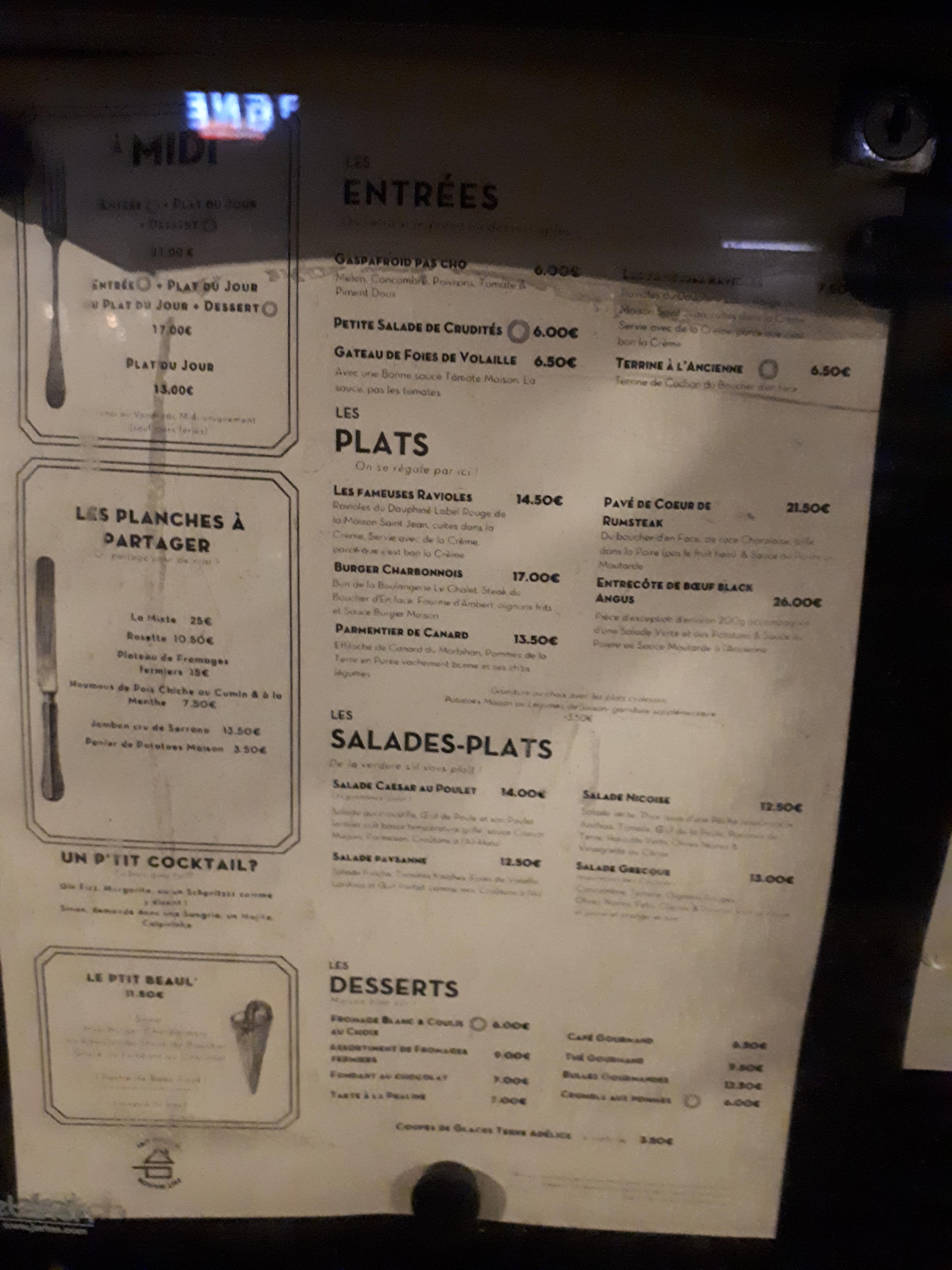 Je n'ai profité que de la terrasse ombragée et de quelques boissons. Mais pour un dimanche après-midi caniculaire ....c'était parfait. Calme et frais Service rapide et petit prix des boissons Il faudra revenir pour goûter les plats