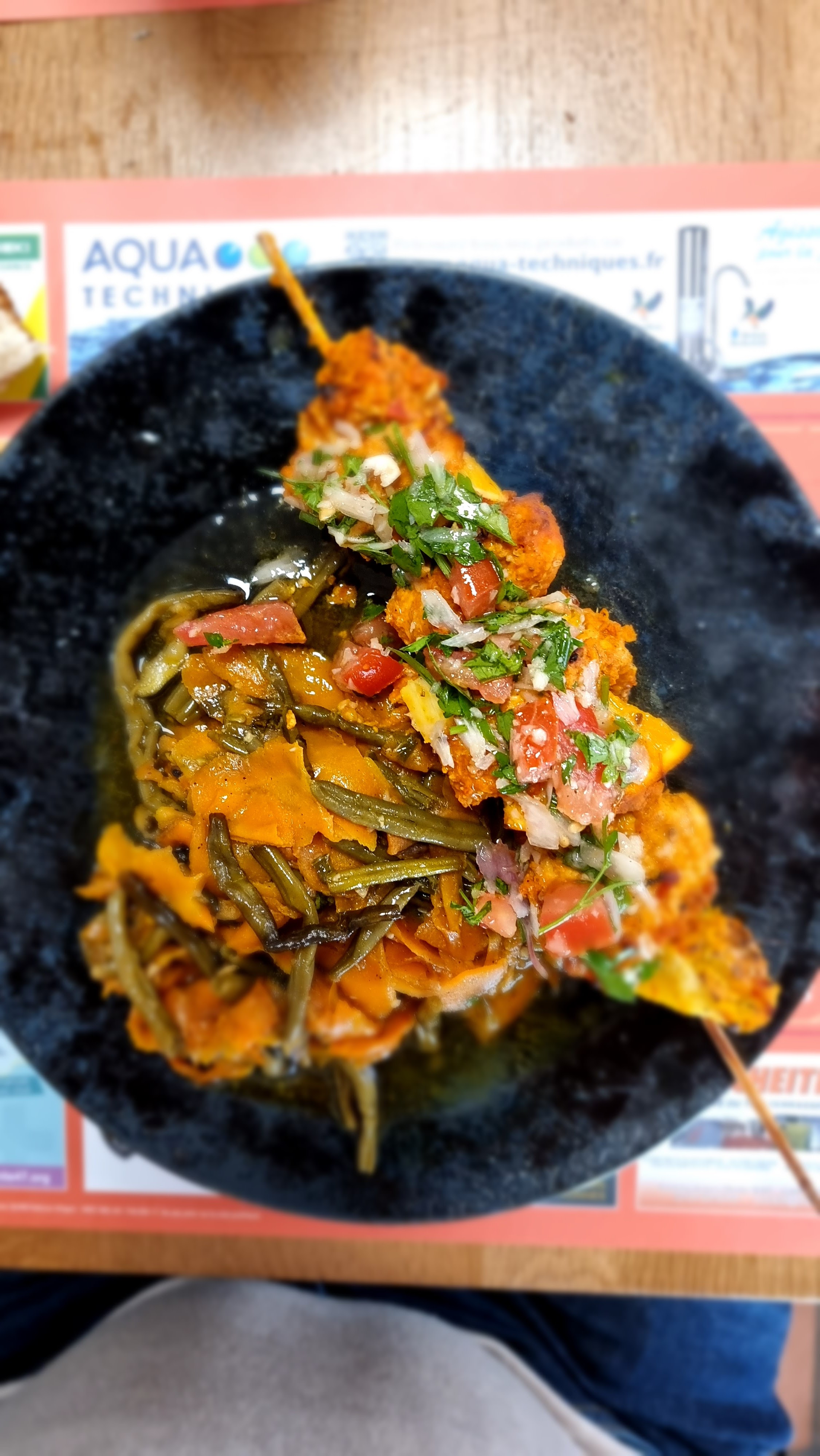 Plat du jour brochette de dinde et accompagnement légumes. Rien à redire, service, cadre très bien pour déjeuner pro. Je recommande 👍