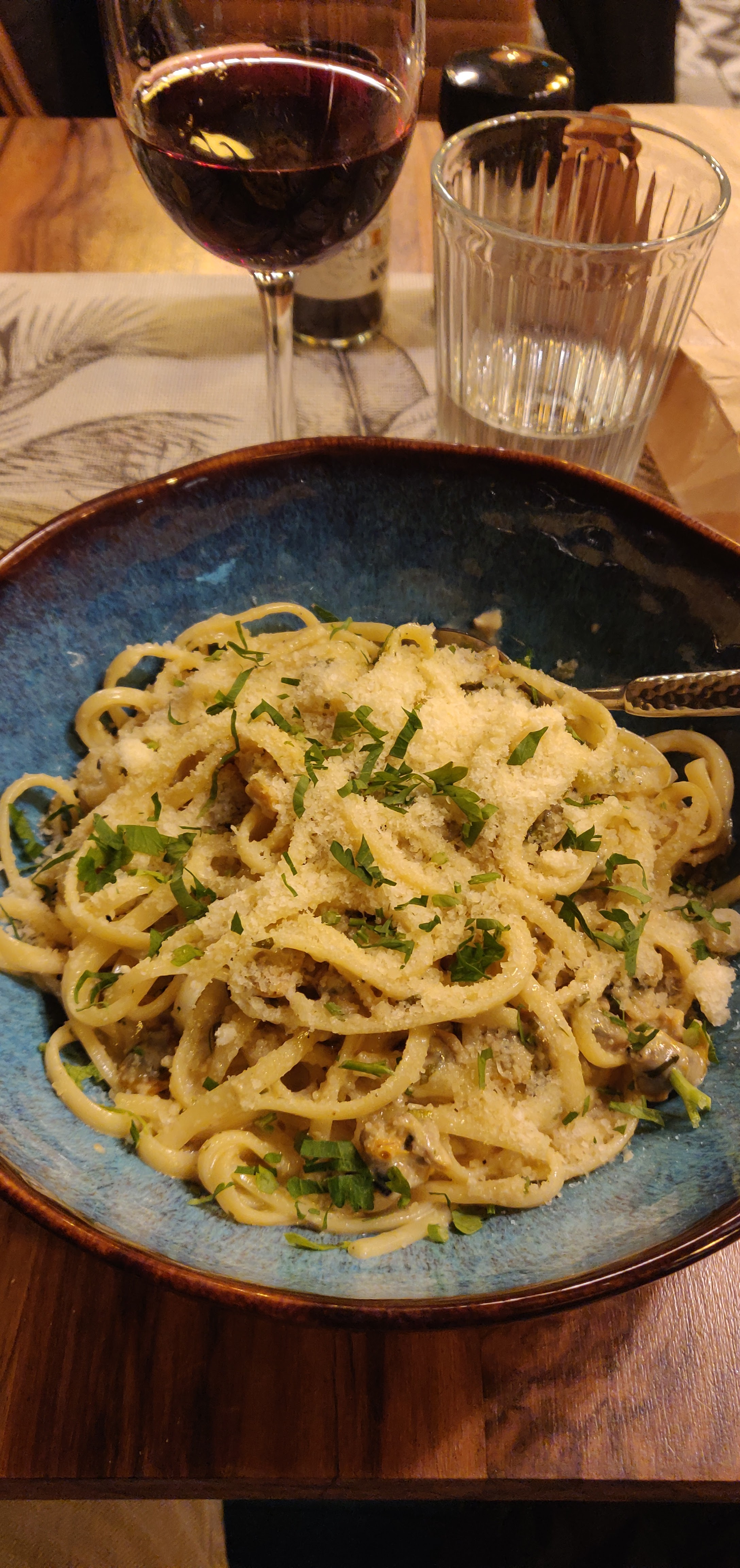 désolée pour la note, mais nous sommes très déçus par le menu à 20 eur. Nous avons pris des linguine. 3 cuillères à soupe de produit et l'assiette était finie. ... Le dessert feuilleté sur crème de pistache était un dessert rapide, aucun intérêt. Mon mari a mangé du pain pour ne plus avoir faim.... Nous étions déjà venu il y a quelques années. Grosse déception.