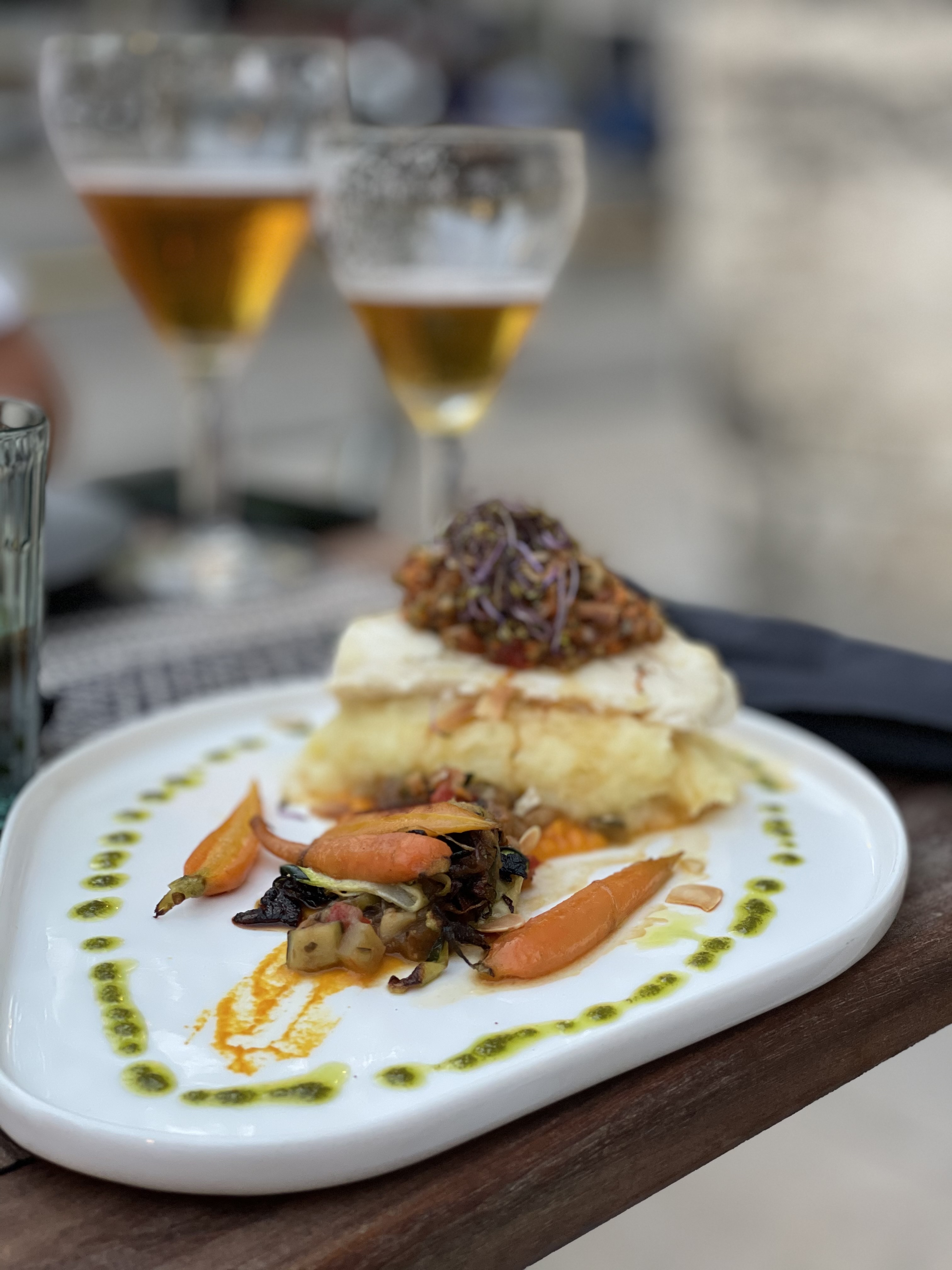 Après avoir eu du mal à trouver de la vraie nourriture végétarienne/végétalienne tout au long de notre voyage en France, ce fut un soulagement bienvenu de trouver un repas étiqueté végétalien sur un menu. Ce qui est arrivé était une assiette de « vrais » légumes, composé de pommes de terre nouvelles, de chou-fleur, d'artichaut, de carottes, de lentilles et de purée de patates douces. Très savoureux et très copieux. Service rapide par un personnel sympathique et anglophone. Une atmosphère détendue. Hautement recommandé.