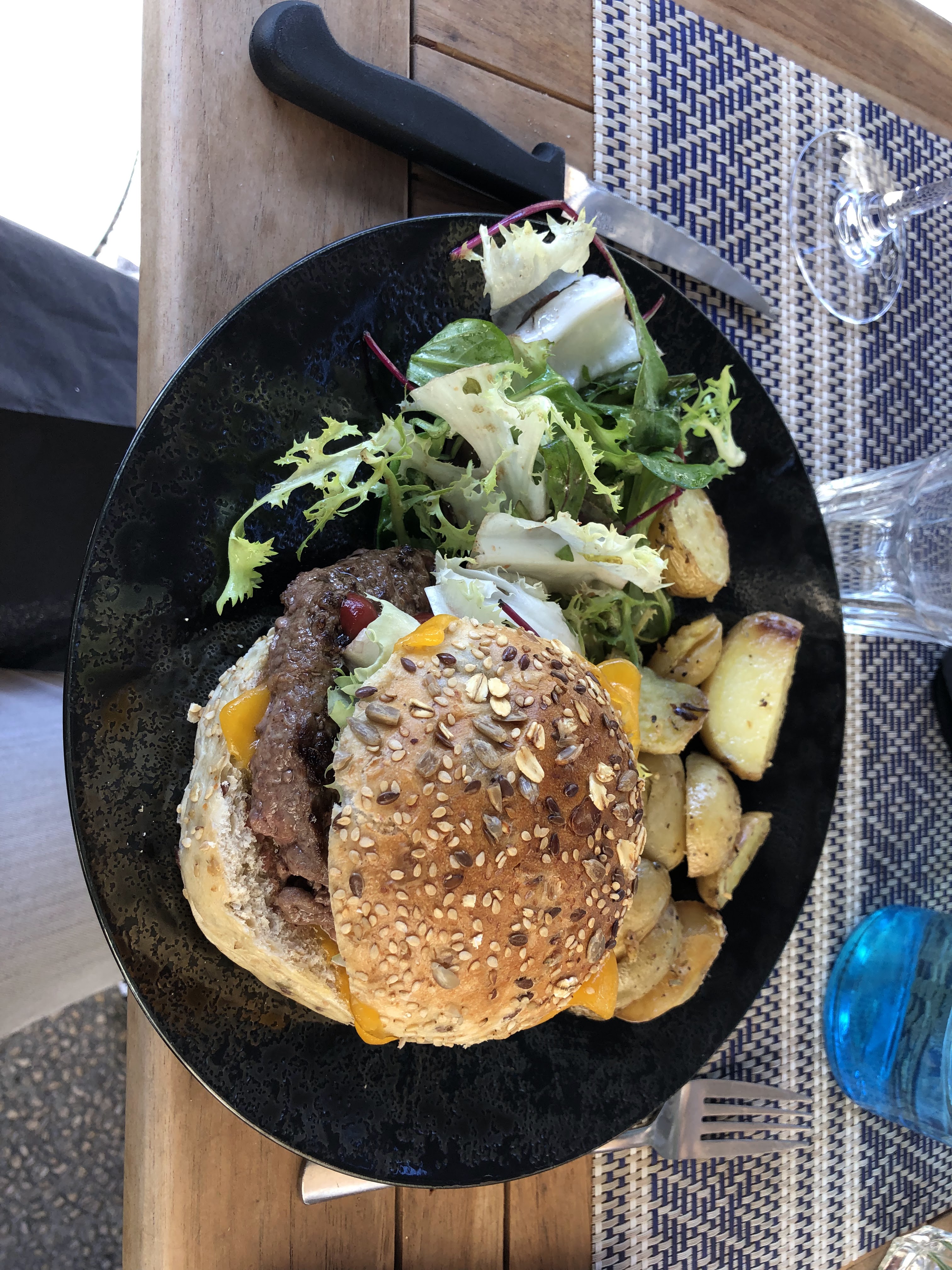 Nous y sommes allés le jour de la Révolution française, cette année il y a eu un grand feu de brousse à proximité donc le ciel était sombre et même les cendres sont tombées. Nous nous sommes assis dehors, dans un joli coin salon, mais la porte était tenue ouverte de manière non professionnelle par un extincteur. Cela s'est ressenti deux fois :). Le service était sympathique, bon en anglais et toujours gentil. La nourriture était tellement délicieuse, nous recommandons vraiment le tatar de thon (entrée et plat principal), qui avait une vinaigrette fantastique. Toute la combinaison avec les garnitures et les noix était fantastique. Pour les plats principaux nous avons eu la salat avec la bruscetta, les pâtes (trop de crème à notre goût), le bœuf tatar et un burger. Le burger était tout simplement parfait, bon pain et bonne qualité de bœuf. Il aurait pu y avoir une petite salat à côté. Pour ma mère, le bœuf Tatar manquait d'épices et sa salat était trop grasse. En résumé la nourriture était très bonne et nous le recommandons !
