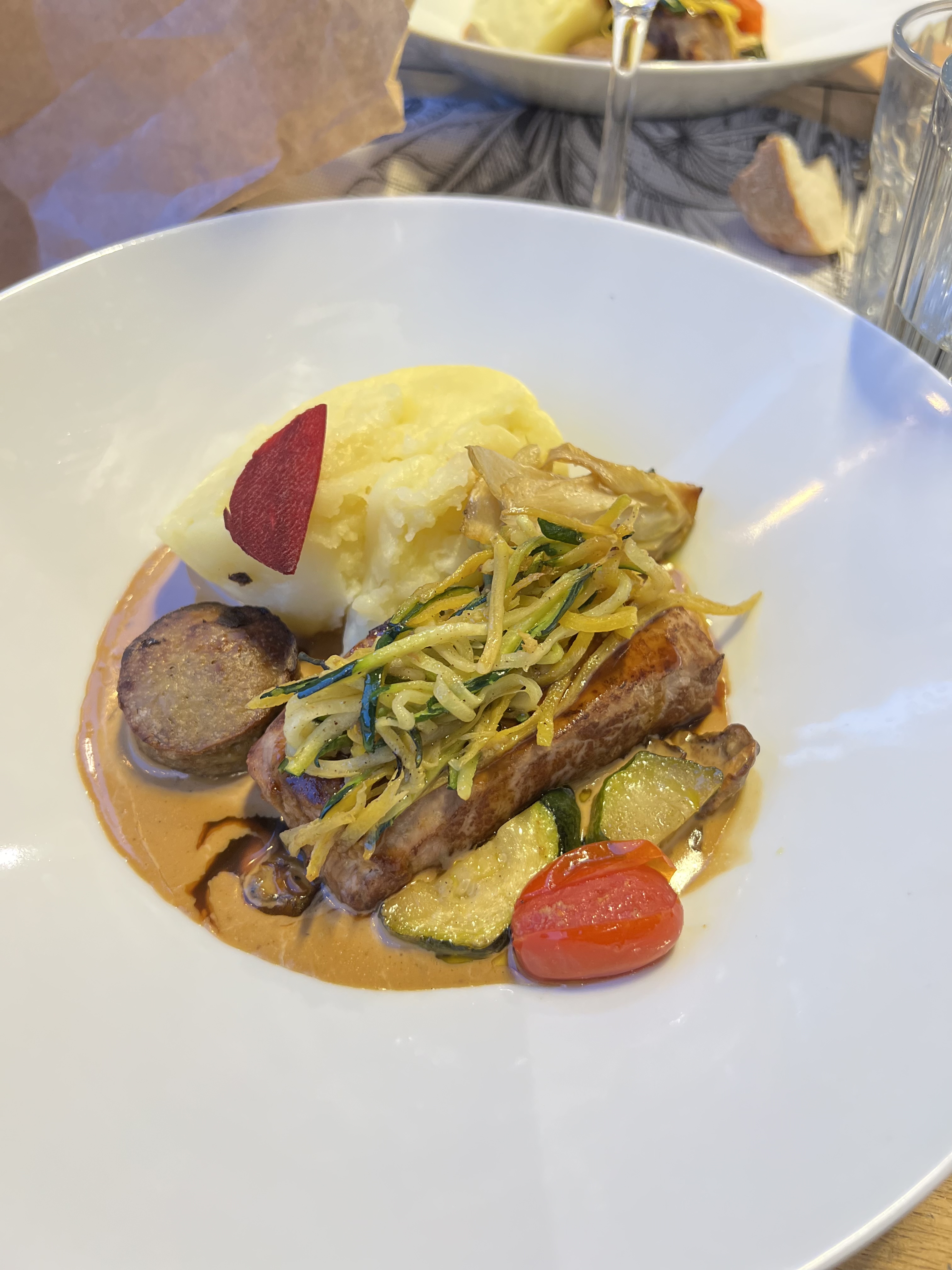 Super endroit pour déjeuner. Salade de fromage de chèvre et steak & rôtis, bière et vin. 59 € Bon service. J'ai ri lorsque le serveur est revenu en disant que le chef ne pouvait pas cuisiner le steak saignant - alors il s'est contenté de moyen - toujours délicieux et rare.
