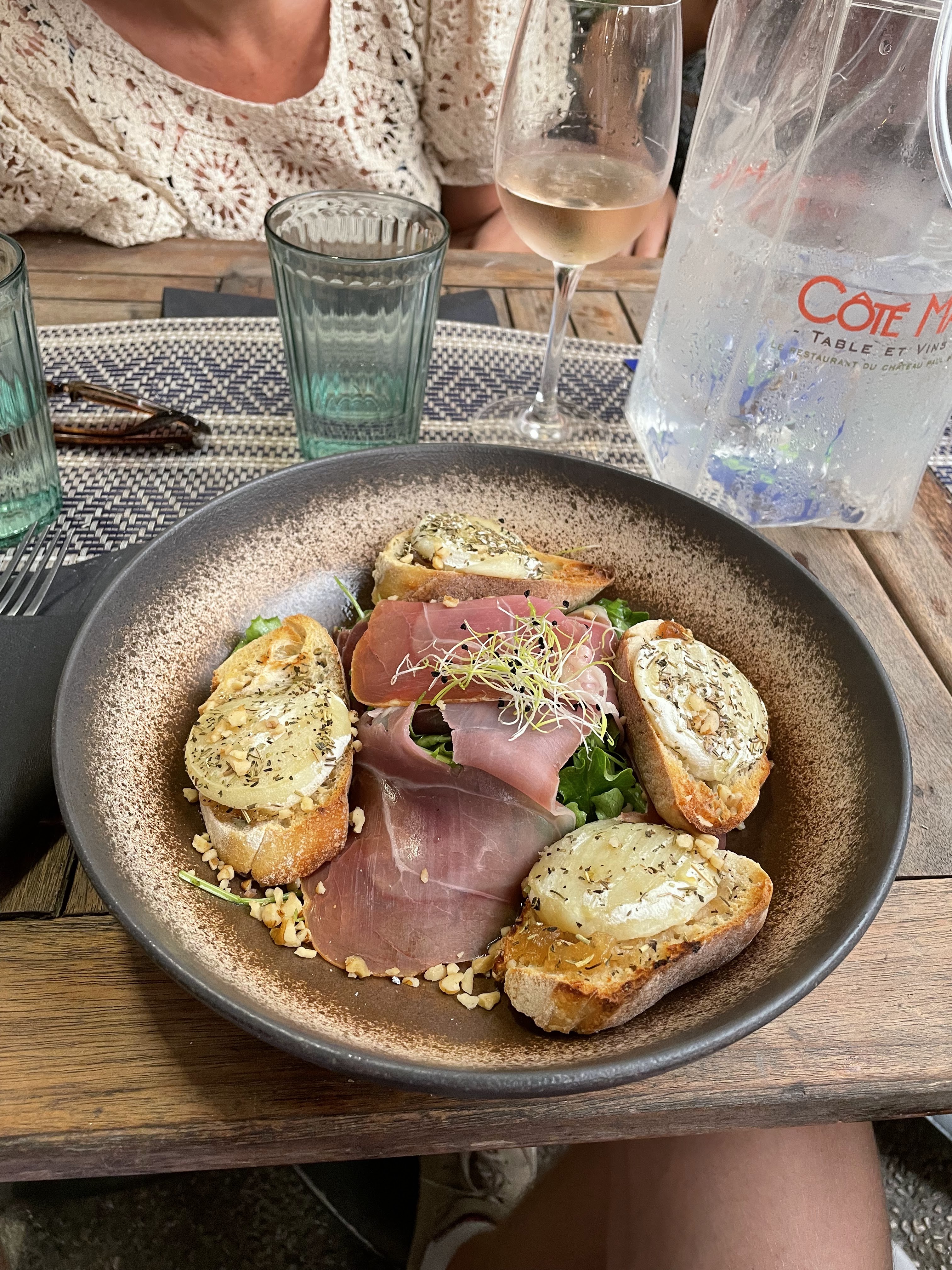 Un excellent emplacement sur la Tour Saint Jean et un excellent endroit pour manger, prendre un verre et regarder les gens. Nous avons été chaleureusement accueillis par Quentin et nous sommes assis dehors pour le dîner. Une bière locale, du gin et du toinic ont commencé notre soirée. Nous avons eu du foie gras fait maison, mariné au cognac et servi avec du confit d'oignons caramélisés et de la salade pour commencer - une portion généreuse et servie avec du pain frais. En plat principal, j'ai eu la salade de chèvre chaud, jambon, oignons caramélisés confits, miel et noix que j'ai adoré et mon mari a eu le bacon Classic Burger, Steak Charolais, Cheddar, Pommes de terre Grenaille qu'il a beaucoup apprécié. Le service était excellent et attentionné. Et des prix intéressants.