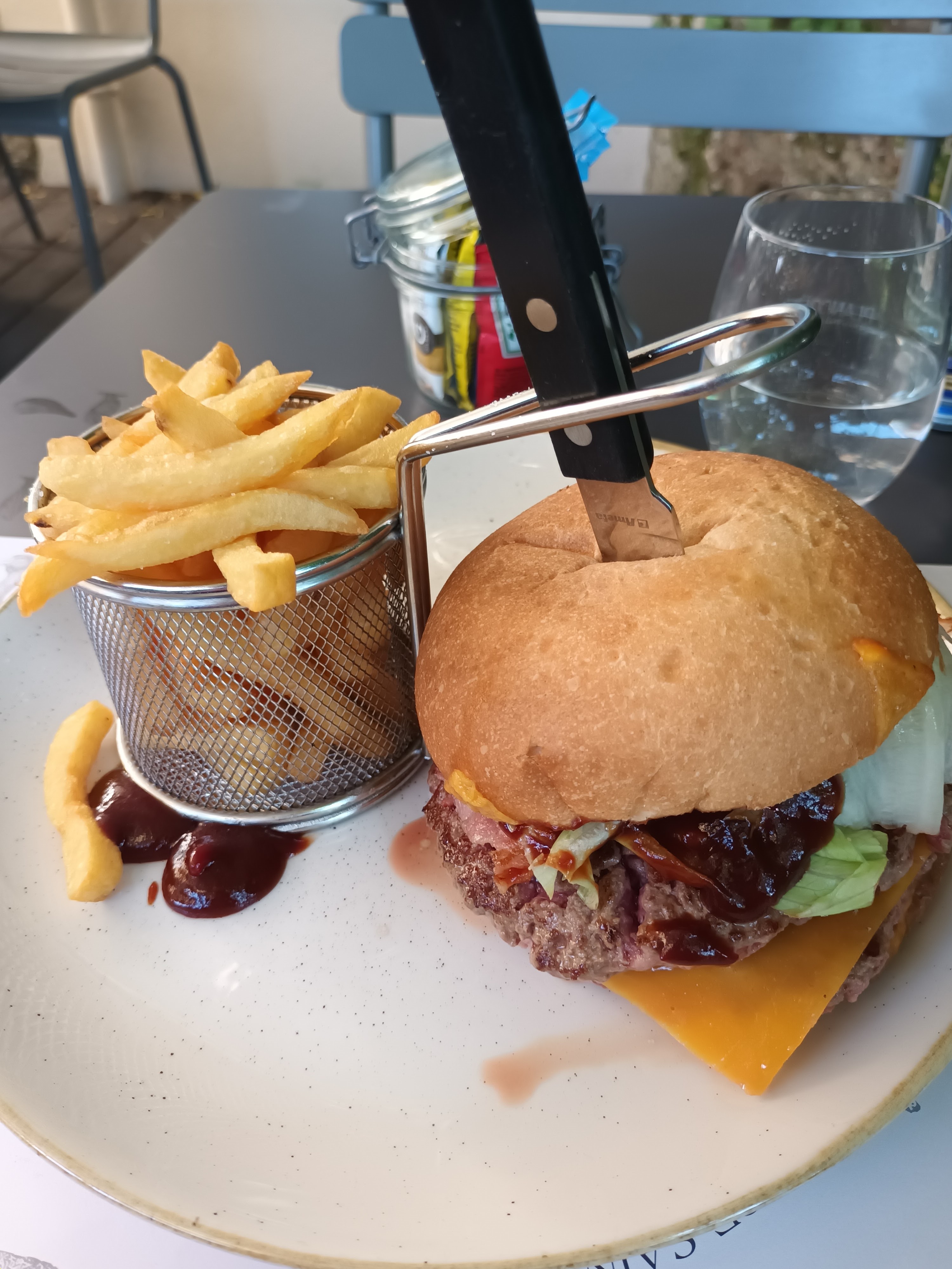 Grande et belle terrasse ensoleillée où les cocktails sont très agréables. Burger généreux et d'une belle fraîcheur. Enfants et chiens bienvenus. Personnel attentif, courtois et très sympa. Je recommande vivement ! (en revanche, peu de choix pour les végétariens)