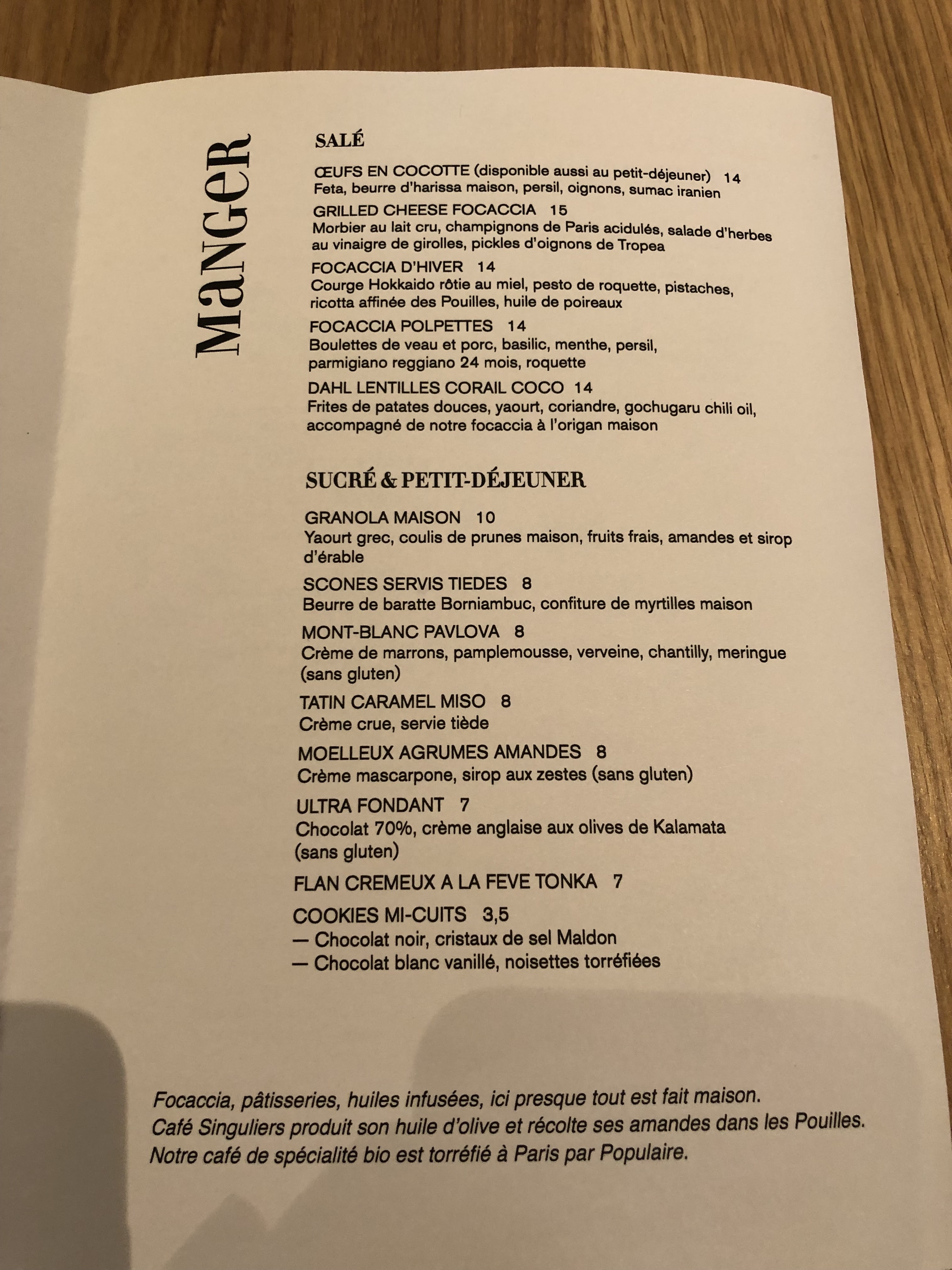 J’ai récemment déjeuné au Café Singuliers avec mon père et j’ai été impressionné par sa beauté. Le décor est magnifique et l’ambiance est chaleureuse et accueillante. Les plats étaient délicieux et très bien présentés. Mention spéciale pour la focaccia. Merci Victoire et toute l'équipe du café !