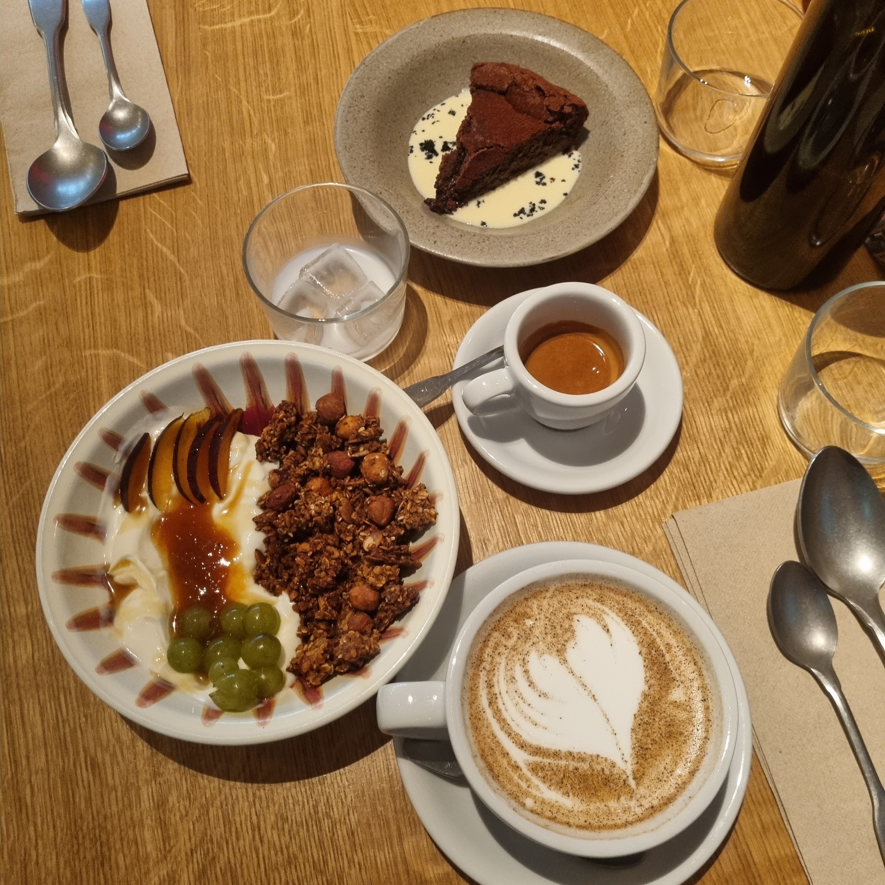 Bon déjeuner, dessert et café. Le personnel était attentionné et sympathique. Le café est beau et spacieux.