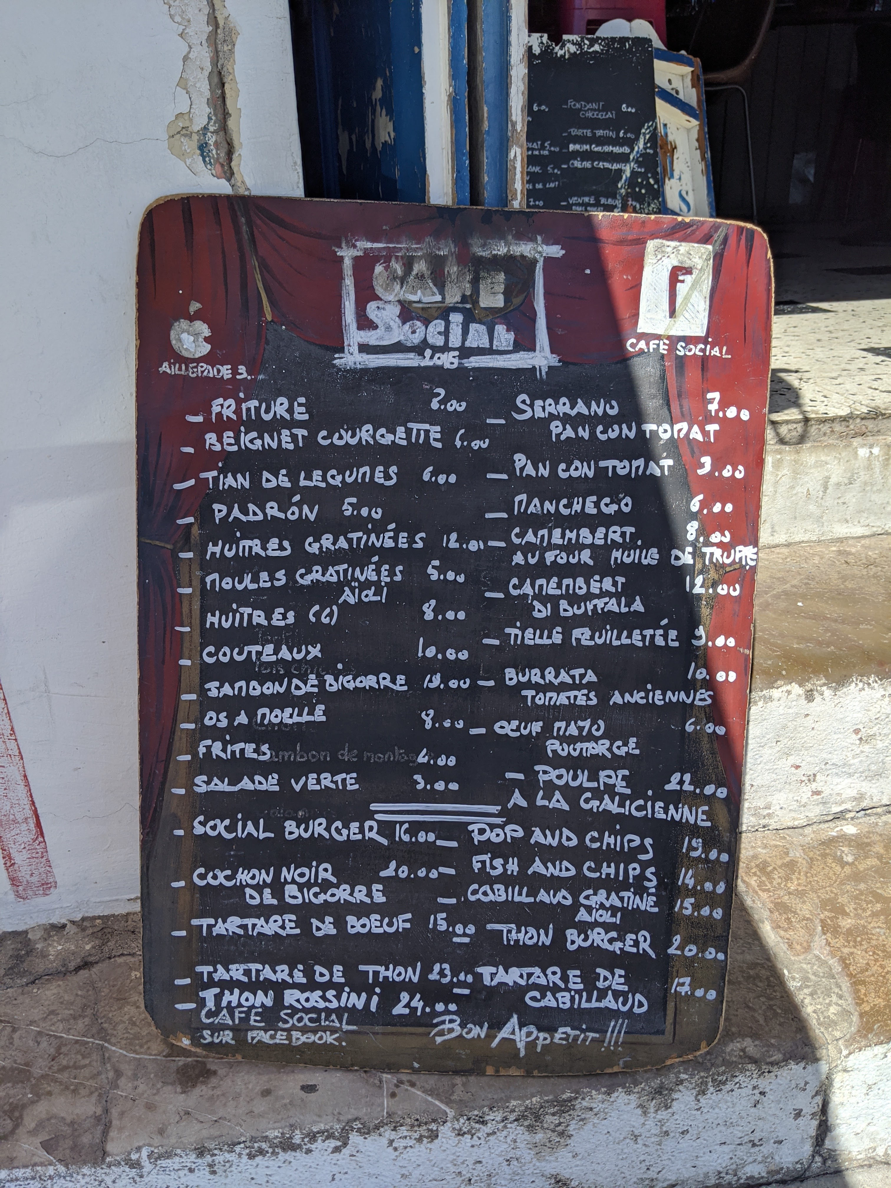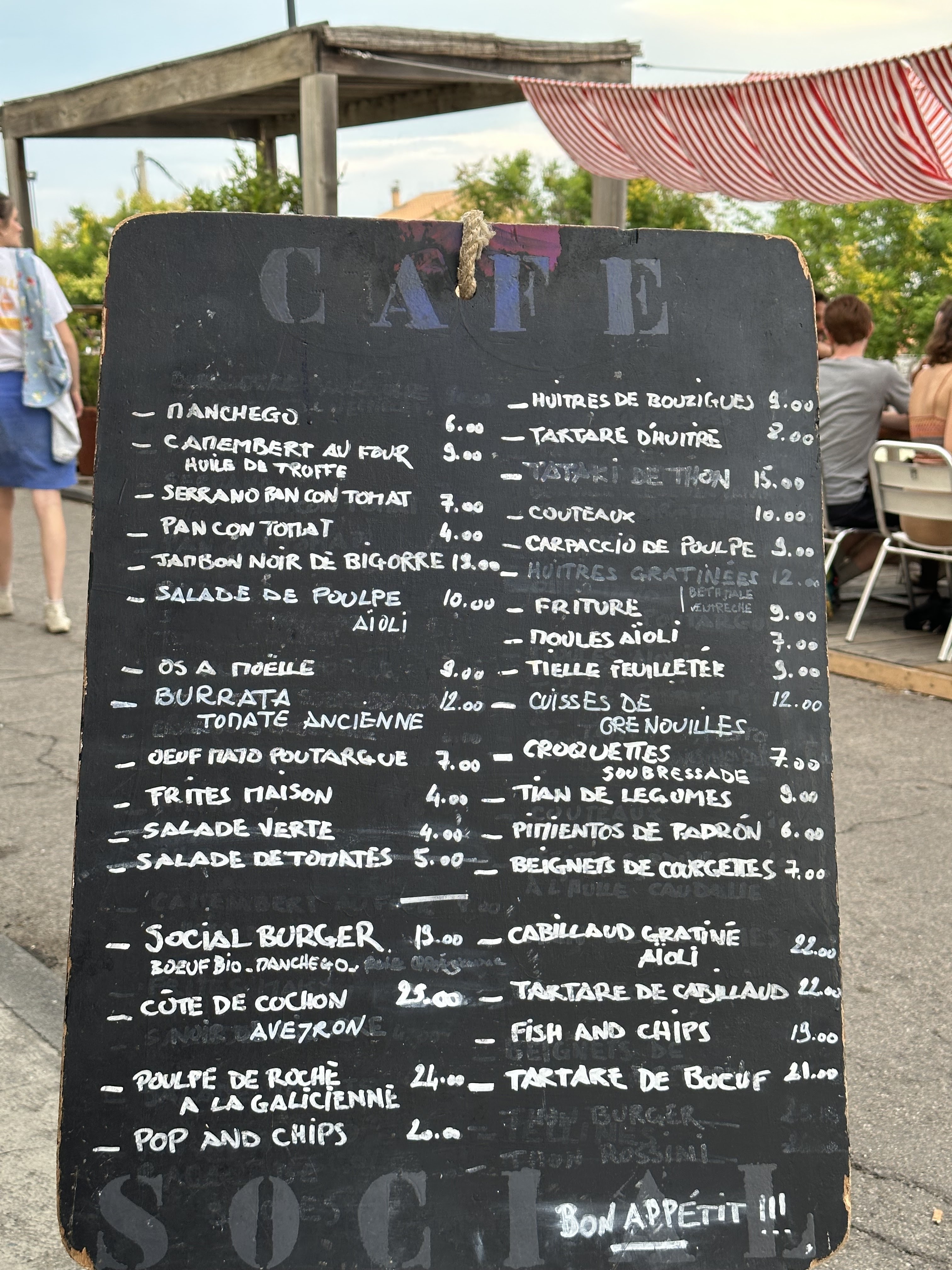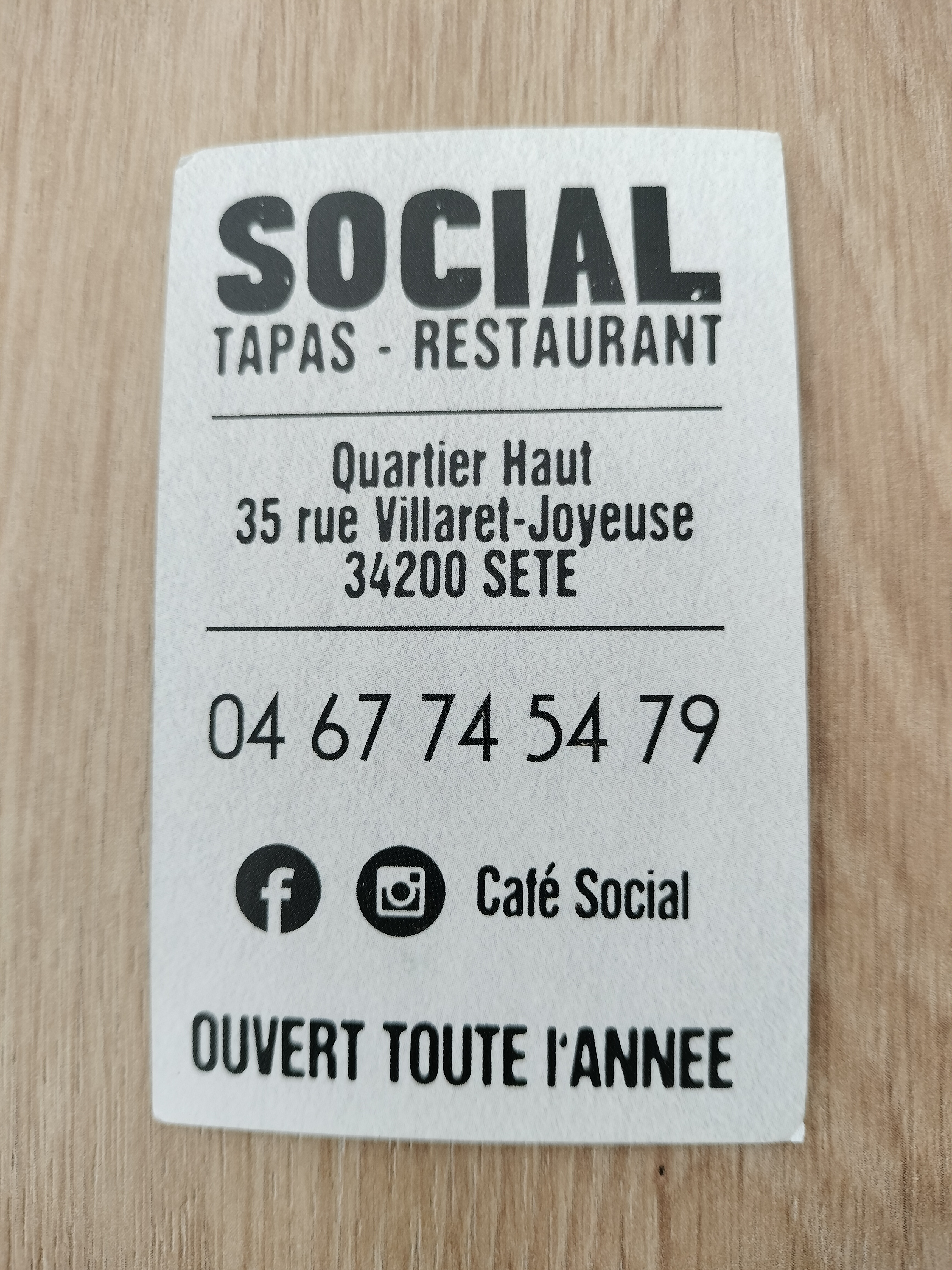 Aller déjeuner au Social c'est découvrir le quartier haut de Sète, quartier des artistes, surnommé le petit Naples. Grandes tables conviviales de 6 ou 8. On choisit sur l'ardoise, tout est fait maison. Nous avons partagé : pan con tomate , croquettes de chorizo, beignets de courgettes, planche de charcuterie corse et tortilla. Loin de nous pousser à la consommation, le patron nous invitait à modérer la commande. ( les tapas sont entre 3 et 5 €) Le social burger et la cote de boeuf ont régalé les amateurs. Nous avons gouté le bounty maison et le tiramissu. Même le pain était bon. J'avoue : le soir nous nous sommes contenté d'un fruit :-) Hâte d'y retouner !
