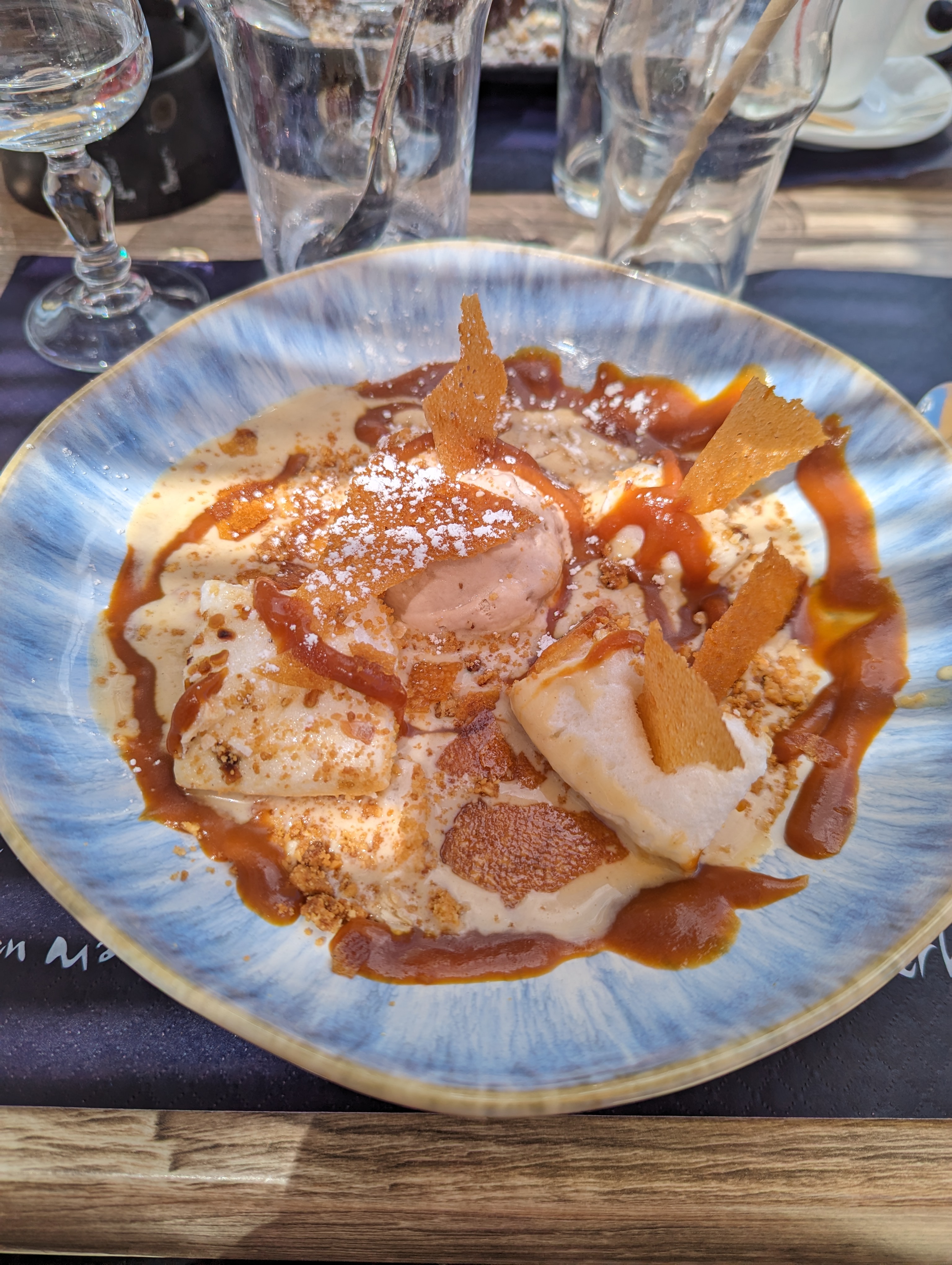 Gauffre chaude et froide - en même temps ! Donc probablement produit décongelé à 3 90 €. Un jus de citron pressé fait devant le client avec des citrons à température ambiante ; pour 5,60 € on aurait aimé un jus rafraîchi. Bref, très cher pour un service qui ne le vaut pas.