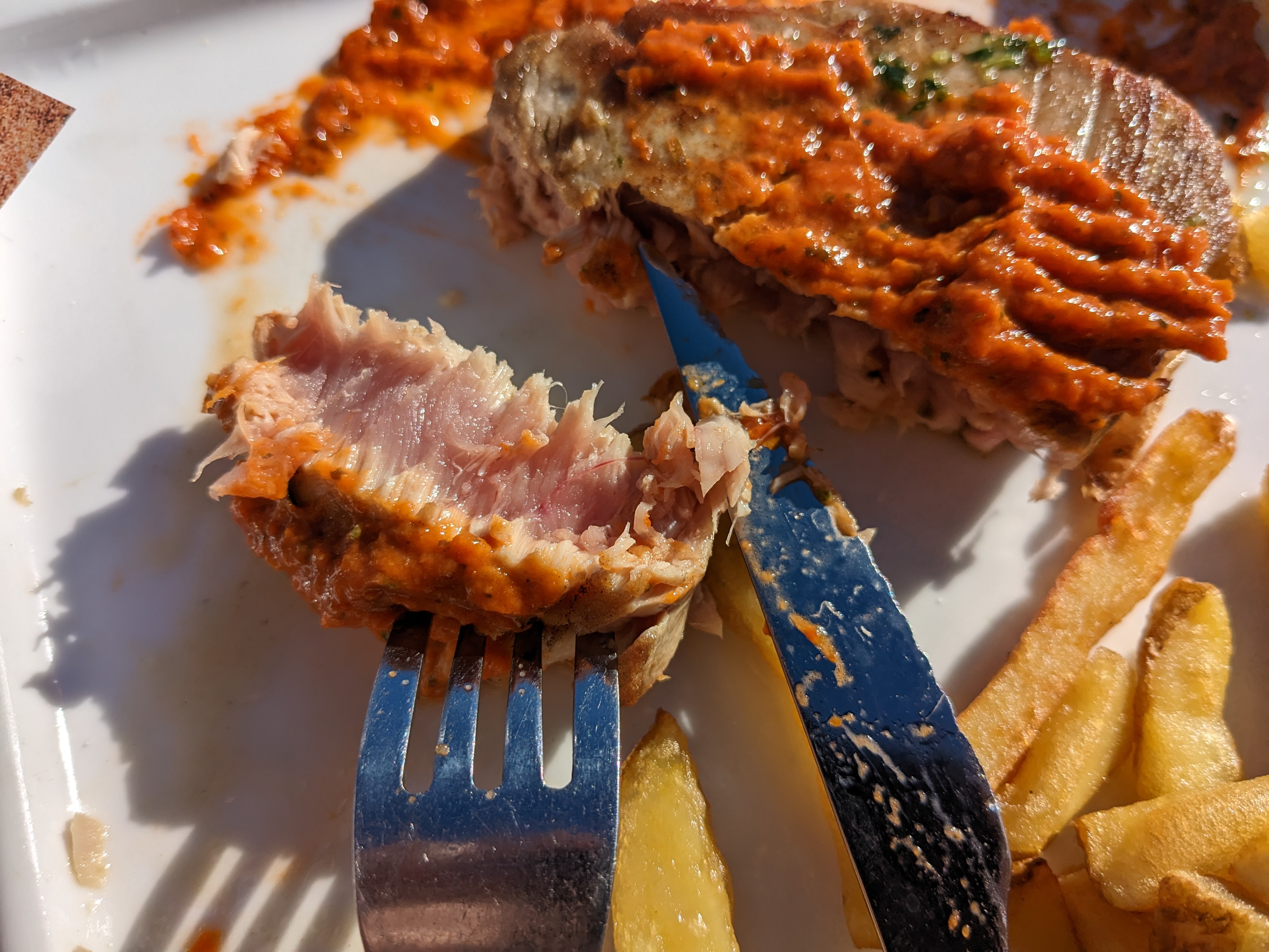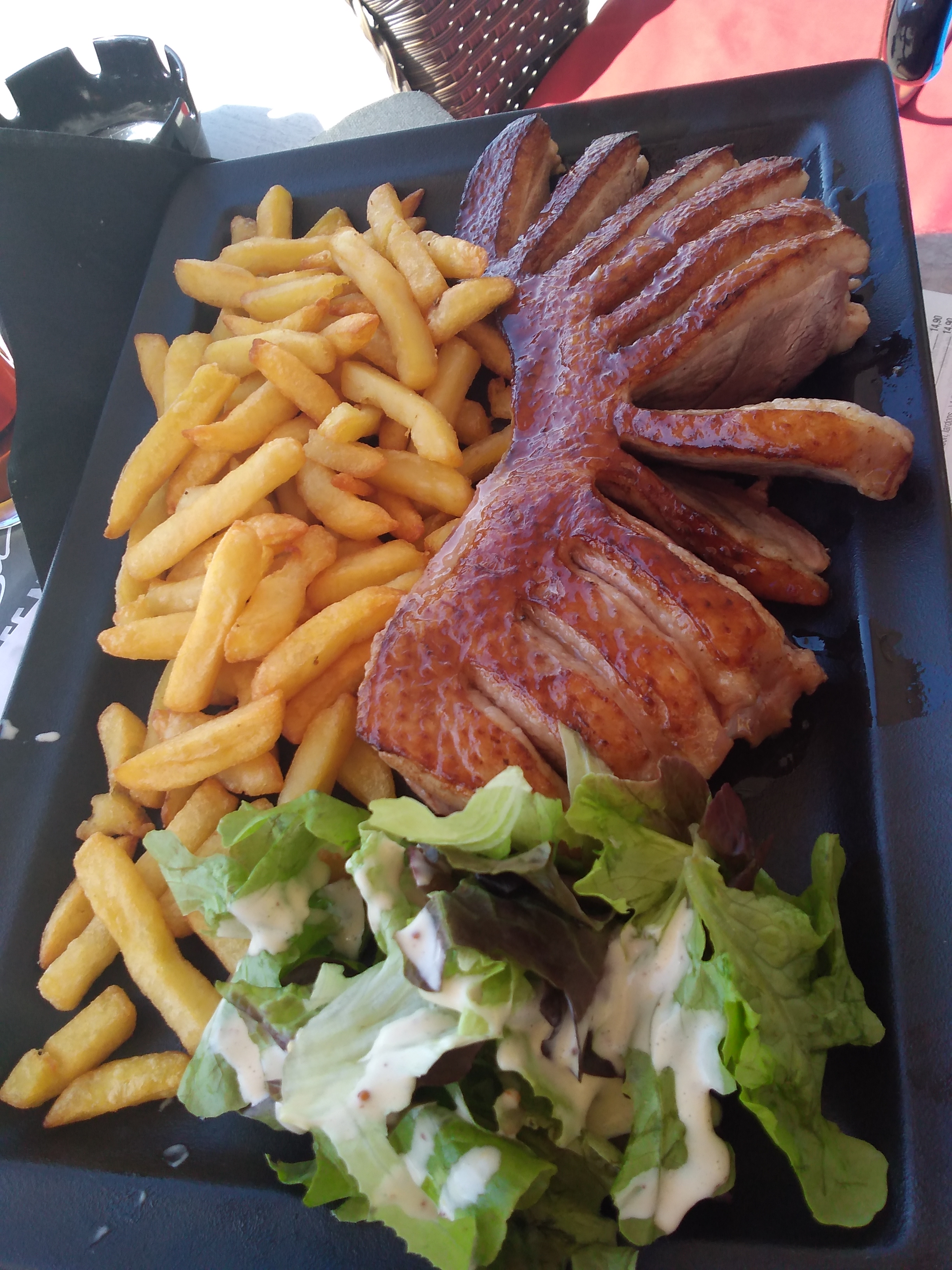 Bien situé, bord de mer, sièges confortables, plats copieux, tarifs raisonnables, dommage fermé le soir à cette époque en semaine on y serai bien retourné
