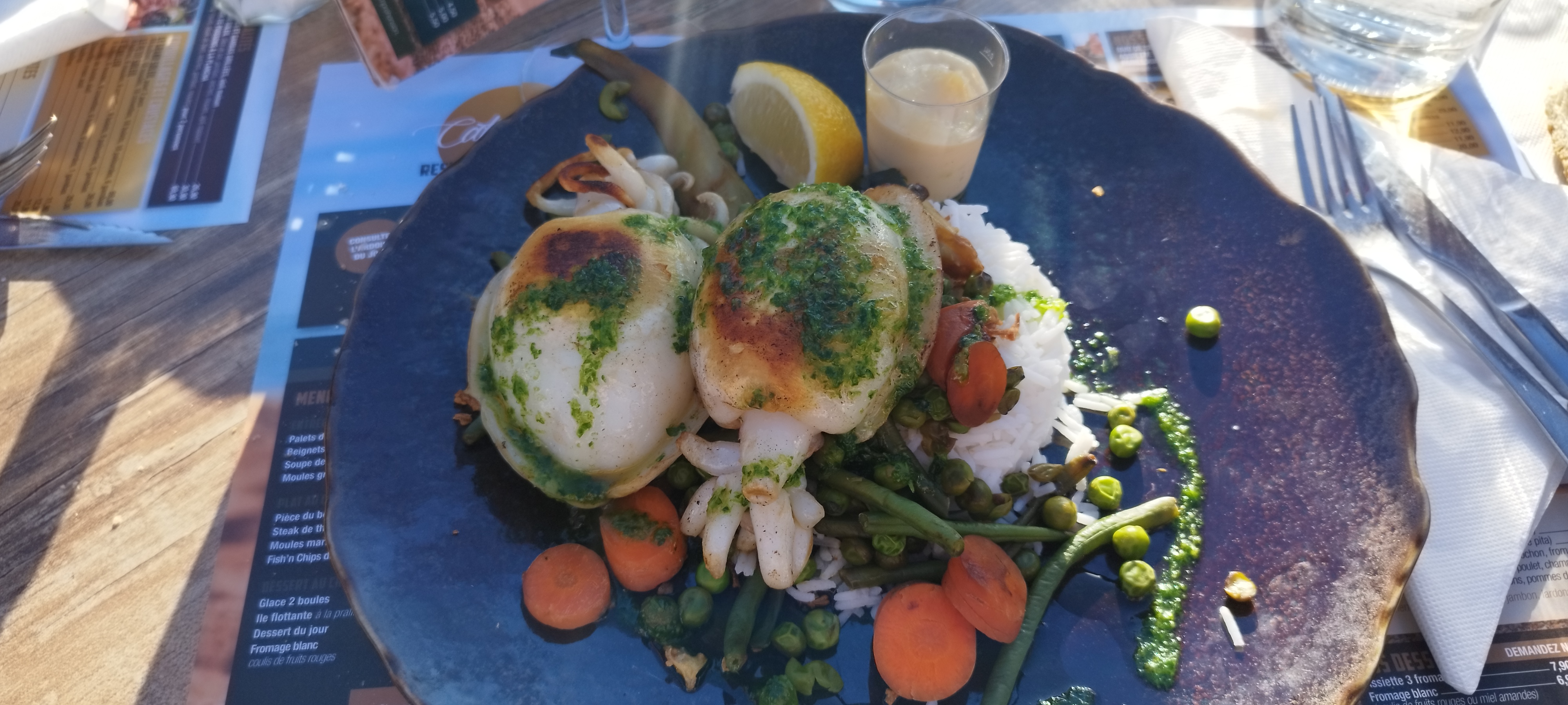 Restaurant où il est possible de s'arrêter également pour boire un verre. Pour ma part c'est la raison pour laquelle je m'y suis arrêtée à chacun de mes passages. Cet établissement est super bien situé puisqu'il est juste en face de la mer, donc cadre vraiment sympa. On ne va pas se mentir, si on veut de la tranquillité, être servi rapidement et avoir droit à l'aimabilité des serveurs, il faut éviter les jours de forte affluence. En effet, quand soleil et chaleur sont au rendez-vous, nous sommes les uns sur les autres, le service est long voir très long et parfois les serveurs ont laissé leur sourire à la maison. Alors ce n'est pas systématiquement le cas. Je pense que je compte en dizaine de fois mon nombre de passages dans ce restaurant. En règle générale cela se passe très bien et les serveurs sont très sympas. Lors de mes venues, j'ai commandé boissons et coupes glacées ou crêpes. Je n'ai jamais été déçue sur la marchandise. Les tarifs ont légèrement augmenté et je trouve ça un poil cher. Malgré mon expérience d'hier par exemple où j'ai dû attendre un bon moment que ma commande soit prise et également pour être servie ensuite, je reviendrai car je sais qu'il y a des jours meilleurs 😉 ----------------------------------- Petit avis supplémentaire depuis mon dernier passage. J'ai enfin eu l'occasion de tester le restaurant. Eh bien j'ai très bien mangé. C'était copieux, bon (allé peut être pas les meilleures moules marinières dégustées) mais mon estomac était satisfait. Côté tarif on reste toujours un poil cher mais bon inflation oblige. Mention pour le café gourmand qui était vraiment très gourmand 😊