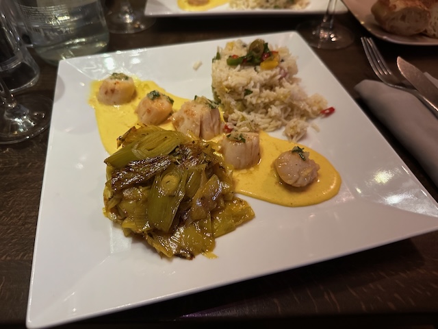 Première nuit à Paris et c'est ici que nous avons atterri. C'était un endroit TRÈS romantique avec un personnel très engagé. Ce doit être un lieu touristique car tout le monde autour de nous parlait anglais et le personnel était bien meilleur que mon français. La nourriture était bonne et le cadre romantique. Vous ne pouvez pas vous tromper dans ce restaurant français « au bout du fairway ». J'ai opté pour la Formule Ete - Plat et Dessert. En gros, un dîner spécial composé d'une entrée et d'un dessert. Pour l'entrée j'ai opté pour le Saint Jacques Au Safran. Les poireaux étaient géniaux mais les pétoncles n'étaient tout simplement pas bien préparés. Les pétoncles ont une tolérance TRÈS stricte à la cuisson et le pauvre garçon les a maintenus trop longtemps au chaud. Savoureux, mais pas ce que j'espérais. En dessert, j'ai opté pour la Tarte Fine Aux Pommes. C'était une très belle tarte aux pommes avec une cuillerée de glace pralinée encore meilleure. Nous avons également eu une bonne bouteille de Sancerre qui a agrémenté l'ensemble du match.
