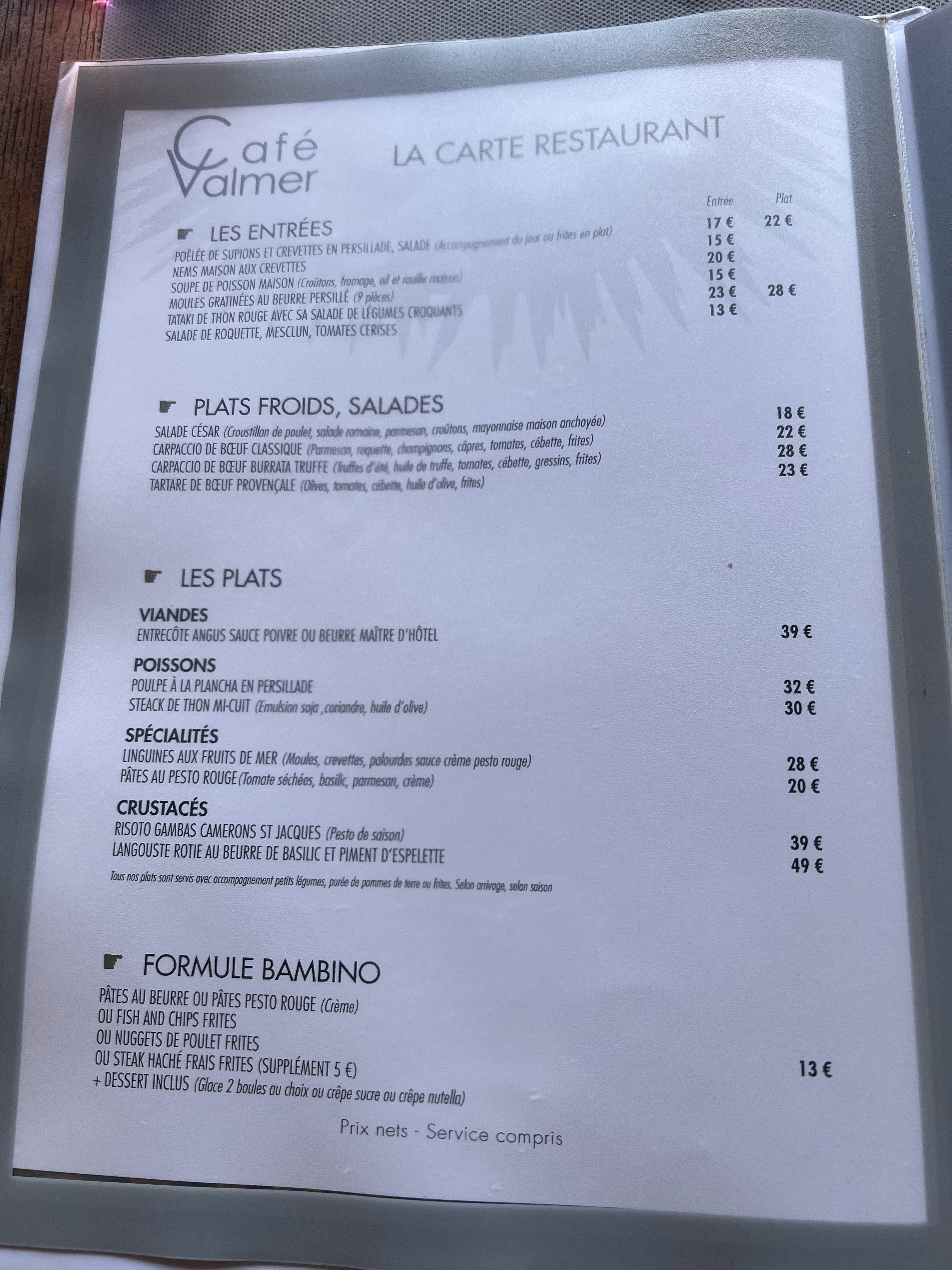 Sur les conseils d'amis mon épouse et moi avons mangé au Café Valmer et je dois dire sans aucun regret, les entrées, le plateau de fruits de mer au top et le dessert tarte à la figue, un régal, sans oublié les serveurs, merci à vous toutes et tous pour cette soirée.