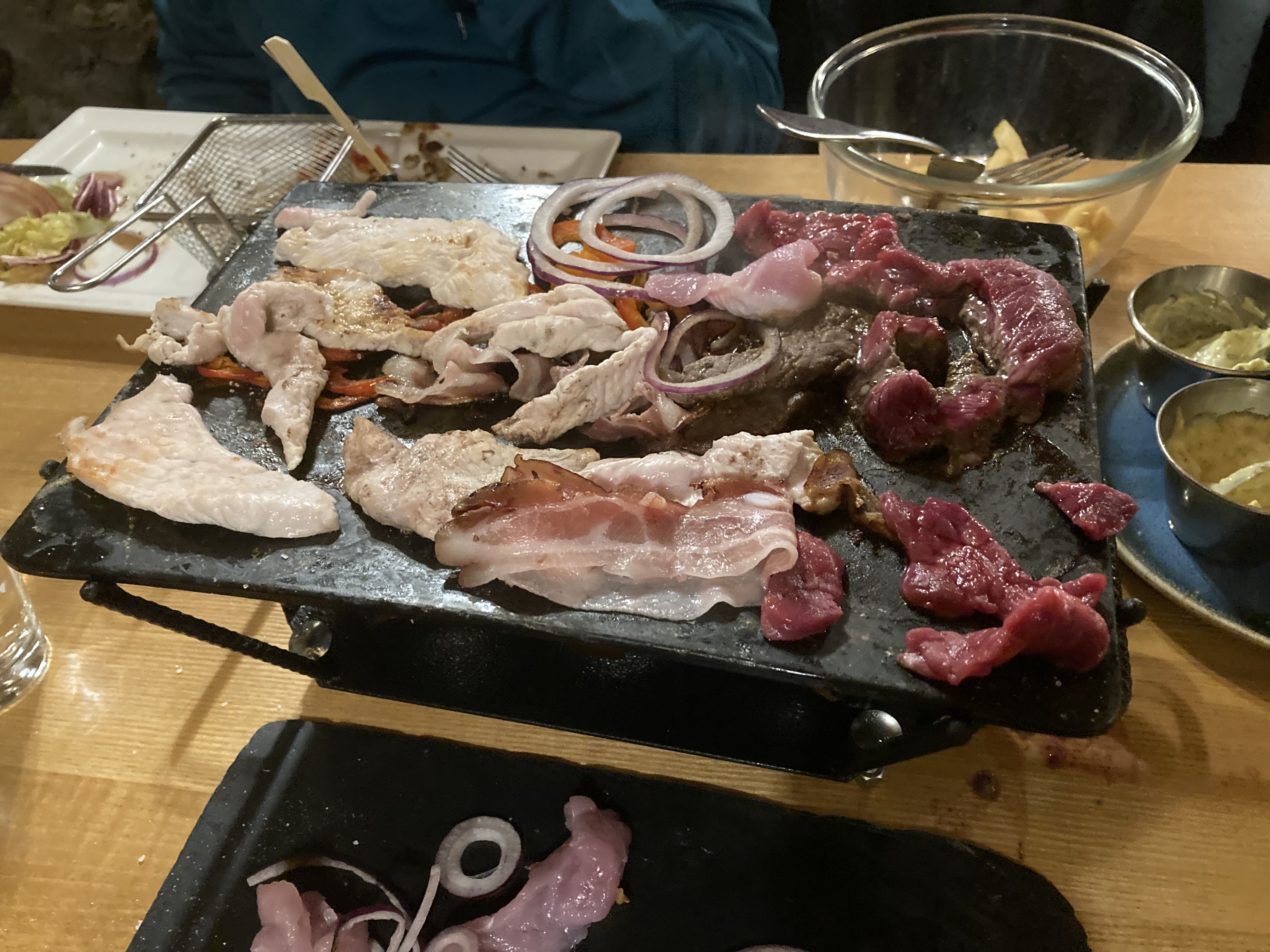 Très bonne pierrade mixte (poulet canard et boeuf) pour 2 : à tester sans hésiter. Servie avec frites ou gratin et salade mêlée. Juste ce qu'il faut. Je recommande !!