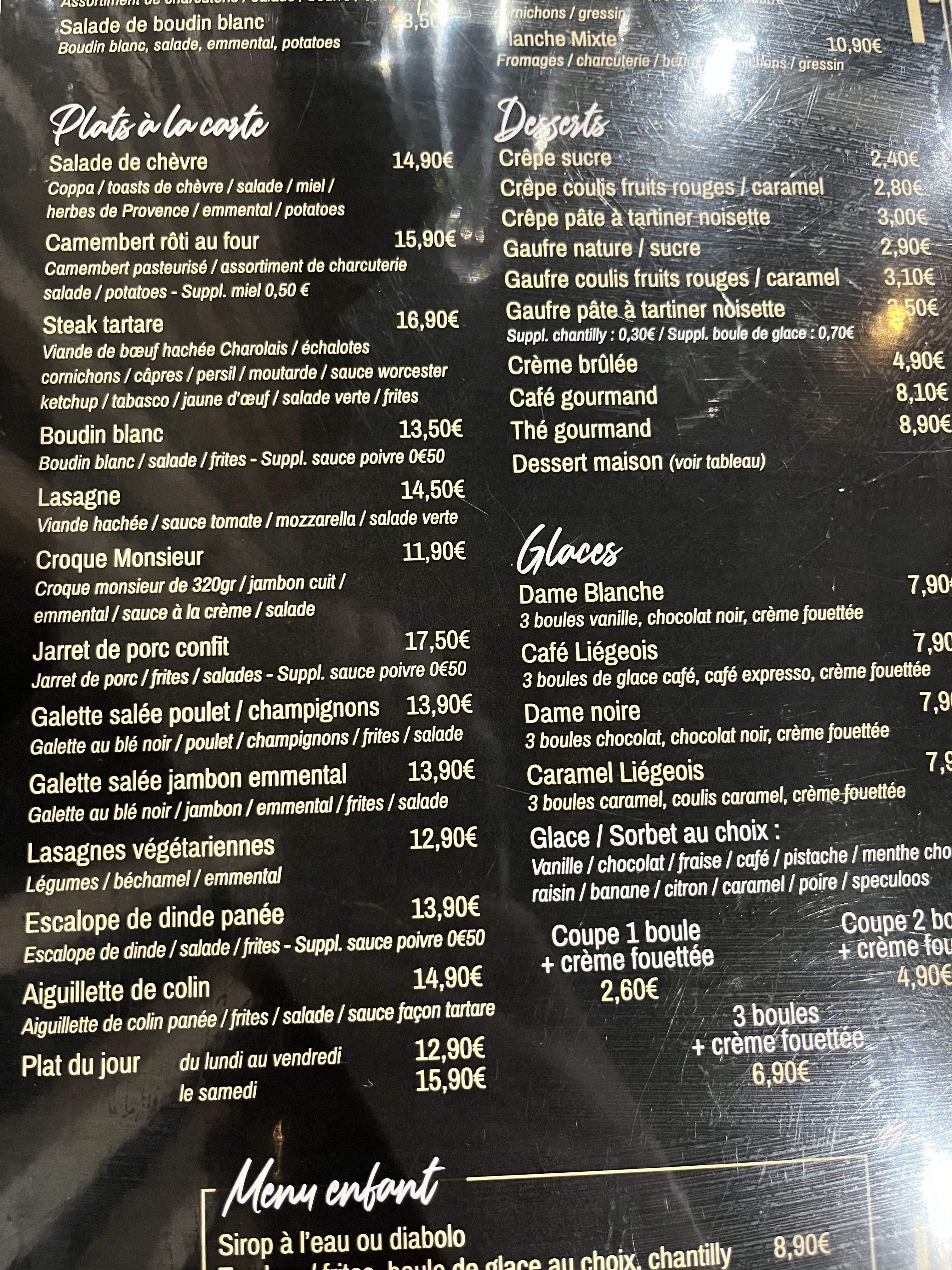 Je me suis restauré pour le plat du midi, Mon choix fut une crêpe salé au jambon emmental servie avec frites salades. Les plats laissent pensées à du tout prêt réchauffé, les frites sont dures, la crêpe avec beaucoup de sauce et de gros dés de jambon. Pour le dessert une crêpe au sucre, très bonne L’ambiance du restaurant est simpliste mais agréable et calme