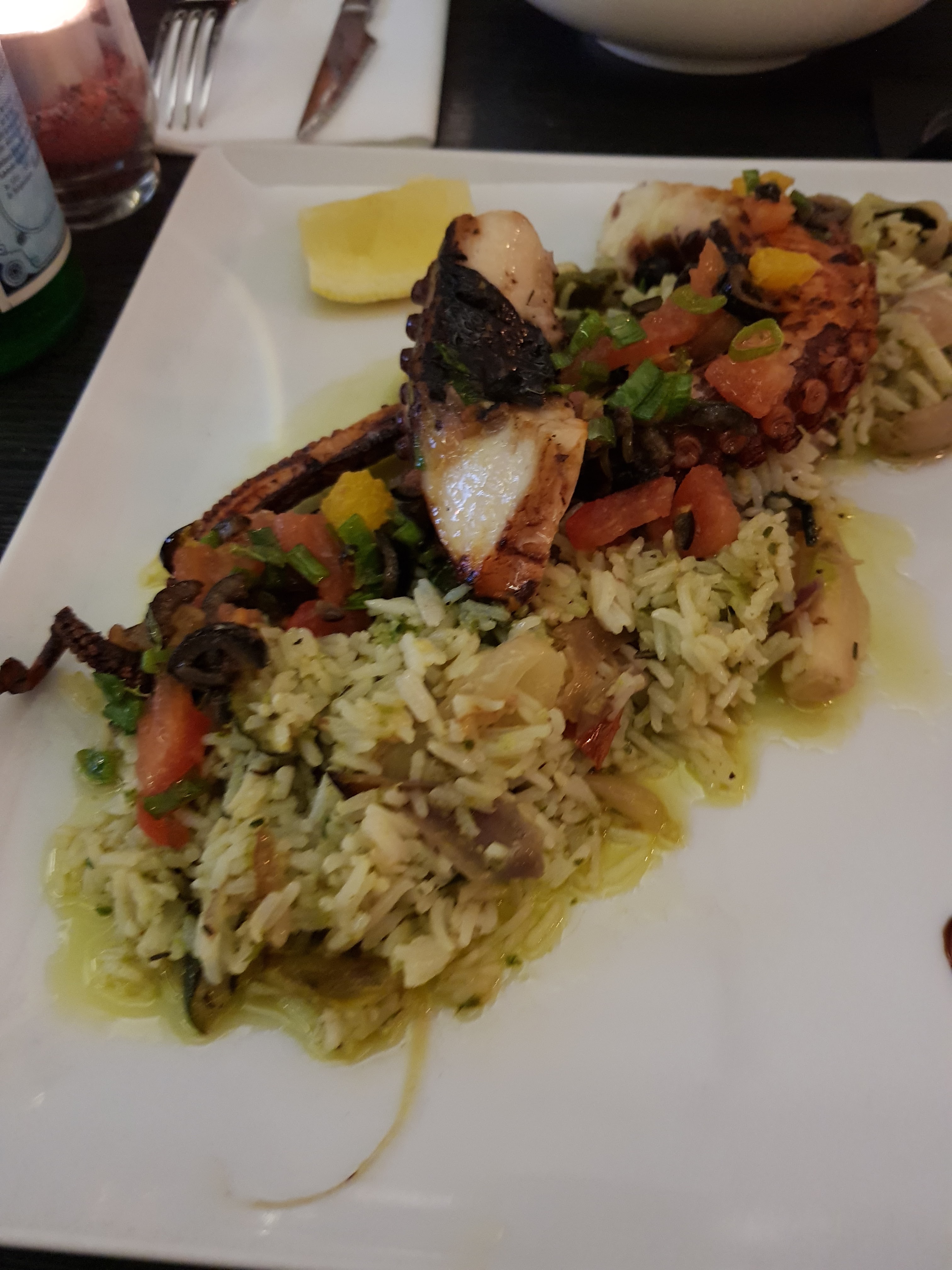 Poulpe grillé plancha riz ratatouille. Tartare de bœuf frites.