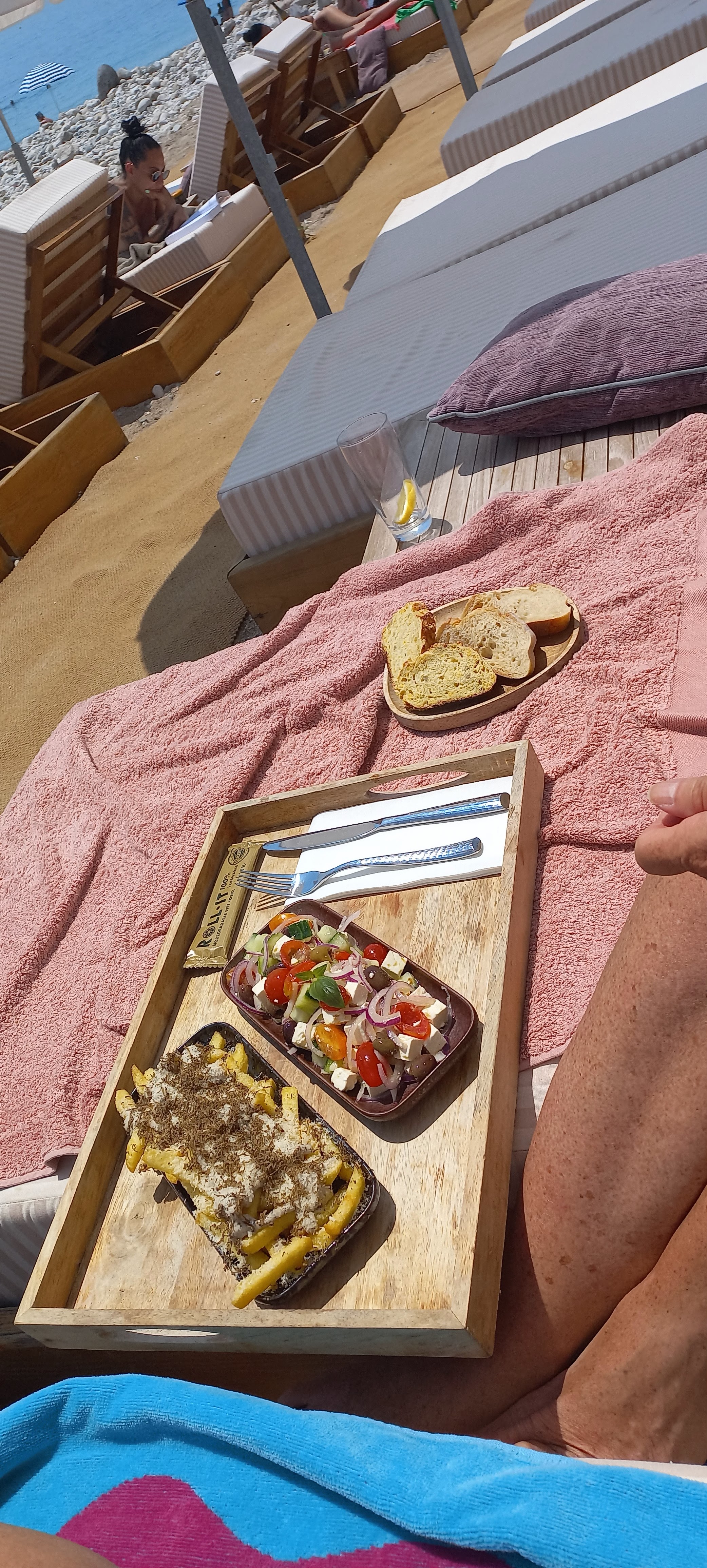 Super plage privée ! Nous avons été en semaine et nous avons pu avoir les transats à 20 euros par personne ! On nous accueille avec un petit jus de pastèque et une tranche de pastèque offerte une petite attention mais qui fait toujours plaisir ! 😀 On a bien mangé: minis baos excellents ainsi que les frites à la truffe Juste un peu déçue de la mini moussaka qui n’en était pas vraiment une pour moi Mais ça ne m’empêchera pas d’y retourner ;) Merci au plagiste super sympa ce jour là 😀