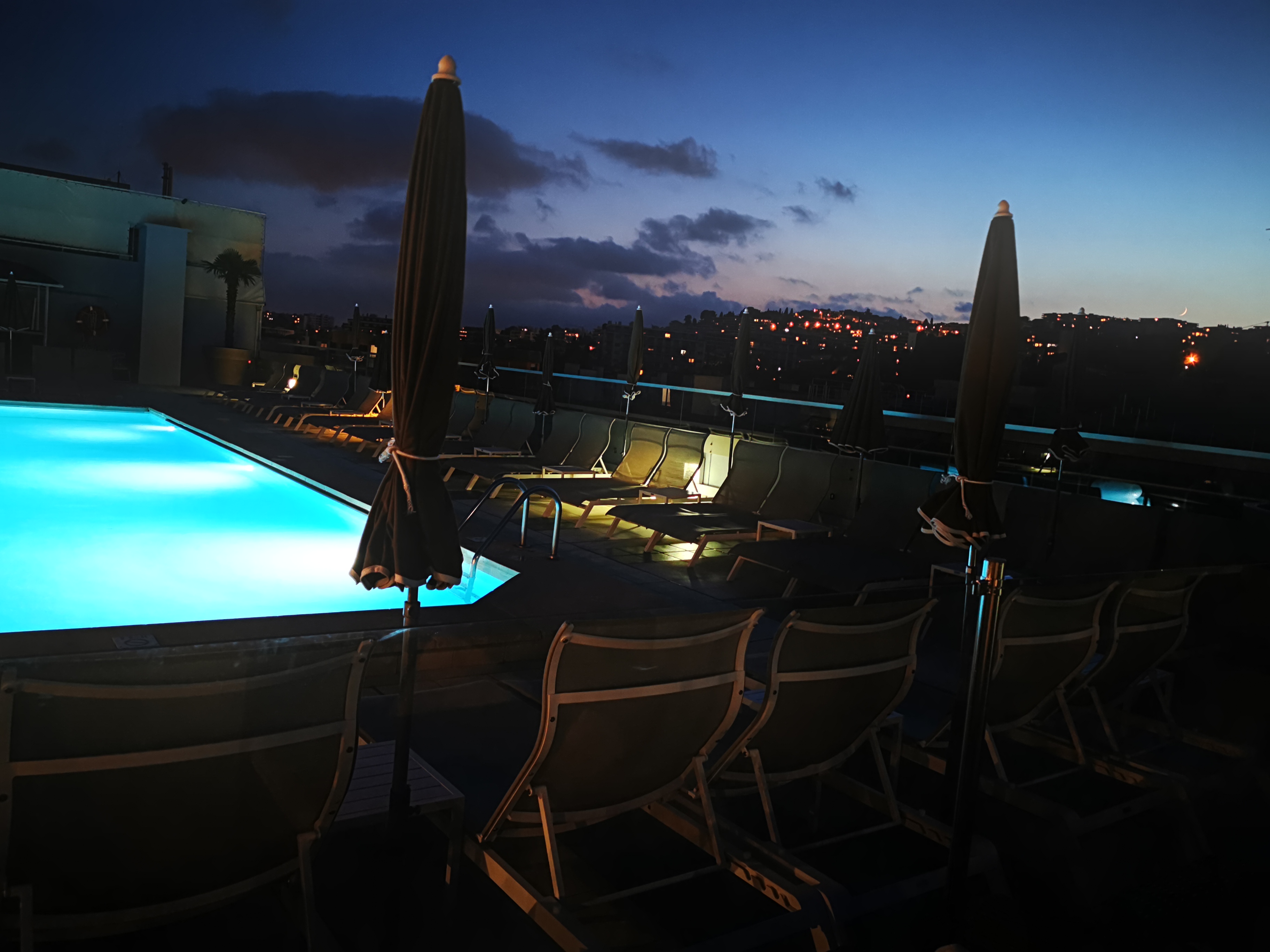 Nous réservons, on ne trouve pas notre resa, On nous installe au fond du côté piscine, face à un mur et les clôtures de la piscine… sympa la vue du roof top… Puis on commande une bouteille de champagne, limite fraîche et coupes pas propres. Le comble du comble, on nous amène l’addition au bout de 5’. Des frites jonchées au sol, pas très propre tout ça.