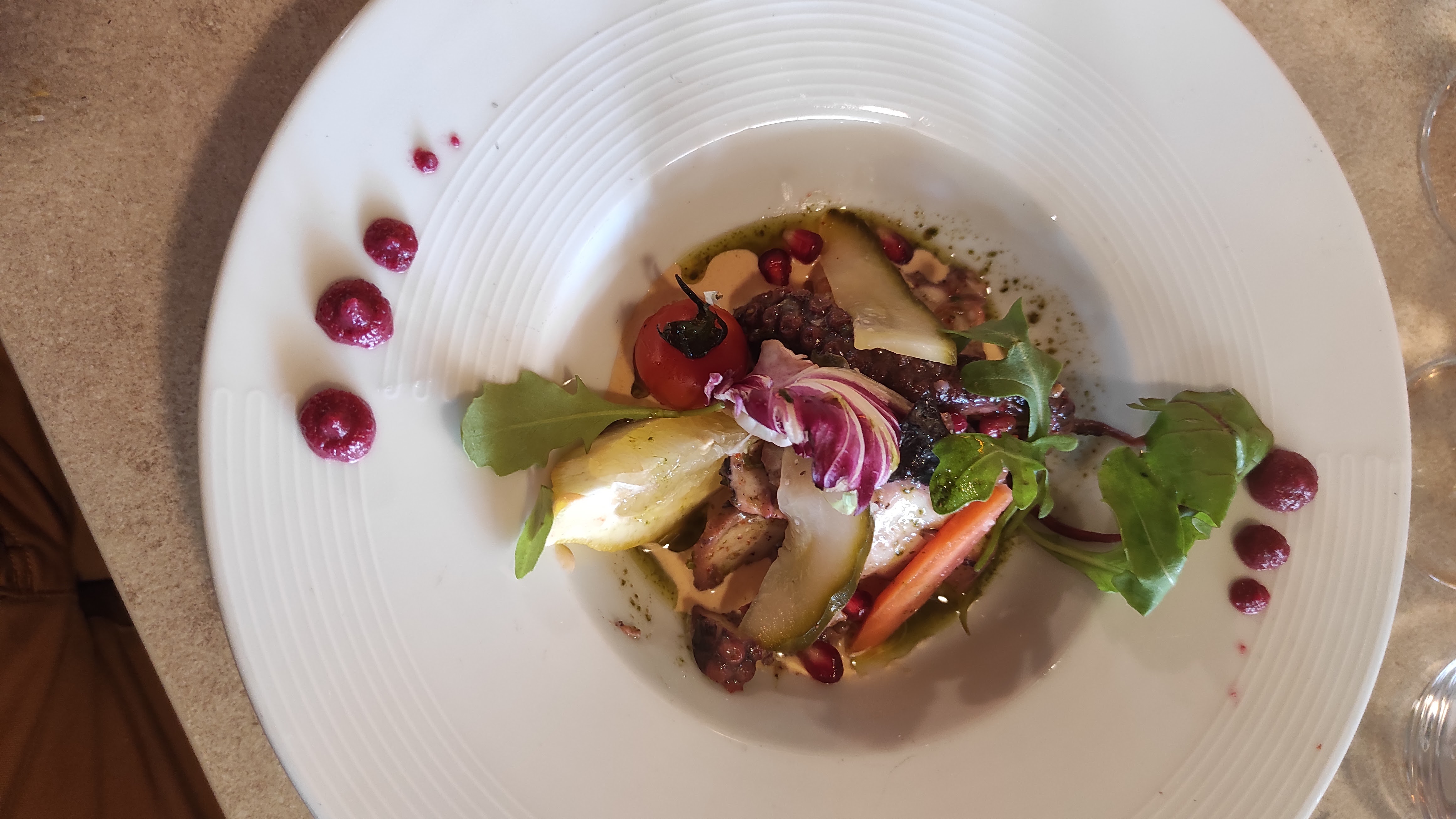 Cadre bien plats très bon mais pas assez dans l'assiette le prix y est mais alors la quantité au secours 10 euro le verre de vin plus dépouillé que rassasié félicitation pour le chef il faut reconnaître son talent mais je n'y retournerai pas