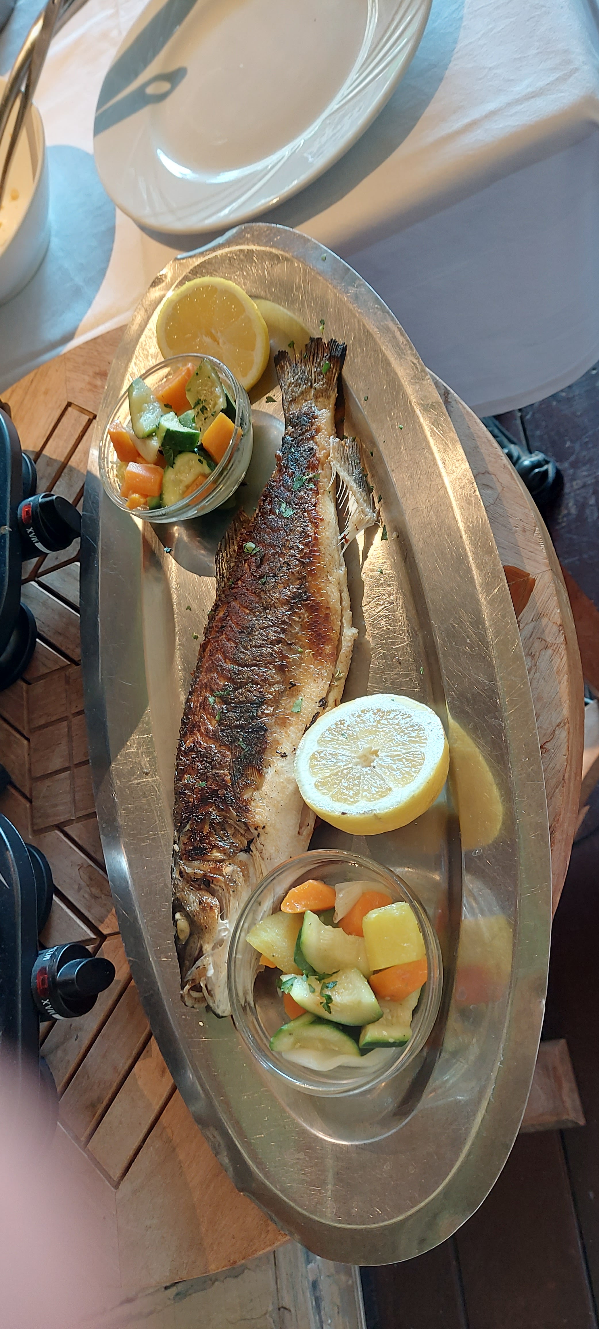 Cadre magnifique, la daurade délicieuse. Dommage que le service n'est pas à la hauteur des lieux. On nous a proposé de venir à 21h pour une fois sur place nous presser car la cuisine ferme à 21h30.
