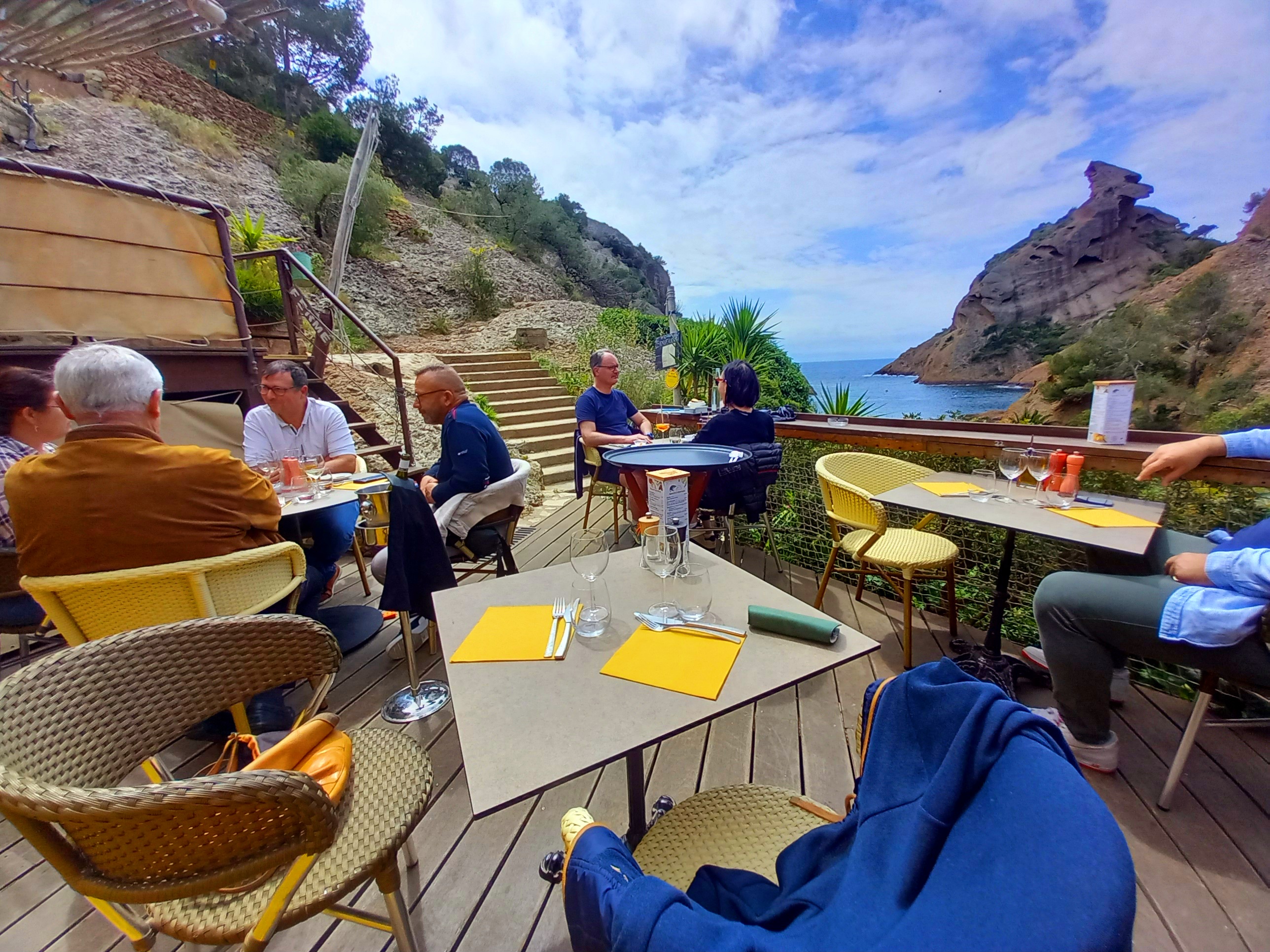 Vue magnifique sur la calanques de figuerolle repas excellents je recommande la souris d'agneau tarifs corrects Petits bémols parking tout en haut et à rarement de place ...descente dangereuse car terrain très glissant mais la vue et le restaurant valent le coup !