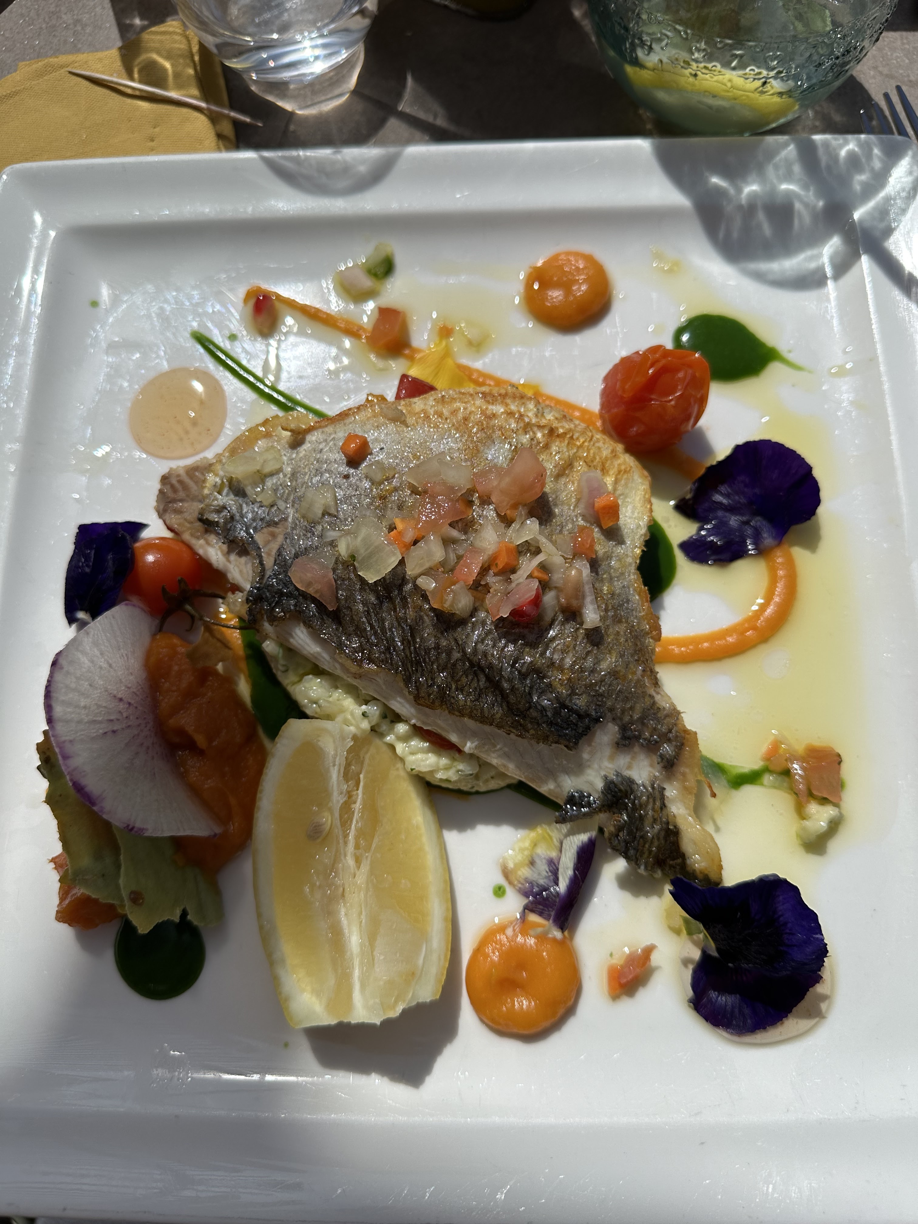 Les tomates cerises qui se baladent dans l'assiette en guise de décoration n'ont aucun intérêt pour le plat... C'est pour faire un peu de volume a mon avis. Le poisson de mon mari, n'avait aucun goût... Je suis venue il y a quelques années et dans mes souvenirs les plats étaient meilleurs.... Après il y a une belle vue...