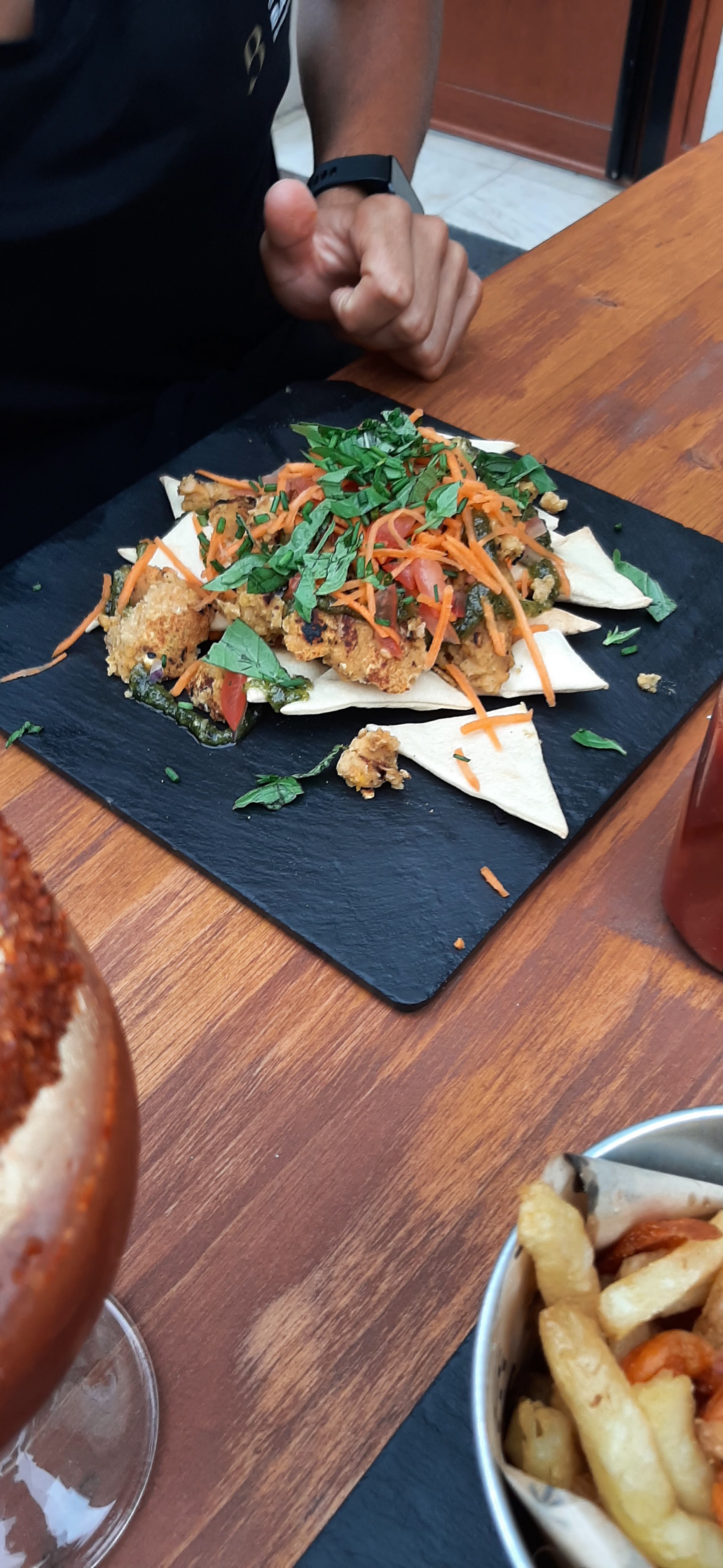 Sur le papier et avec les avis, c'était tentant, avec des alternatives vegan qui plus est, que nous avons tentées. L'accueil et le service au top, c'est jeune, cool, friendly, super musique au passage et les écrans avec images de surf, on est bien dans l'ambiance. C'est dommage car c'est dans l'assiette qu'on trouve le hic. Le guacamole est pas mal mais les tortillas qui semblent maison ne sont pas ouf et surtout, elles sont déjà plantées dans le guacamole, donc ramollies, donc on finit par manger à la petite cuillère. (Suffit de les servir à côté 😉) J'ai testé le burger vegan, avec steak végétal Haricots rouges & betterave. Ça semble cool mais c'est mal élaboré car au final, le steak ne tient pas du tout... C'est de la purée. Il faudrait travailler sur un liant. Ça a fini en gloubiboulga dans mon assiette. Le + c'est quand même de pouvoir composer son burger. J'ai adoré les frites, heureusement, c'est bien le minimum qu'on puisse attendre d'un restaurant. Je pensais finir sur une bonne note sucrée avec un brownie, classique, inratable... Et bien non, là, j'ai un peu de mal à comprendre je dois dire. Une coupelle arrive, remplie de chantilly (qui ne semble pas maison) Ma vision de la chantilly à outrance dans la restauration, c'est comme la salade verte. On comble un vide, un manque de savoir-faire. Et là, ce ne sont pas les qques bouts de brownies rikiki noyés dans cette chantilly qui vont sauver ce dessert. Navré la team, faut revoir ça. Déjà il faut servir un vrai morceau de brownie et contentez vous de proposer la chantilly comme une option. Après, on a quand même eu le droit à un digestif, ce qui est très sympa. Bon, on nous parle d'un rhum arrangé...à quoi je ne sais pas ?... j'ai eu le sentiment de boire un rhum blanc assez banal mais l'intention était là. Surprise finale, on a quand même eu le droit à un second digeo une fois en caisse. Notre déception sur le repas était peut-être palpable. En somme, tout au top, sauf la bouffe, c'est dommage pour un resto. Mais ça peut se rectifier 😜