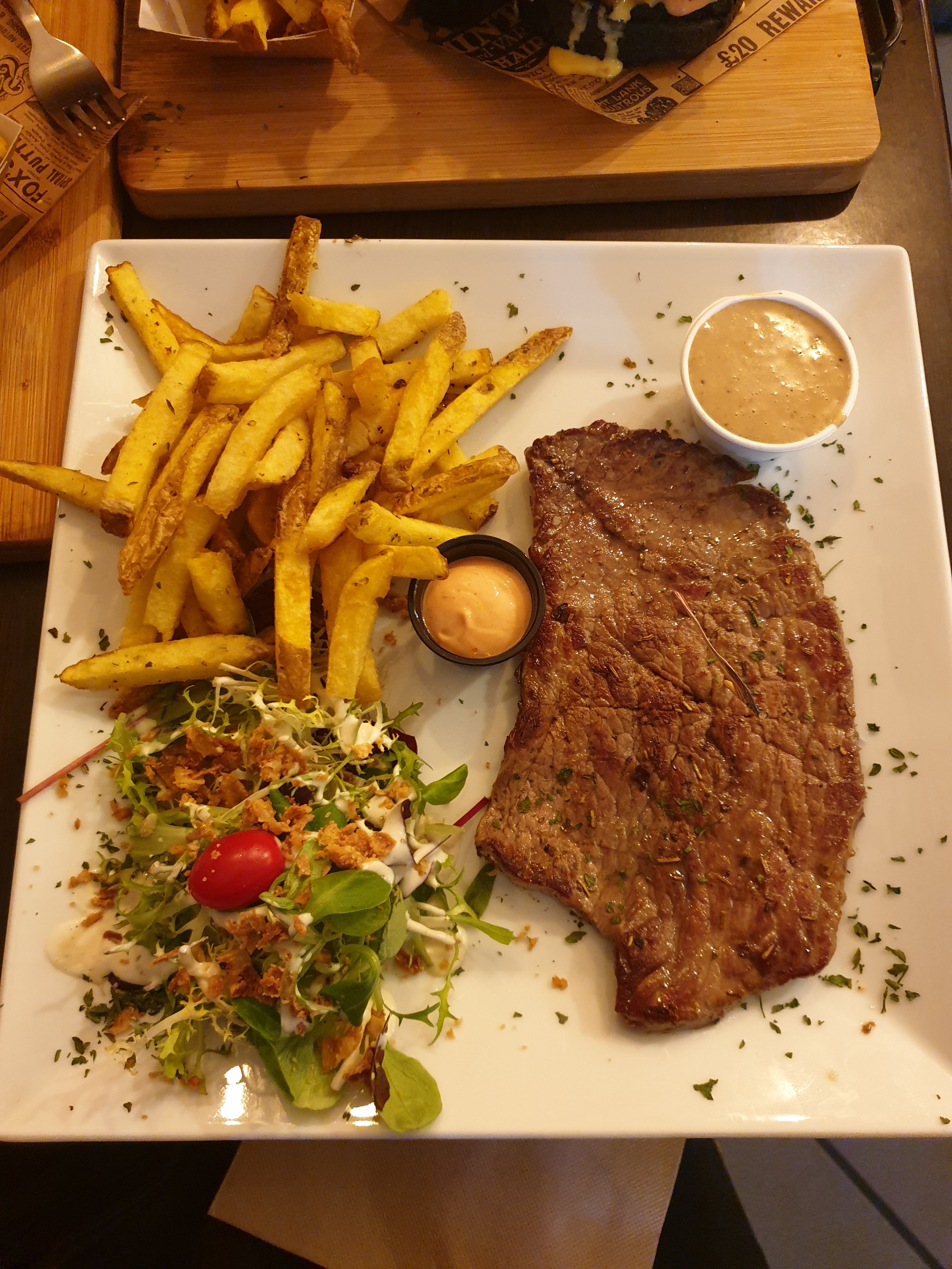 Très copieux, frites fraîches, viande fraîche , servi rapidement lieu très agréable et confortable. Prix très correct et franchement meilleur qu’un fast-food !! . Ne pas hésiter !!!