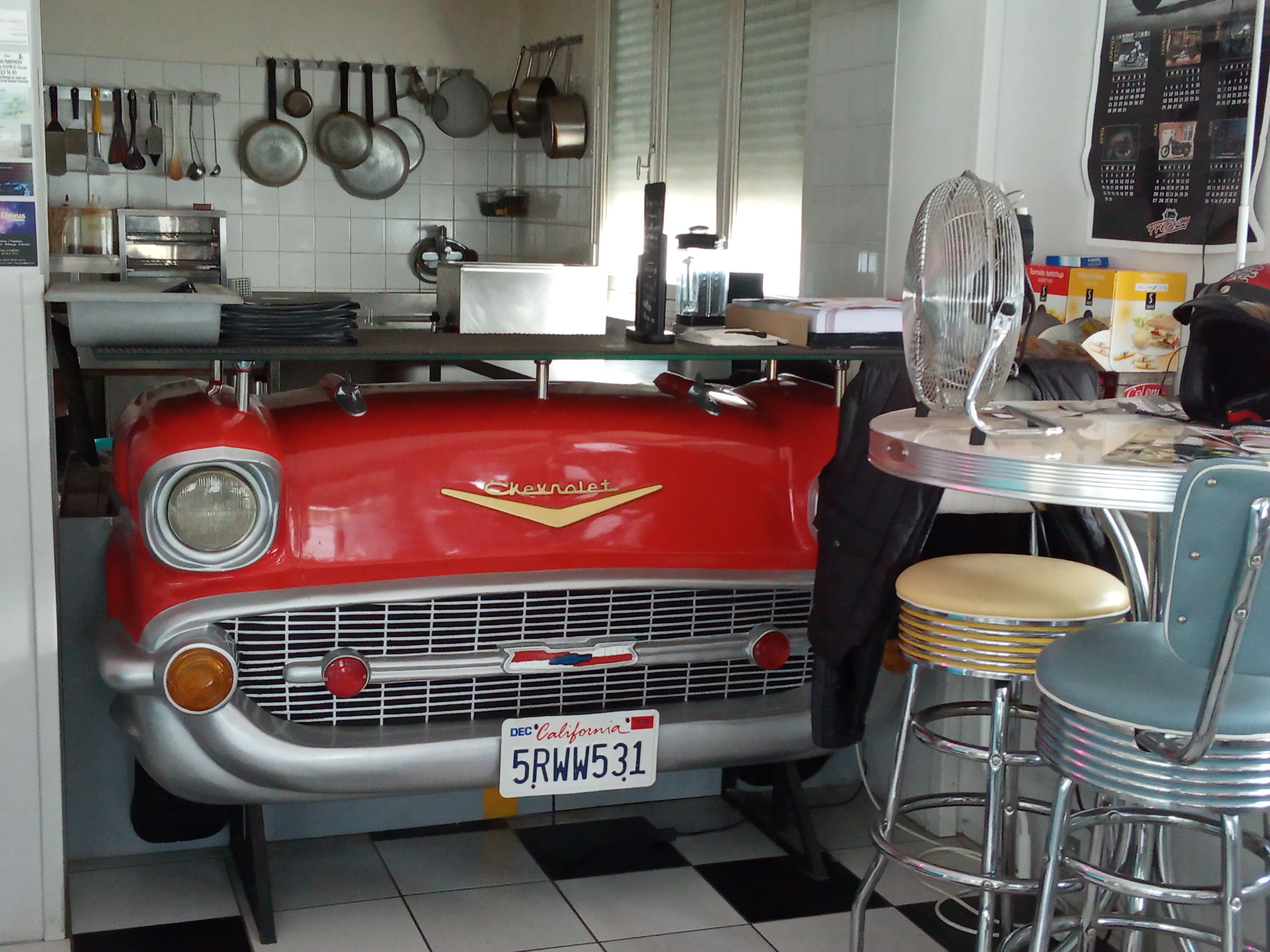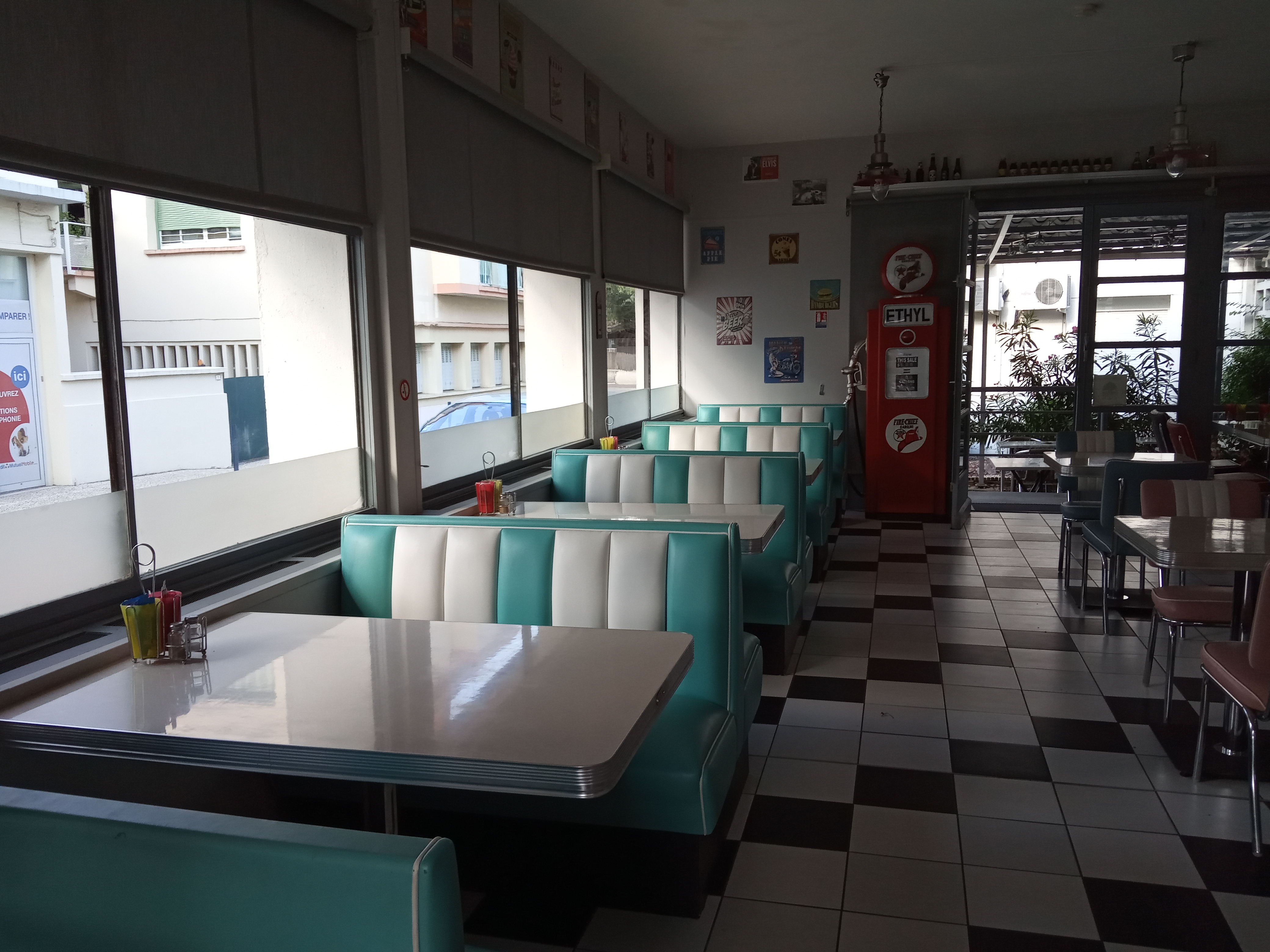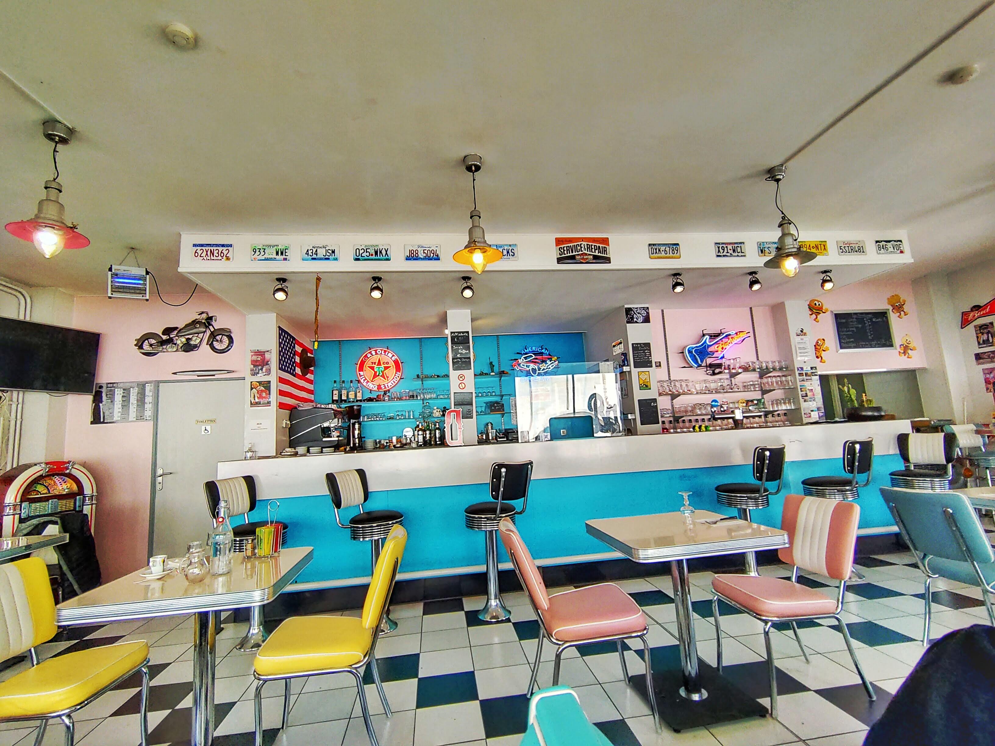 Endroit sympa pour manger un burger ou une pizza dans une ambiance de 'diner' américain.
