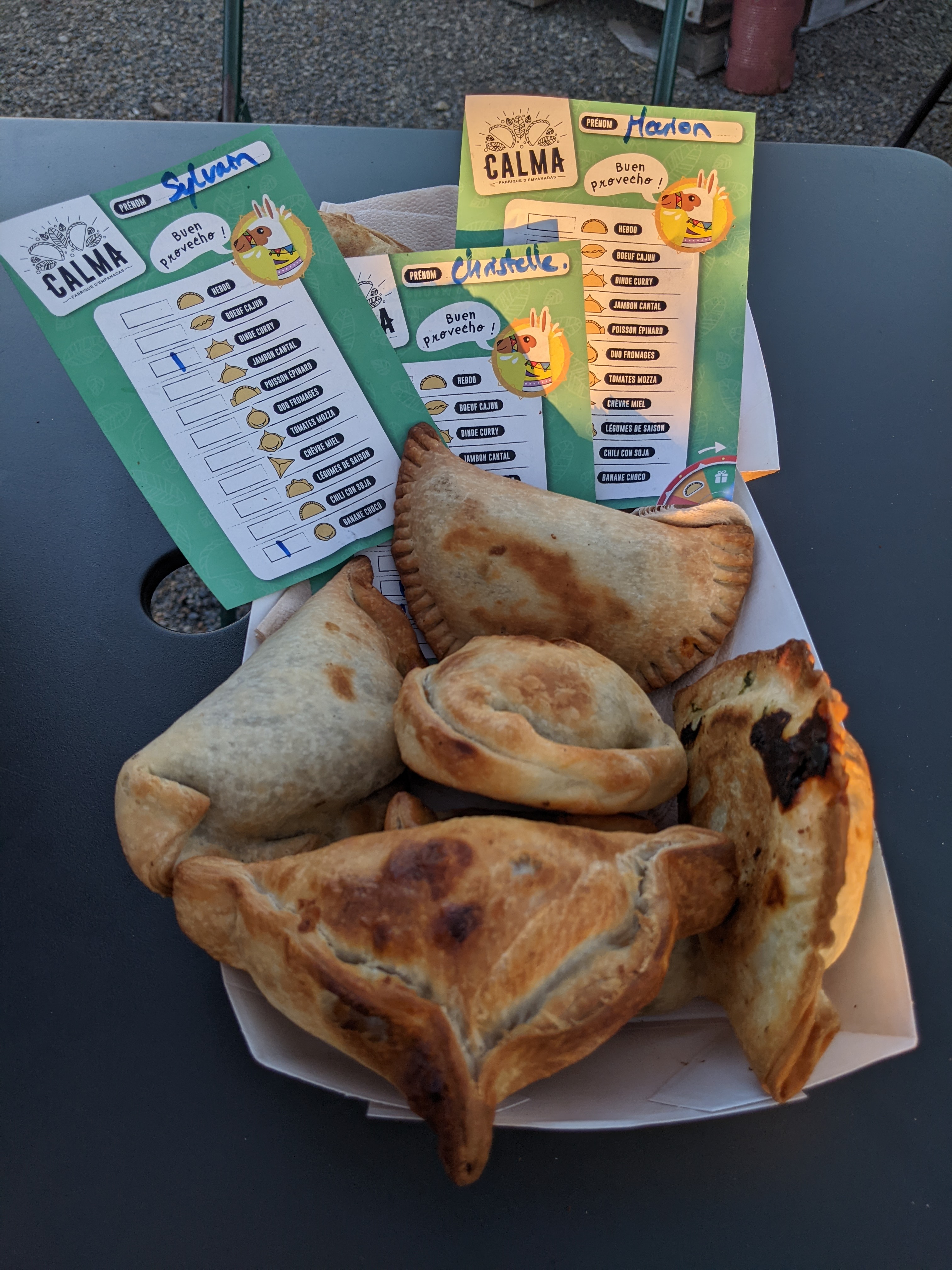 On vient de découvrir les empanadas de Calma à la Guinguette de Mauves/Loire. Tout était excellent, les ceux au poulet curry, les au soja chili, les au jambon .... et mêmes iceux à la banane chocolat. Un grand moment y compris à la commande avec Benoît.