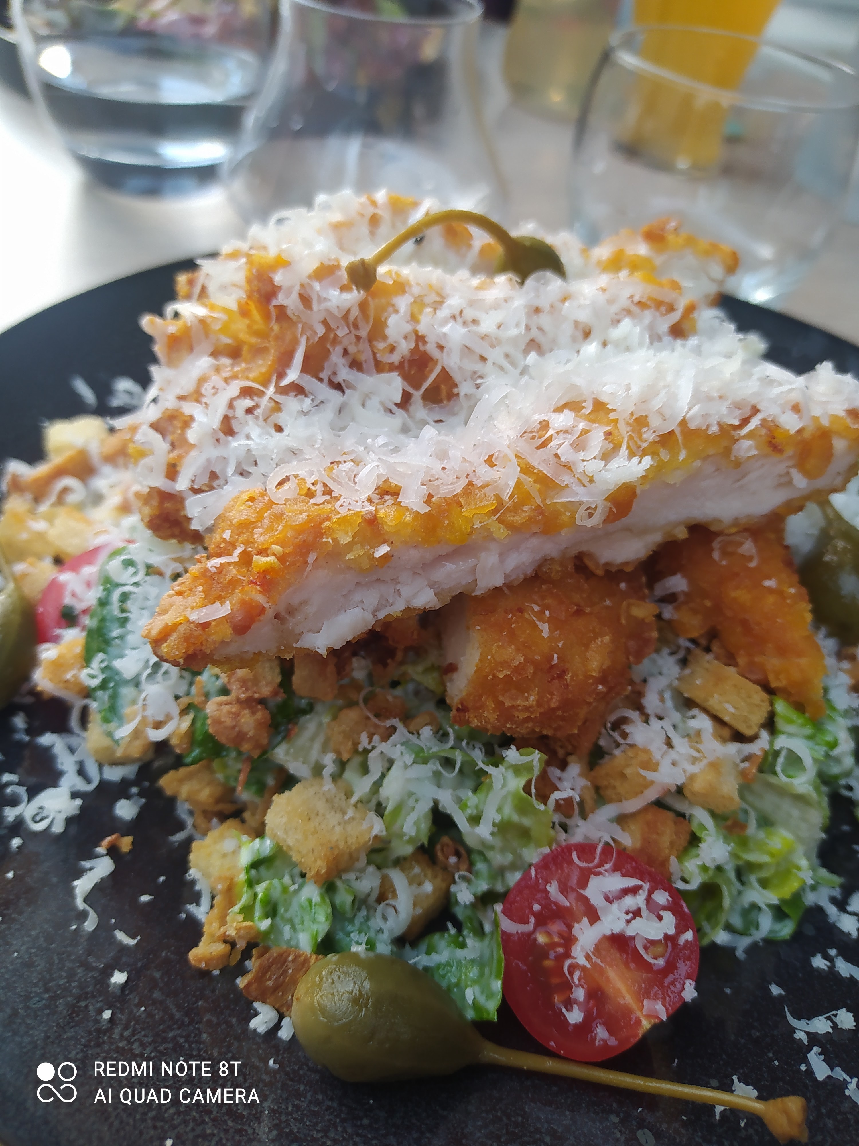 J'avais demandé mon faux filet bien cuit... Mais pas sec... J'ai payé 15 euros pour manger des frites puisque ma viande était du charbon, immangeable, une honte de servir et gaspiller de la viande comme ça ! J'aurais fait un scandale 😁 mais ... La personne qui m'accompagnait y mangeait souvent dû à son travail... Et, m'a demandé de me taire... Heureusement que j'avais pris une entrée salade, exagérément servi. Ce n'est pas un endroit pour manger copieux, c'est le bon endroit pour ceux qui mangeant avec les yeux (proportions exagérés). Manger en extérieur peut s'avérer sympa.