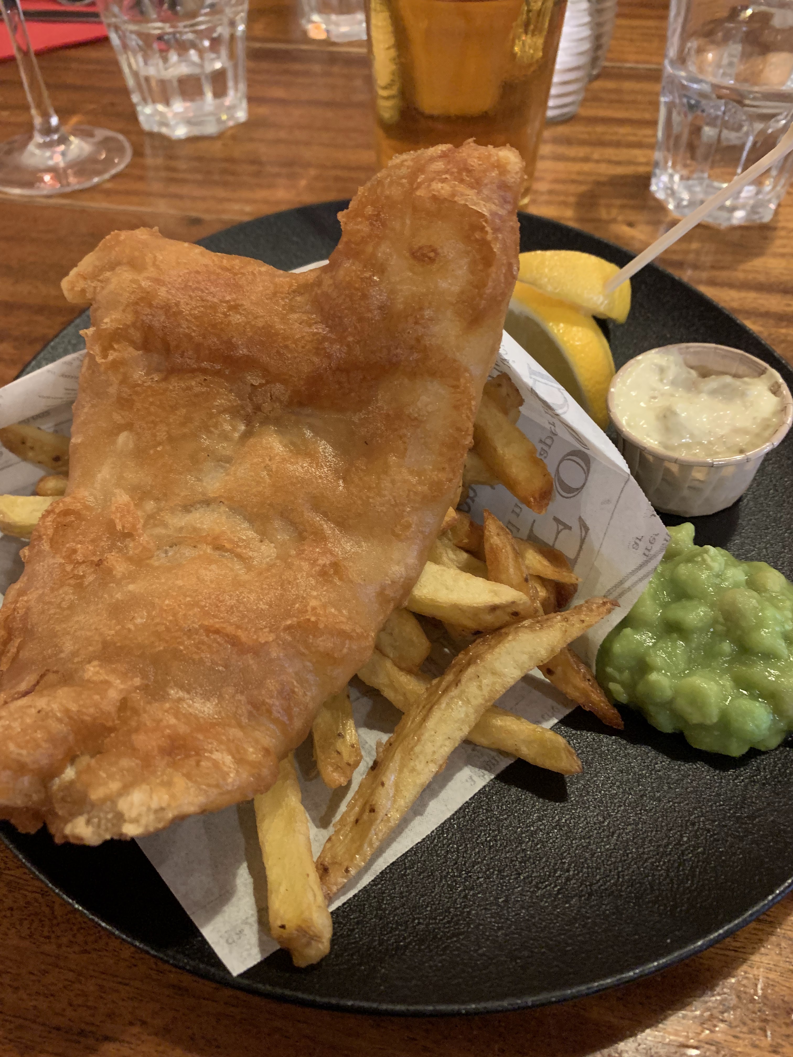 Nous sommes venus ici spécialement pour le fish and chips et nous n'avons pas été déçus. La déco est sympa, par contre petit bémol sur la luminosité puisque c’est un peu sombre, seulement quelques lumières allumées.(?)