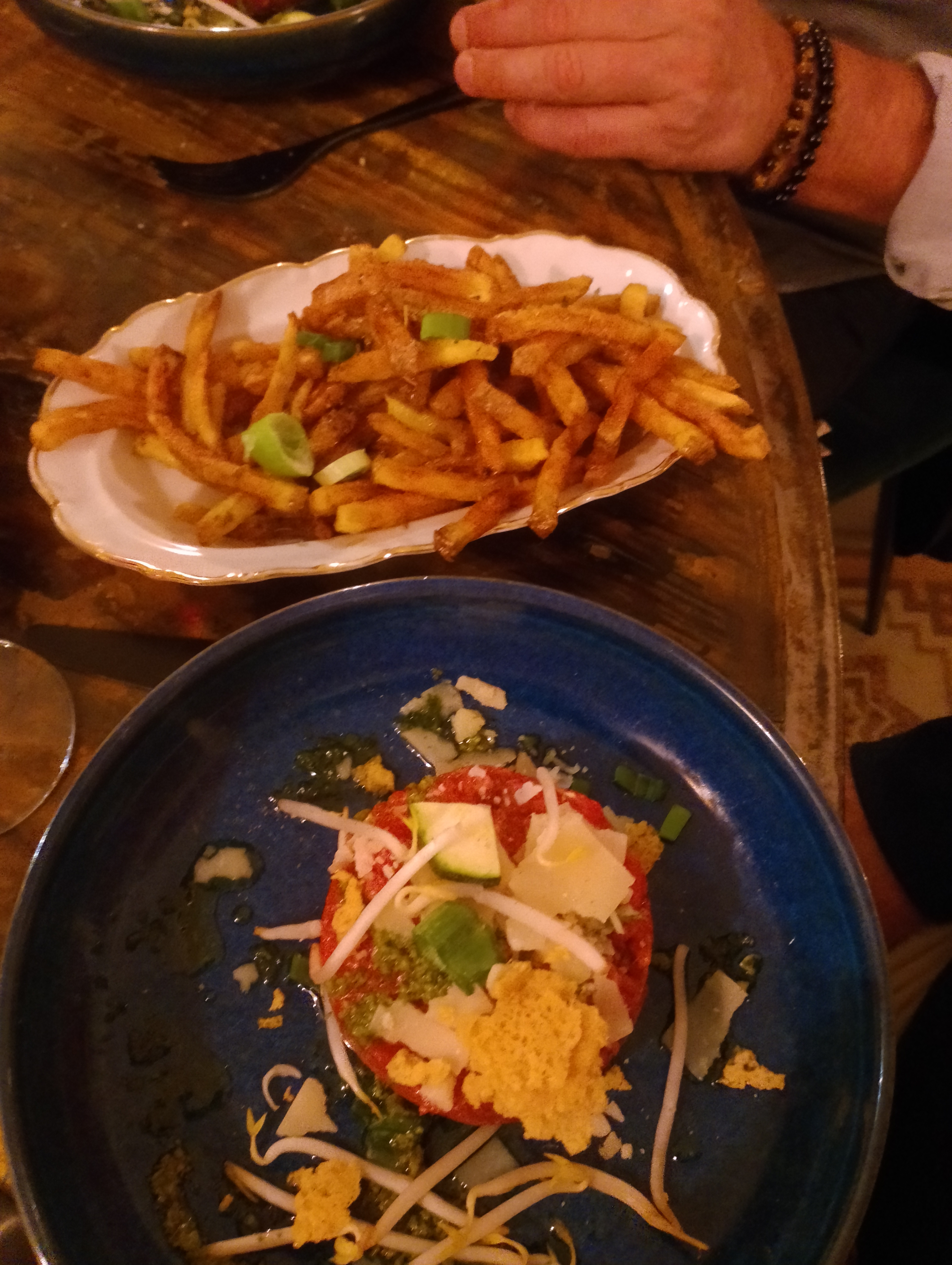Nous y sommes aller, et nous ne sommes pas déçu !! Nous avons pris des Tapas de poulet très croustillant maison avec une sauce barbecue faite maison ! Avec ceci du fois gras et oignons caramélisé, qui s'accompagne très bien avec un verre de blanc que le serveur nous a conseillé ! Ma copine a pris le magrets de canard comment vous dire ? Excellent !!! Le magret est tendre, goûtus, vraiment très bon. Pour ma part je me suis laissé tenté par le tartare de boeuf coupé au couteaux. Un assaisonnement plus que très bien ! Très copieux ! Le tout accompagné de frites maison. Pour les amateurs viandares, je recommandes fortement le tartare !!