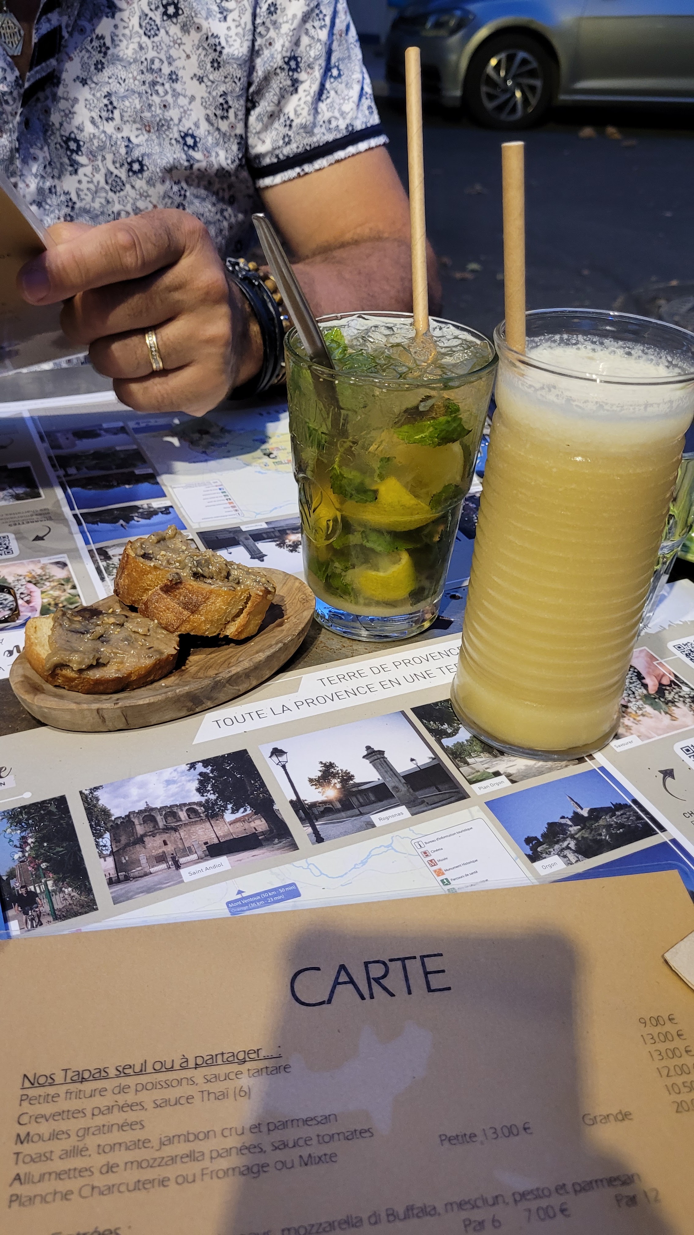 Restaurant bien situé sur une petite place excentrée ... Installés sur la terrasse, tout semblait se dérouler au mieux mais je crois que ce séjour nous réservait encore des surprises : sirotant notre cocktail, le serveur nous allèche avec un super menu mais quelques minutes plus tard nous annonce qu'il n'y a plus de menus ... à 20h45 ! Pleine saison 🤔 ... bon, on réfléchit à une solution de dépannage. Pour couronner le tout, au bout de quelques minutes, une odeur désagréable vient nous chatouiller les narines : une bouche d'égout se trouve à peine 1m de nous. Le serveur interpellé nous répond qu'il n'a pas de solution si ce n'est celle de nous déplacer ... alors, allons-y, merci Monsieur 😉 Finalement mon mari choisit le gratin de Camille qu'il a trouvé fort bon, quant à moi, j'opte pour une salade composée avec du melon et du jambon. Je me réjouis, étant à proximité de Cavaillon, de déguster du melon local mais au lieu du fameux fruit orange, j'ai dû me satisfaire d'un de couleur blanche ... Bref ... un peu déçus car au vu des avis nous étions persuadés de passer un bon moment à cette table ... J'espère que notre mésaventure n'était qu'un cas isolé ... Rassurez-vous, il en faut plus pour gâcher notre bonne humeur 😊