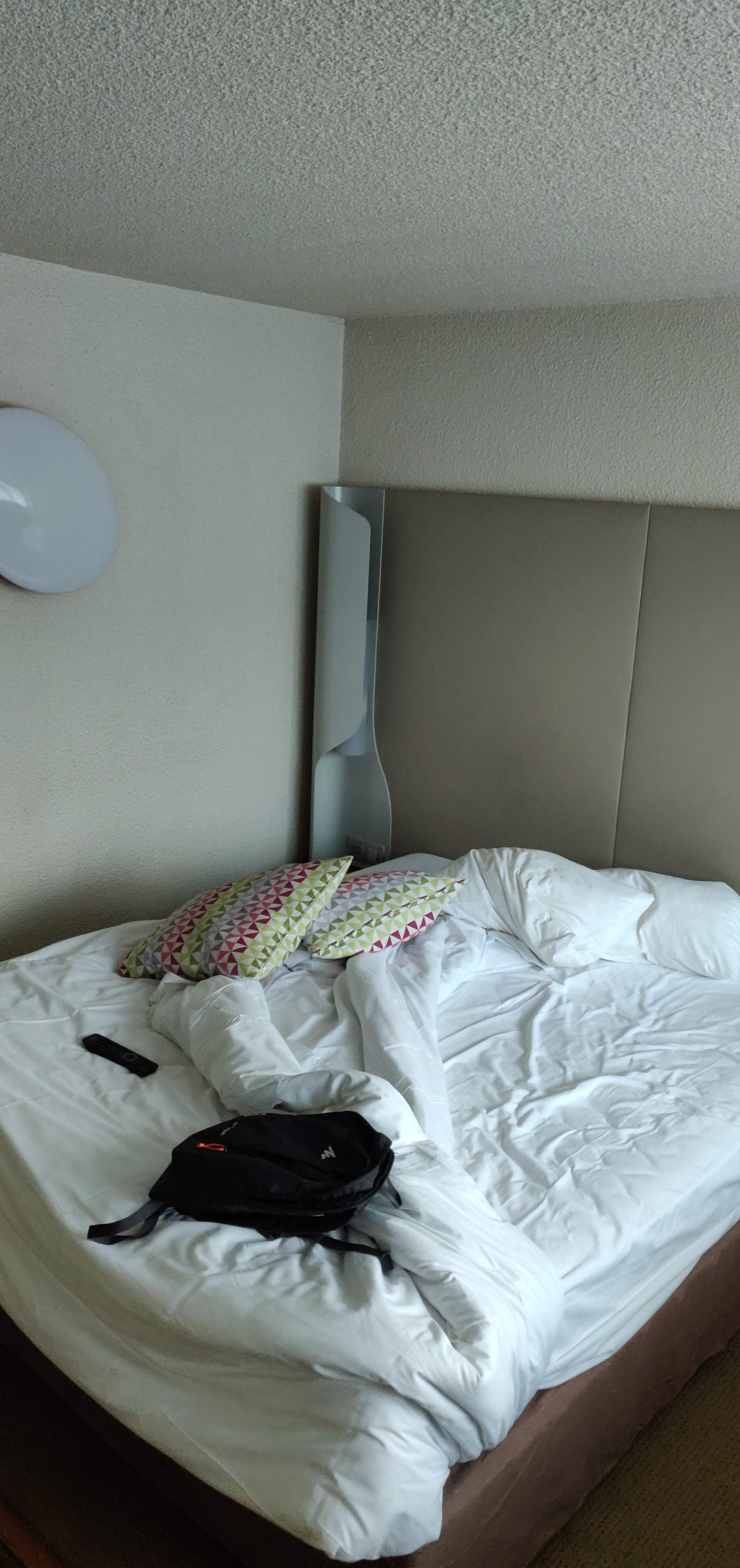 Hôtel 3 étoiles? 😂 La moquette marron au sol pas toute neuve, ça fait sale .. drap humides avec odeur javel très désagréable. Sol poisseux le deuxième jour Le matelas à ressort ça existe encore ? Après la deuxième nuit torticolis , coussins pas assez épais.. Pas assez de serviettes dans la sdb au moins en rajouter une petite , joint de la douche á refaire sinon piscine sur le sol á la sortie. PQ tout humide. Dans le monde hypraconnecter dans lequel on vie , il faut mettre plus de prises secteurs á côté du lit . Quand la femme de ménage passe il faudrait peut être s’annoncer ? Points positifs : Parking de disponible Hôtesse très sympathique (morgane?) que ce soit au téléphone ou face á face . Petit dej buffet large choix ( malgré que le salé ne soit pas assez présent à mon goût). Proche de tout : intermarché, macdo, kfc … Petit + : volets, bouilloire et thé dispo dans la chambre.