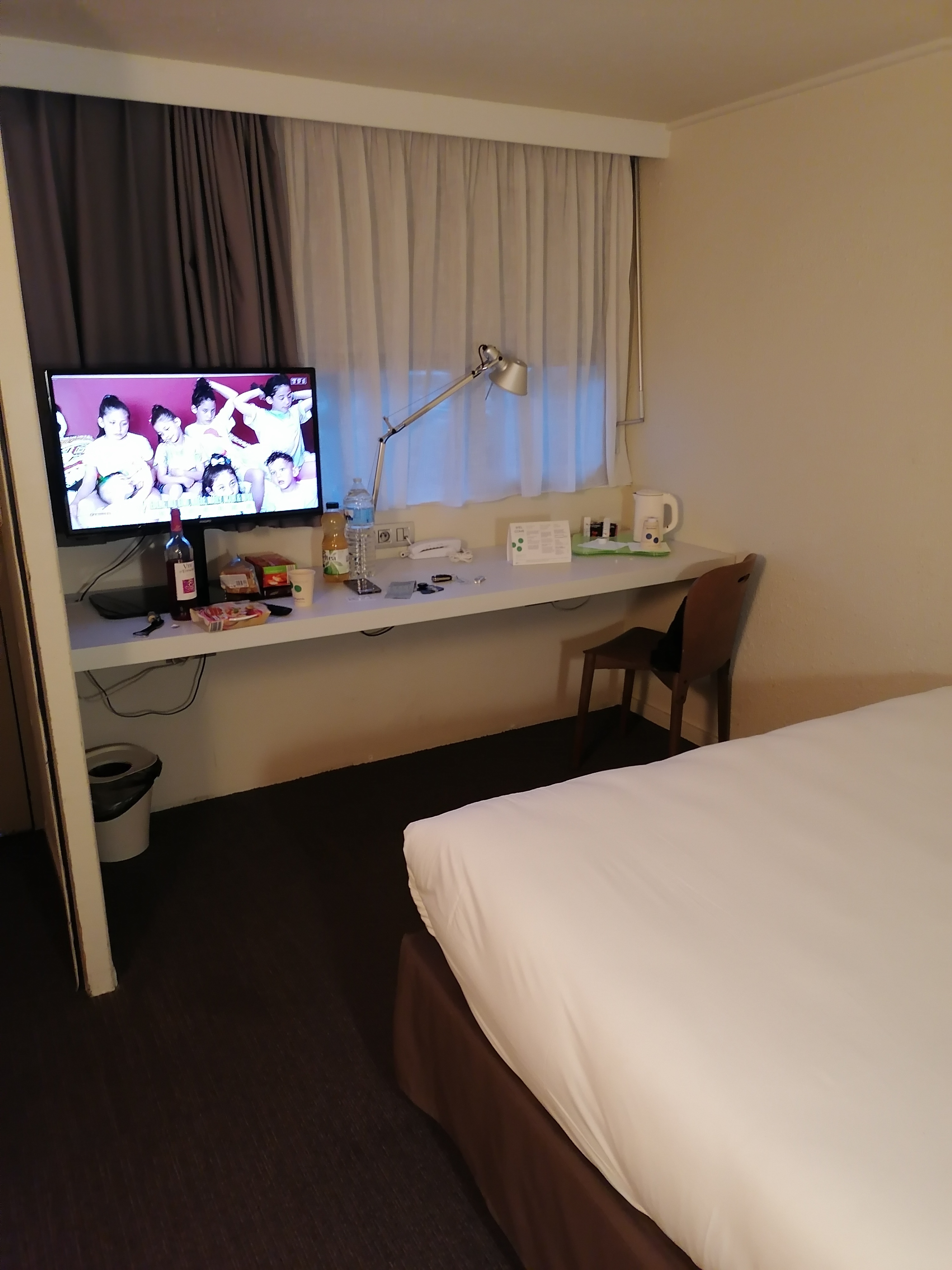 N'avons dormi qu'une nuit en étape = parfait Chambre très propre ,bonne literie , tv ,wifi ,prises dispo pour recharger les portables . Plateau accueil avec bouilloire bon rapport qualité /prix .59 €