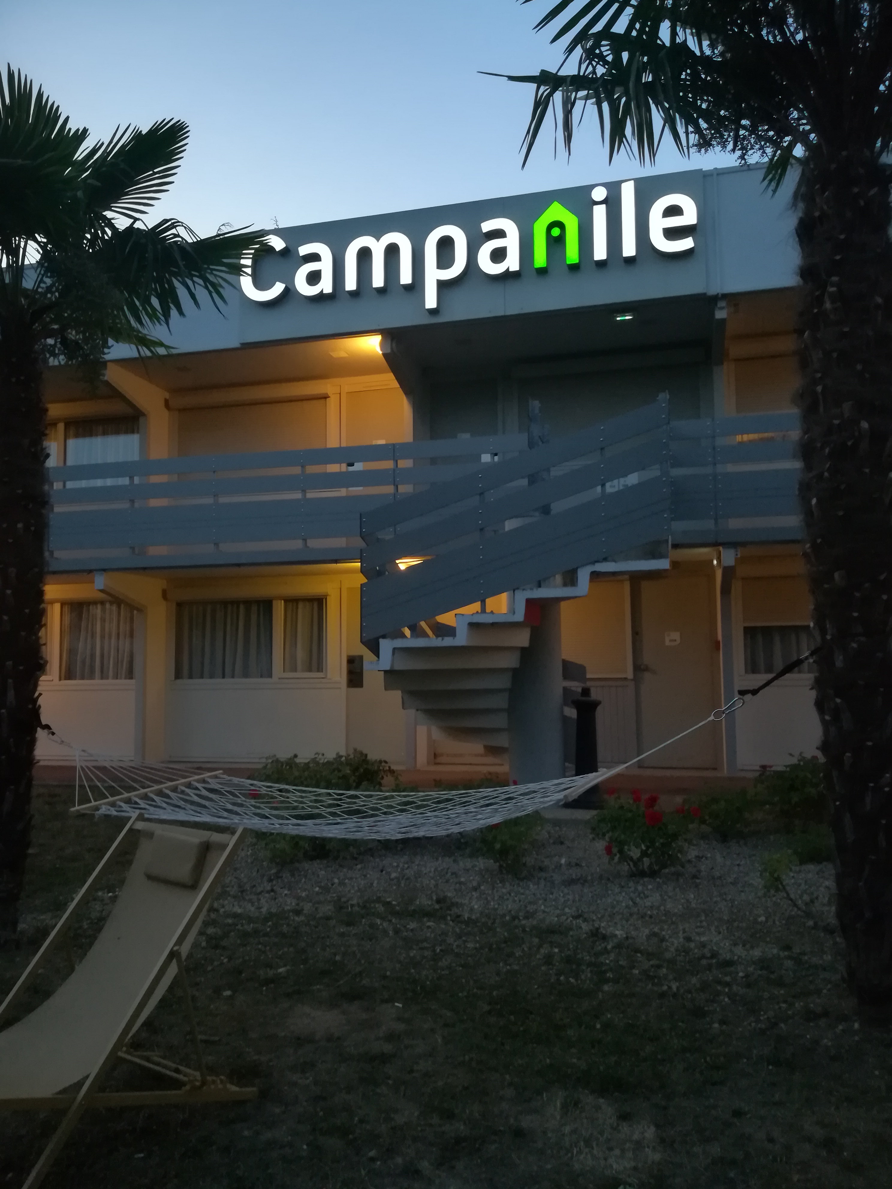 Arrivés un après midi de canicule, la poubelle du parking déborde de papiers disséminés jusque devant les chambres... le béton des escaliers s'effrite on voit la ferraille, super.... Accueil sympa, rien a dire. On arrive aux chambres, pas de rideaux donc volets fermés avec lumiere, génial. On se demande comment a été fait le ménage ds la salle de bains correctement vu que sur 3 spots 1 seul marche, on se douche presque ds le noir. Pour la sdb de la 2eme chambre la bouche d'aération tient avec du scotch. Bref ce Campanile c'est la misère...