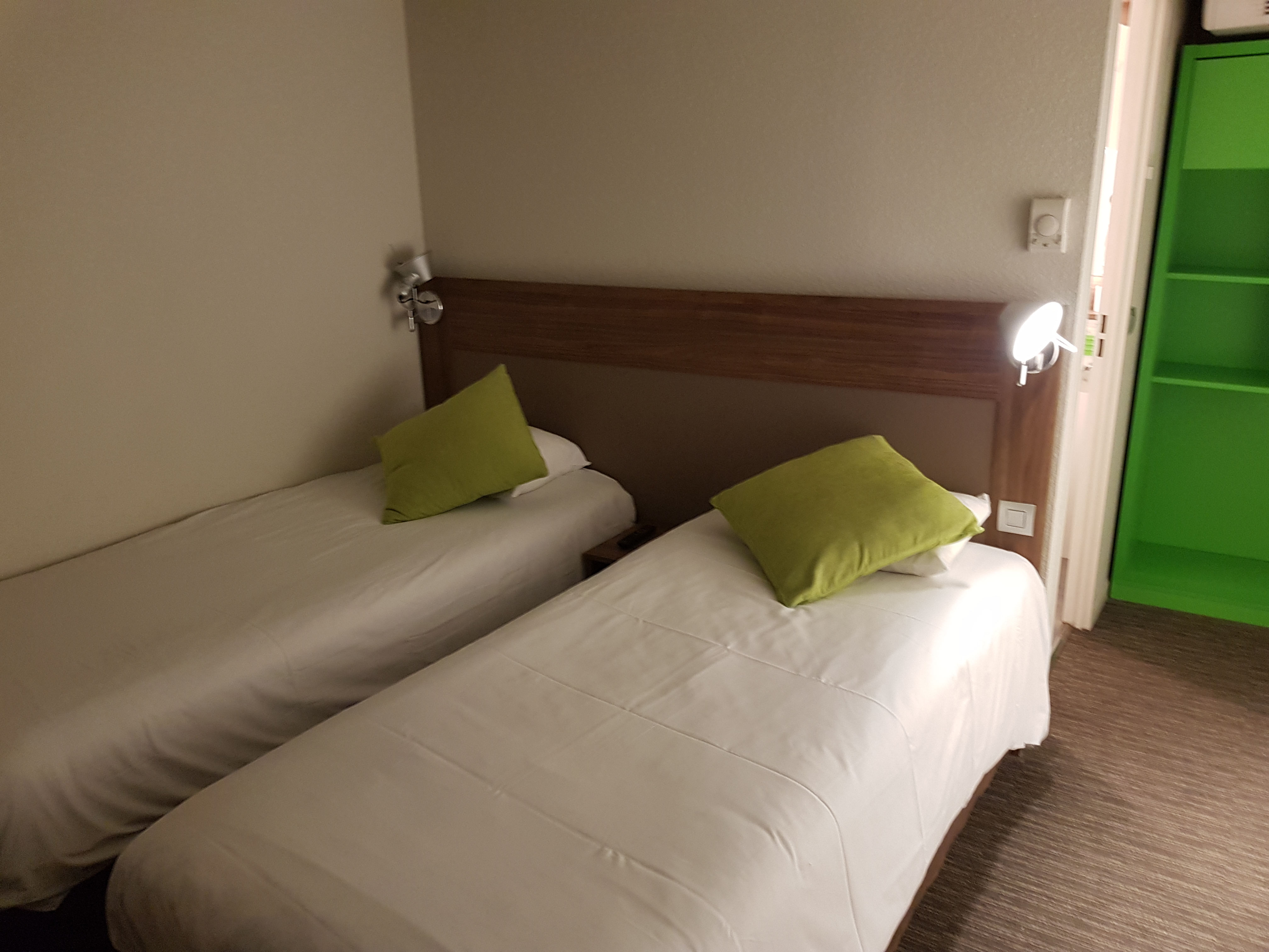 Les chambres sont minuscules (claustrophobes, passez votre chemin...), sombres. La télévision ne fonctionnait pas. Moquette au sol. Rideaux jaunâtres. Pièce difficilement aérable. Les seuls points forts, le volet roulant électrique et le petit mot d'accueil du personnel d'entretien. Bruits nocturnes. Ligne à haute tension au dessus de l'hôtel. Autoroute à proximité. Petit déjeuner trop cher pour ce qui est proposé à manger. Nous n'avions pas les moyens d'y mettre plus pour cette fois. Nous ferons autrement la prochaine fois.
