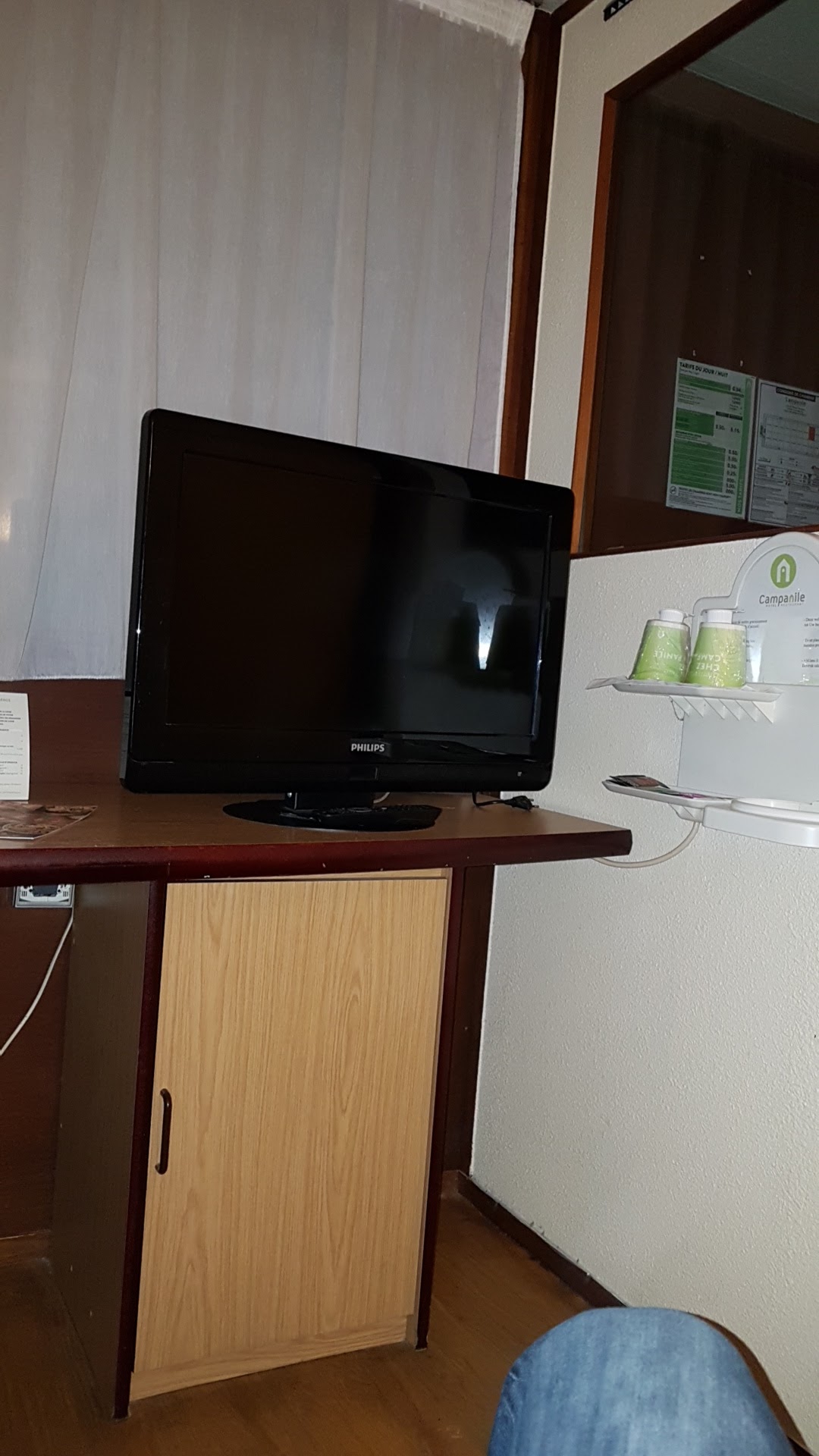 Lamentable, chambre sale, deco archaique, clim hs, tv hs, pas de savon chgt de chambre opere peu de difference, seule une tv qui fonctionne toujours pas de clim soi disant un orage la semaine derniere mais vu la couche de salete et poussiere plus surement une absence totale de maintenance. Toujours pas de savon... A ce prix la je ne remettrai plus les pieds chez campanile tv