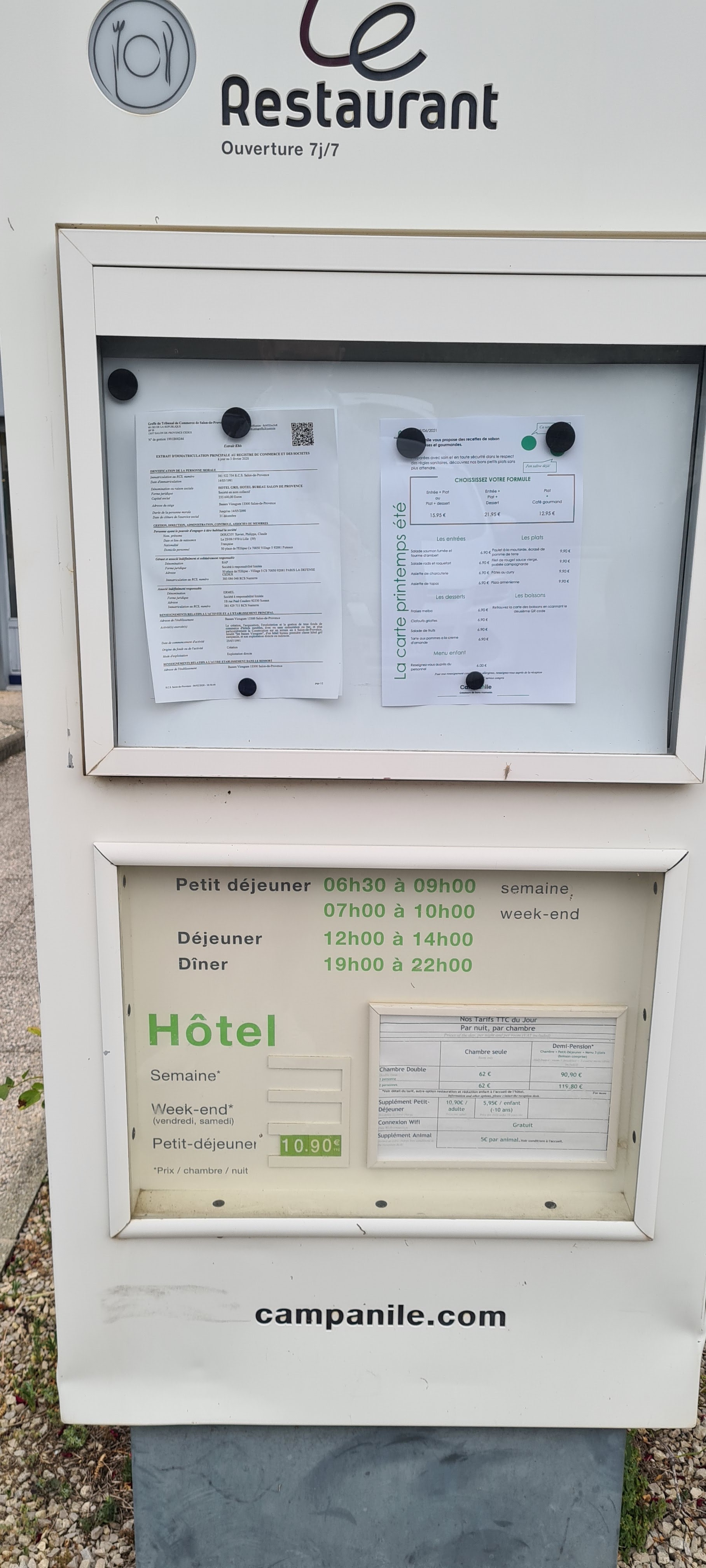 Étape sur le chemin des vacances, nous avons choisi Campanile comme référence pour dormir. Malheureusement, la désillusion a commencée au restaurant ou la personne en charge de nous servir, nous a gentiment nier. Après 15 minutes d’attente, c’est la personne de l’accueil que nous avons sollicité qui est venu nous servir. Sur 4 plats, il n’y a avait plus le poisson proposé, les pâtes étaient trop cuite et fade, sur 4 desserts, les fraises n’étaient plus disponibles et le choix du vin était également limité car plus de stock. Quand nous sommes aller dormir, le lit de notre fils n’avait pas de drap et était directement en contact avec le couvre-lit remplit de poils et de cheveux. Il n’avait pas non plus de coussin et d’essuies. Les couvres-lits de nos lits étaient également dans un sale état. Et pour terminer, le rideau de douche était remplit de crotte de nez et autres... Bref. Dégoûtant et franchement... passez votre chemin.