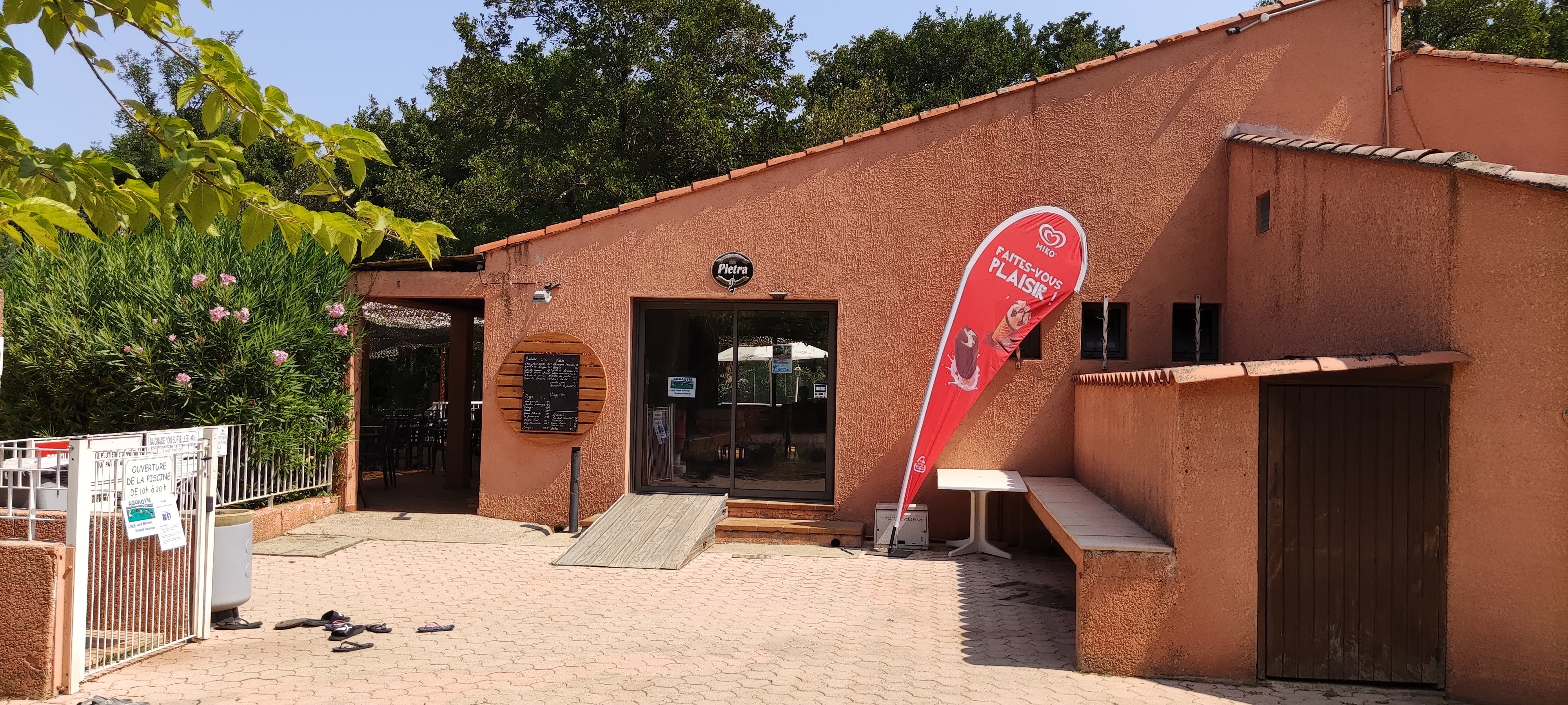 Camping ne valant pas ses 4 etoiles, sanitaires très salles, restaurant très peu accueillant et appétissant, l eau de la piscine légèrement verte ! Très décevant pour les prix !