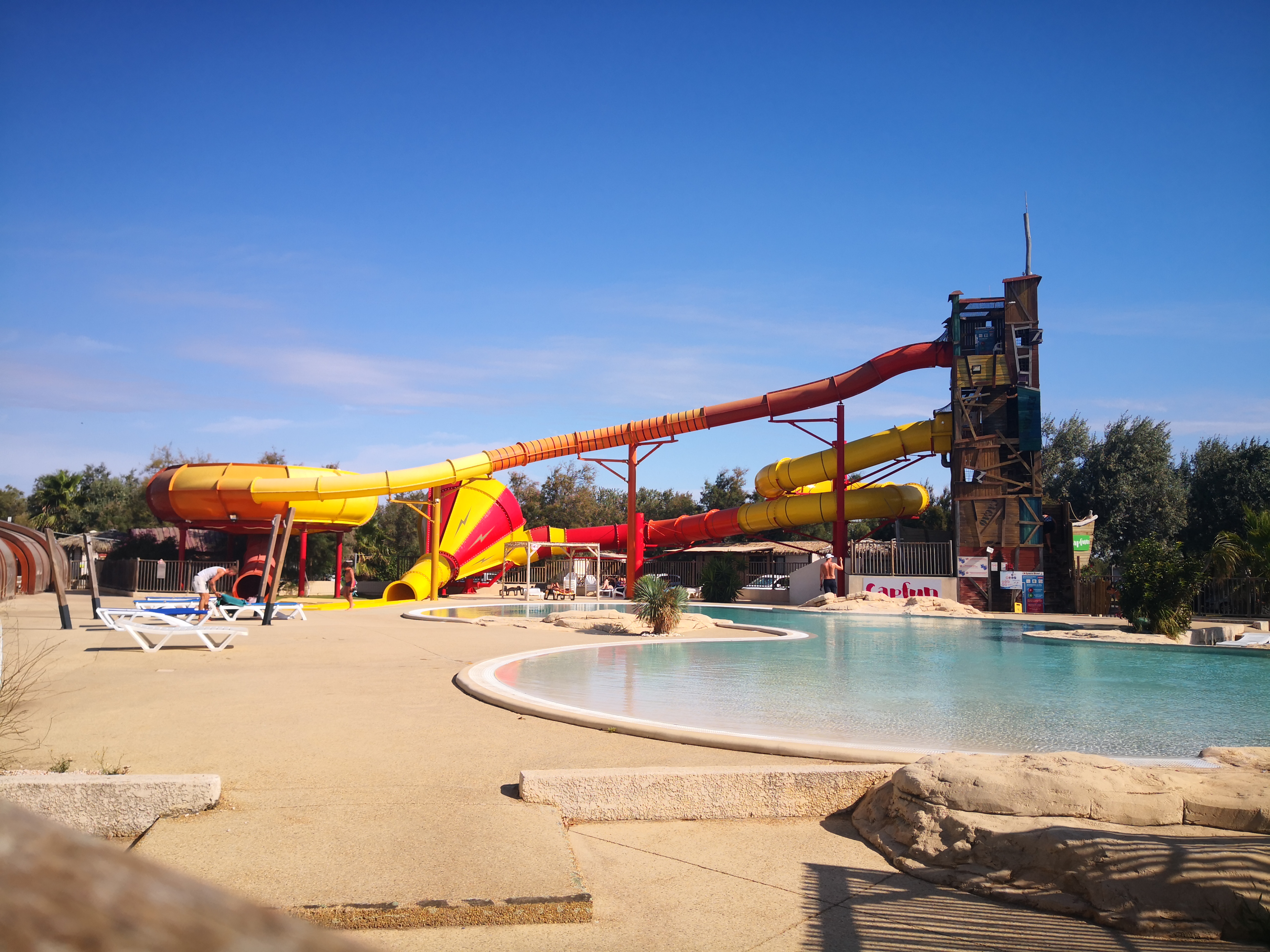 Assez decu pour un capfun zone fun max Vis à vis de tous les autres que j ai fait c'est le premier qui me déçoit. Mobil Home : 3/5 Pas de plus pas de moins, ça fait le job, assez proches sans non plus être les un sur les autres. Pas de zone de camping Fun : 1/5 Animateurs peu présents et pas vraiment moteurs. J espère pour eux que c'est pas une vocation. Ca fait un camping assez calme Soirées : mêmes soirées 2 semaines de suite, peu d'intérvenants externe (1/semaine) Donc des soirées plus ou moins identiques avec les mêmes playlists. Zone aquatique 2/5 De bons toboggans mais zone de piscine assez petite pas très profonds, pour les jeux d eau (water polo, aqua gym) c'est très bof Pas bcp de transats. 2 gros spots de guêpes sur les rochers artificiels qui bordent la piscine externe assez dangereux non 'traités. Plage à 250m ? OK la plage fait plus de 500m de large pour atteindre la mer. On a vu bcp de gens prendre quand même la voiture pour dire. Restauration 2/5 Bcp de soirées à thème pour rentabiliser tout ça, nourriture moyenne en comparaisons d autres capfun Commodités 3/5 Lave linge 5 € sans lessive fournit Zone de poubelles qui débordé de partout Superette : point positif bcp de choses et pain / viennoiserie bons. Super U très proche. Internet et autre : 0/5 Tv qui decroche souvent, pas toutes les chaînes Réseau 4G faible sur une grande partie du camping Wi-Fi : si vous voulez perdre votre argent... Meme Google maps avait du mal à fonctionner, mon téléphone en H avait une connexion plus stable... Personnel : 4/5 Point positif tous souriants et à l écoute de nos petits tracas, que ça soit à l accueil ou ailleurs :) Sortie externe : 3/5 Bcp de choses à faire mais au vu de la disposition du coin, tout est loin. Compter 1h mini de trajet pour la plus part des choses à côté (leucate gruissan Narbonne etc)