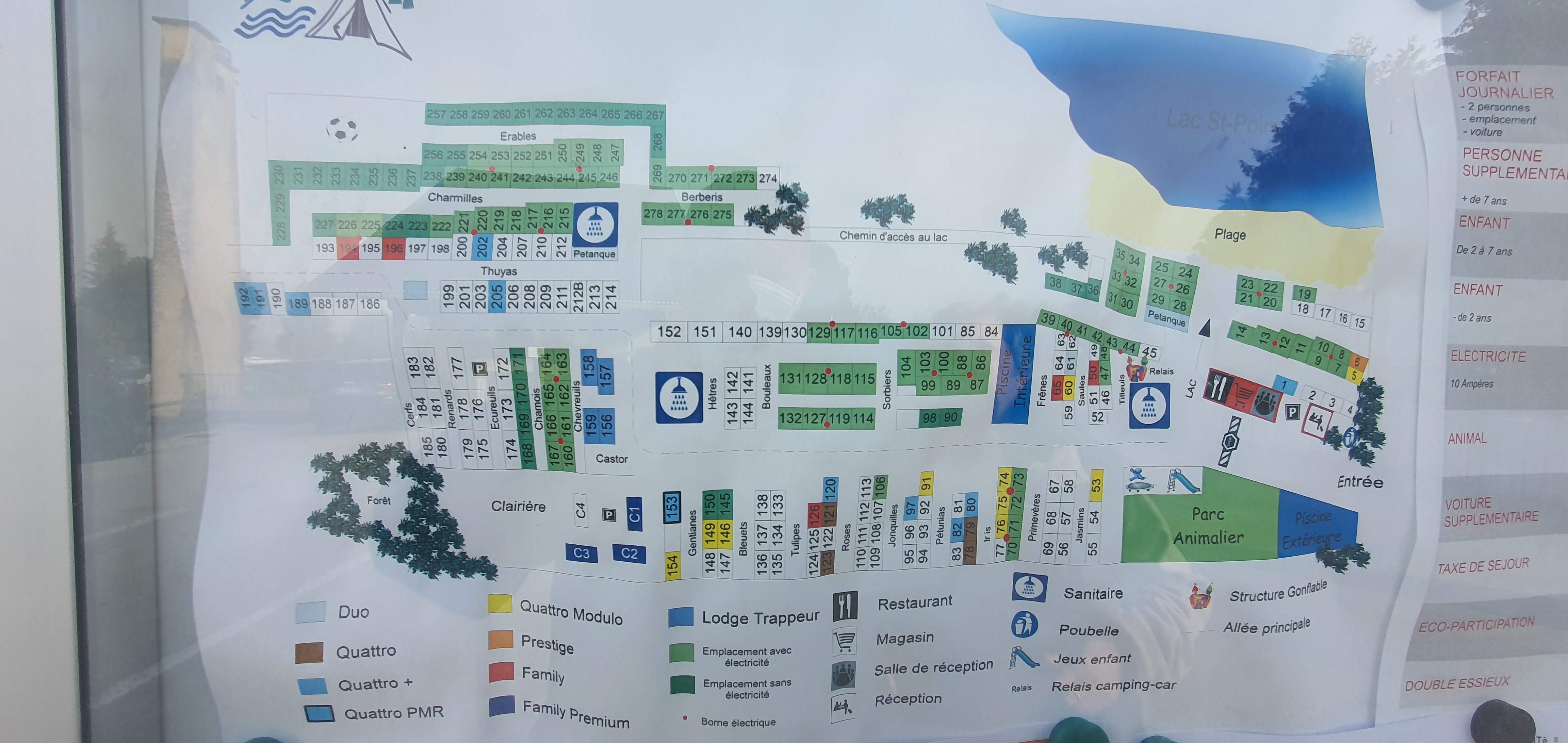 Au bord du lac St-Point, un camping familial très animé. Un très bon restaurant : burgers, pizzas, moules-frites (service un peu long car beaucoup de clients alors prévoyez un apéro!), glaces, etc. Une équipe souriante, dynamique et serviable. Beaucoup de toboggans (le Double Slide peut faire mal). Piscines extérieure et intérieure superbes (trop de chlore dans le bain à remous). Locations de paddles, pédalos, etc : un peu cher. Un snack au top vue sur le lac. Prévoir chaussures aquatiques pour le lac car beaucoup de cailloux et de vase. Pas assez de poubelles au sein du camping. Notre mobil-home Sun Top TV était très vieux. Trop de variations de T°C pour la douche. Pas de petite tablette entre les 2 lits simples (pour poser des lunettes de vue par exemple). Pour les sportifs : de beaux sentiers autour du lac avec une vue magnifique. Une supérette bien pratique bien qu'un peu chère avec dépôt de pains et de viennoiseries. Un très beau spectacle des animateurs avec de belles leçons de morales pour tout public. Soirée mousse et pool party : géniales!