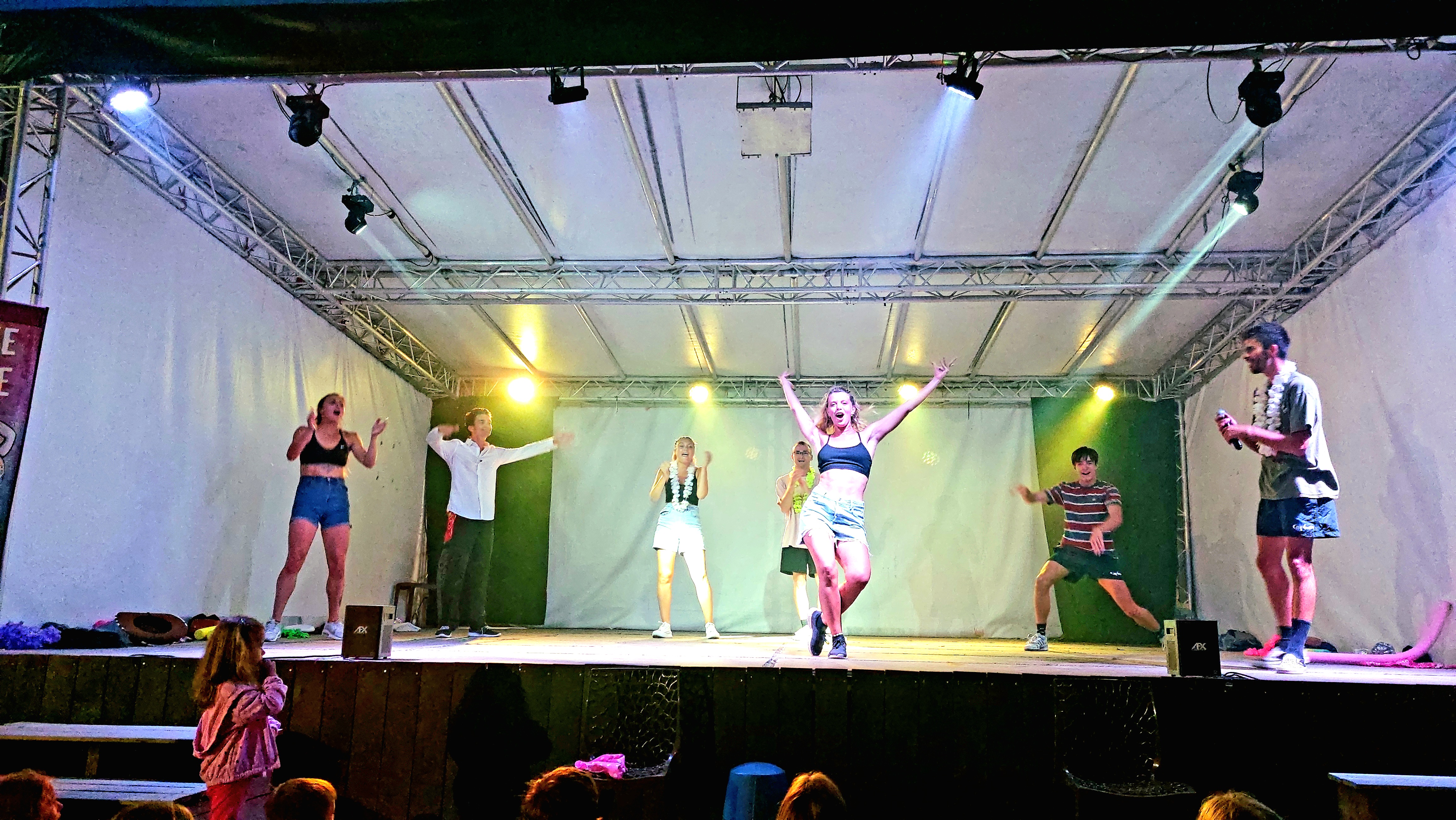 Animations en soirée, genre feuilleton sur un fond en images projetées sur écran, animateurs en costumes ridicules, bande son et images non synchronisées et pour finir en play-back. Plus qu'amateur ce genre d'animation. Avant il y avait de vrais spectacles faits par des prestataires, mais c'était avant, les prix augmentent, les prestations baissen!