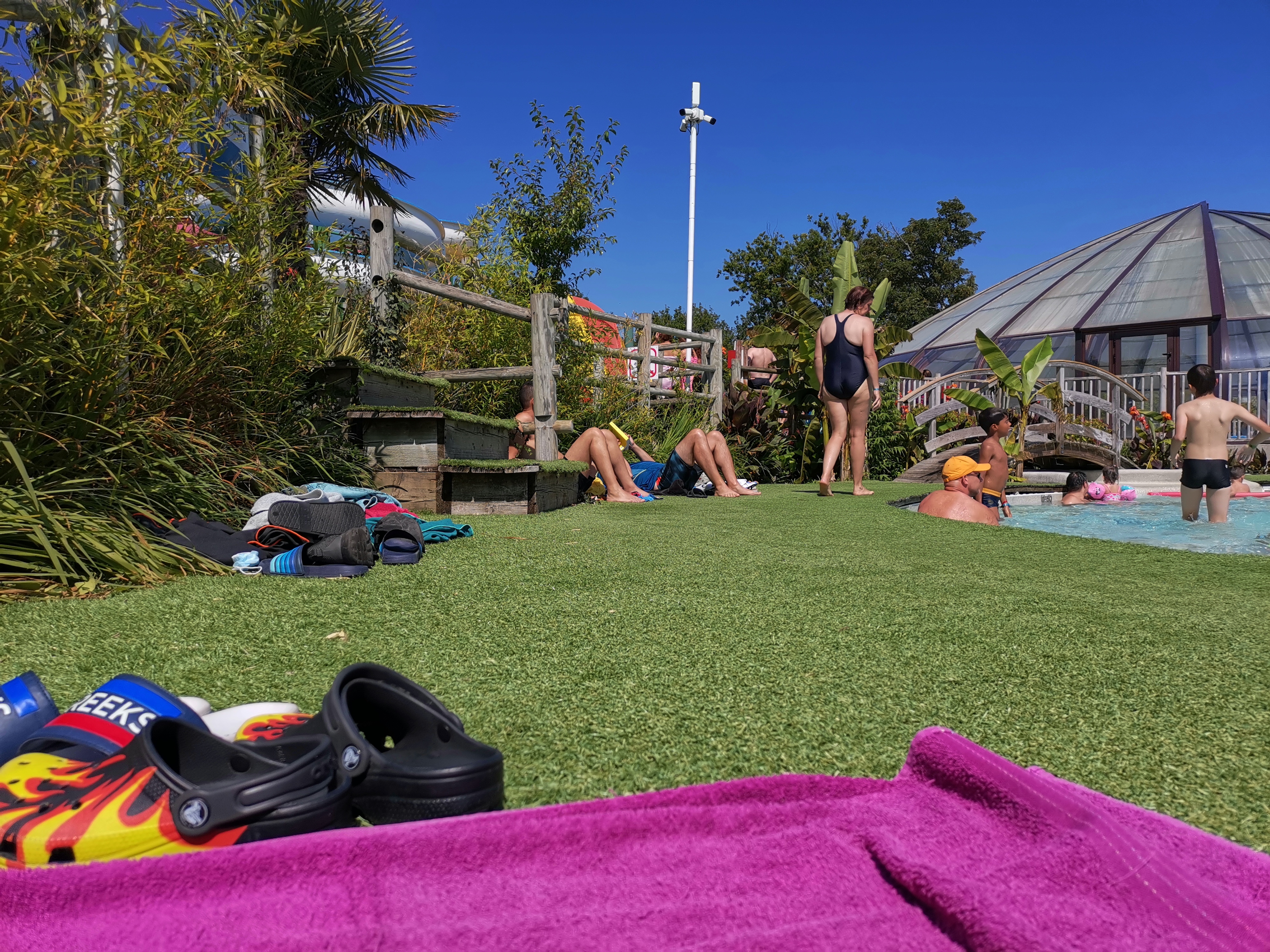 Le camping est sympa, très jolie vue. Les mobiles home sont petits mais propres. Manque de rangement et la chambre parentale est vraiment minuscule. L'accès aux tobbogans pas avant 11h15 c'est super tard Ouverture de la piscine à 10h, tous les autres Capfun c'est 9h, vraiment dommage car après on est trop nombreux par rapport à la taille des piscines. Sur le site ils pourraient prévenir qu'il y a des châtaignes d'eau et qu'il faut prévoir des chaussures pour se baigner, résultat mon fils a eu 3 épines plantées dans le pied. C'est pas la faute du camping, mais un message d'avertissement sur le site aurait été appréciable pour anticiper l'achat de chaussures. Par contre, pour les animations du soir, c'est tout simplement du vol, une véritable arnaque. Aucun intervenant extérieur alors que c'est spécifié sur le site, des spectacles que pour les tout petits, passage de film (ça je l'ai à la maison et je peux choisir !!!), concours de pétanque... Alors que la fun dose est rouge. On paie plus pour ce fun dose c'est inadmissible !!