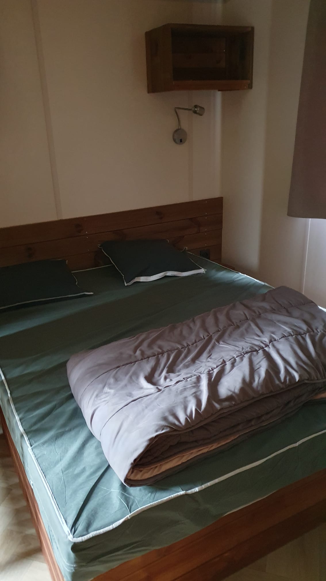 Chambre pour adultes avec grand lit ou 2 petit lits.trop étroite on peut pas bouger.mobile home pour 2 couples avec 2 enfants chacun.trop etrouts