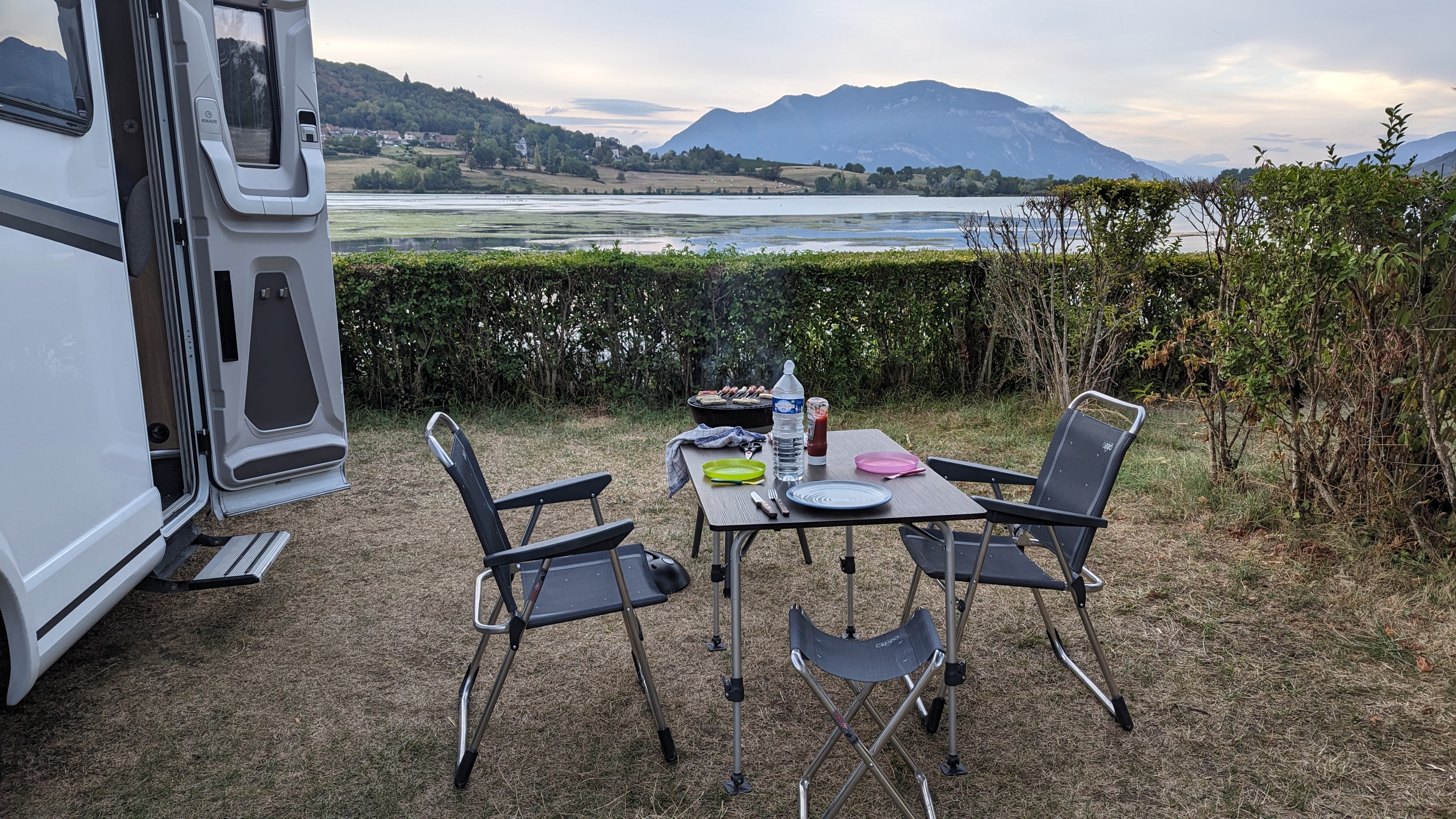 Camping très bien placé. Restauration (y compris le petit dej) et Baignade (en piscine ou au lac) possibles sur place. Petite supérette et activités nautiques. Vue sur le lac imprenable. Seul point d’attention : si le Cadre est calme, les emplacements sont proches les uns des autres : du coup on entend bien les voisins 😉