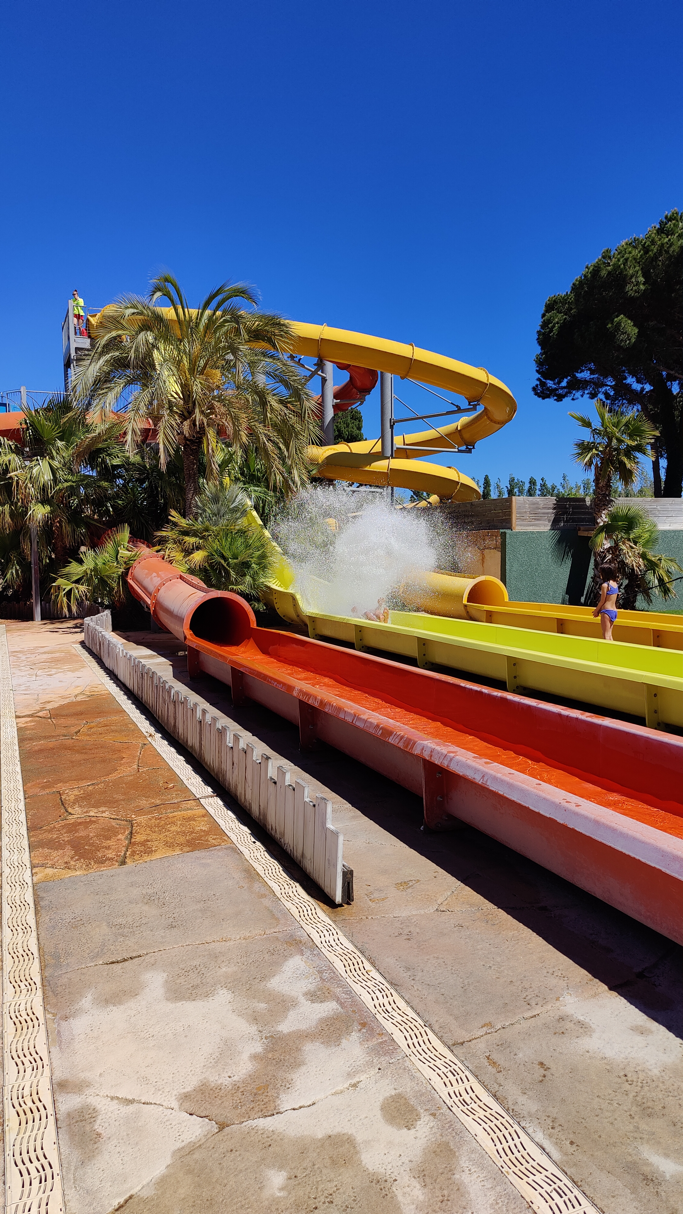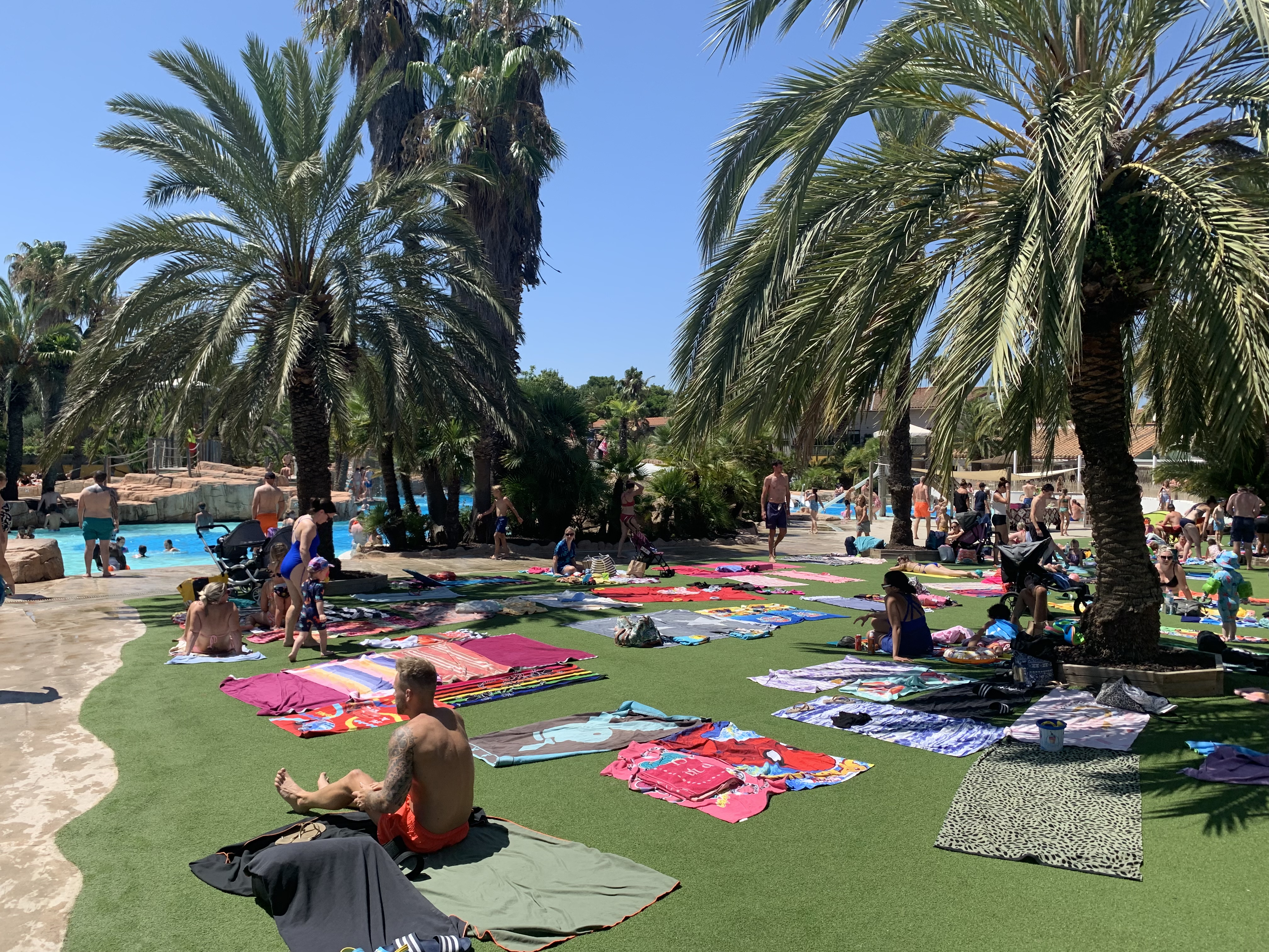 Le camping est très grand, peut être trop de monde, c'est dommage, vu le manque de respect de certaines personnes c'est compliqué de cohabiter parfois...mais bien entretenu, la parc aquatique est très beau. Sauf le revêtement de sol vert brûlant et il manque un accès par échelle à la piscine 140 pour les non nageurs...les restos sont bons avec des tarifs du sud...le bungalow climatisé super bien. Sauf pour l'acoustique vers l'extérieur.