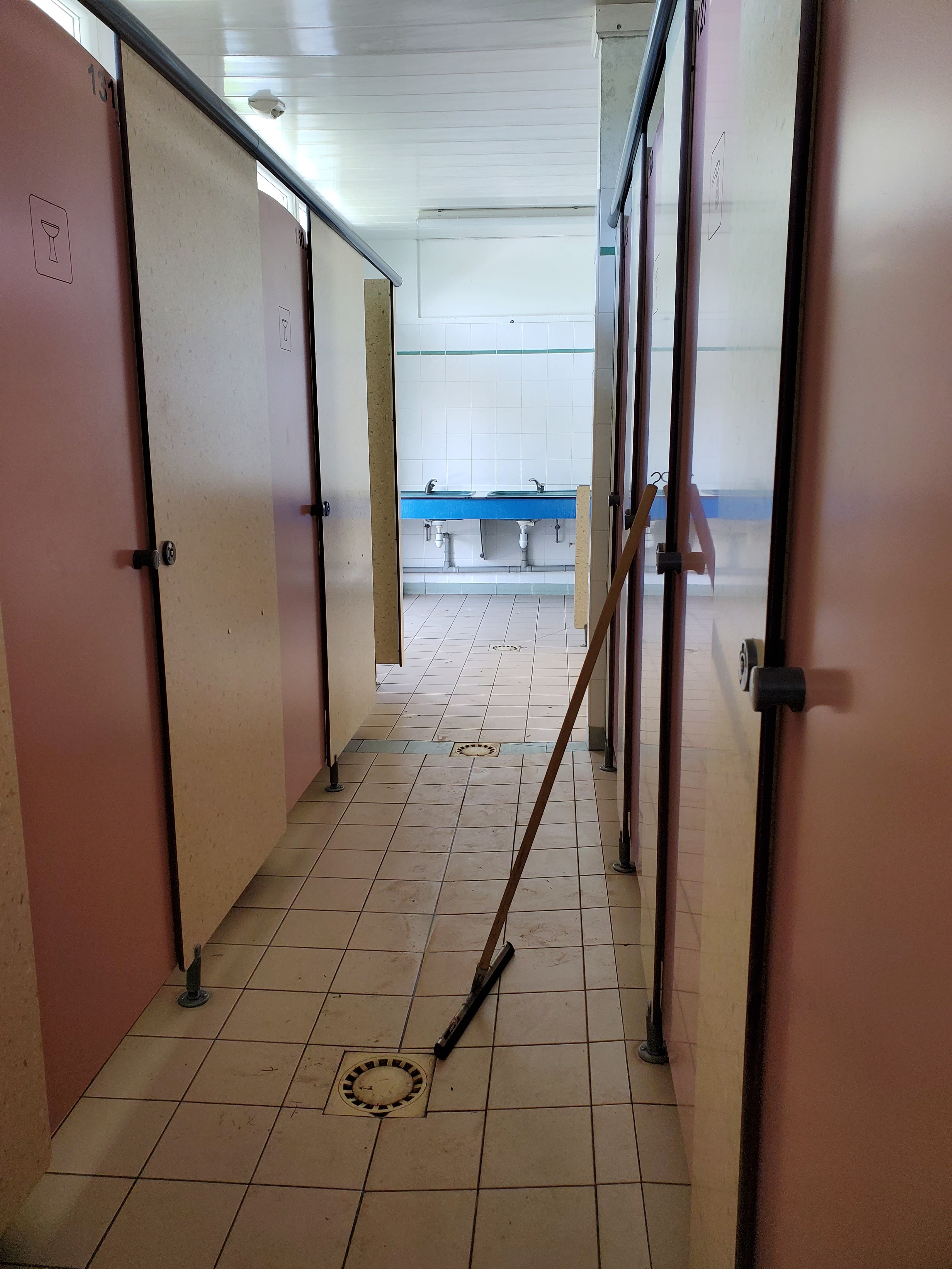 Emplacement très bien. Sanitaires dégoûtants, Couche de crasse dans la rigole entre les douches, flexibles qui sont cassés, pas possible d' accrocher la douchette, eau qui passe du chaud au froid Sans arrêt. PaS de commodites pour poser ses affaires en douche. Douches glissantes. Trop peu de sanitaires ouverts.