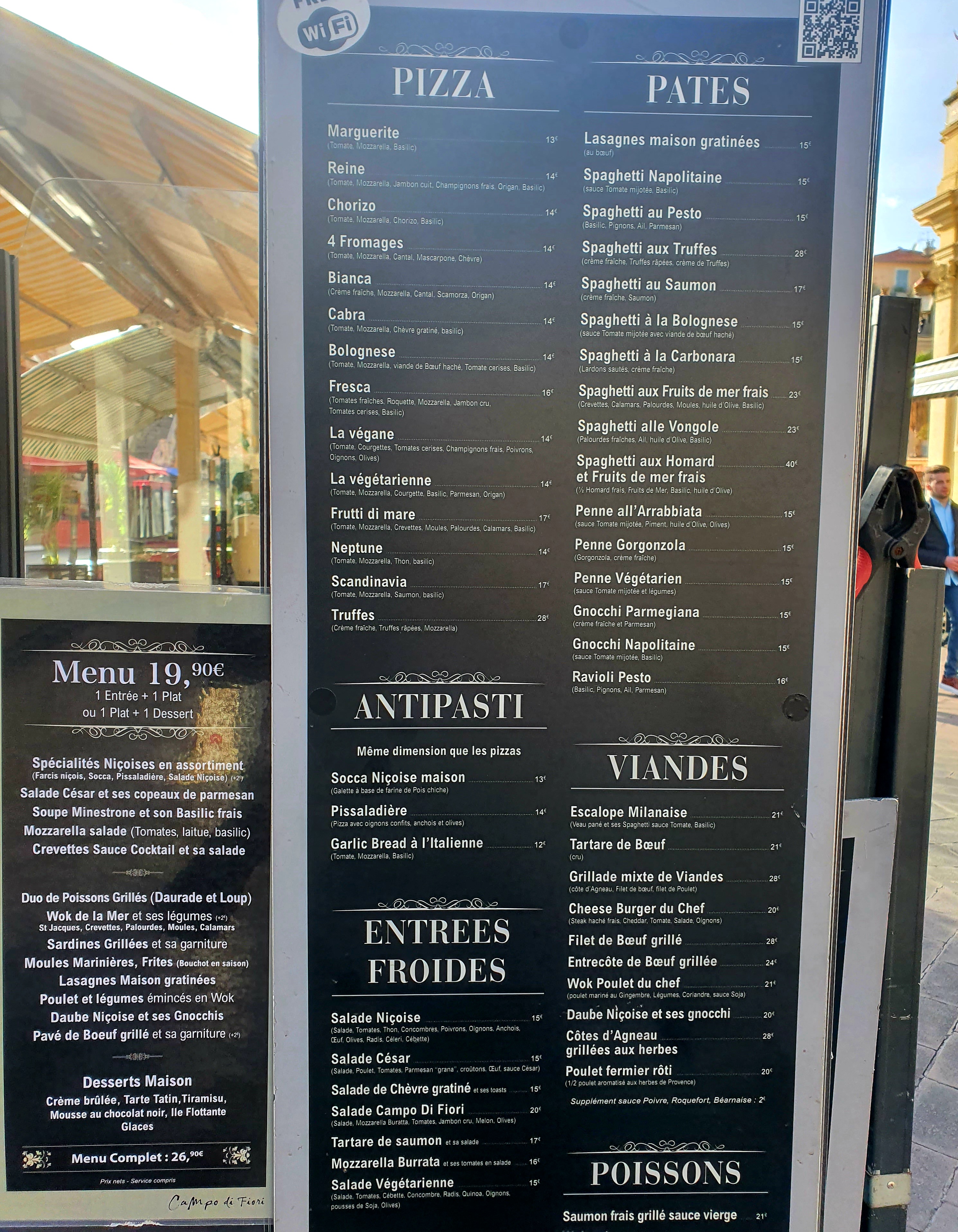 Étant de Nice et recevant des amis en visite, nous nous sommes retrouvé par hasard dans ce restaurant. L'accueil était très courtois et agréable, le placement en terrasse et le confort d'installation plutôt positif. La carte est fournie et nous avons eu peur d'être tombé dans un attrape touriste mais sincèrement nous avons bien mangé et les assiettes étaient plus que garnies. Le bémol est pour nous principalement sur les prix des boissons et desserts qui sont vraiment excessifs comparé à d'autres restaurants (voir photos carte). Cela ne nous a pas donné envie de prendre un apéritif ou un dessert. Pour 1 café et 2 limoncello = 21€60 ! Sinon paradoxalement, les prix des plats sont raisonnables et sont copieux et de qualité. Rien à dire sur le service, rapide, discret et courtois
