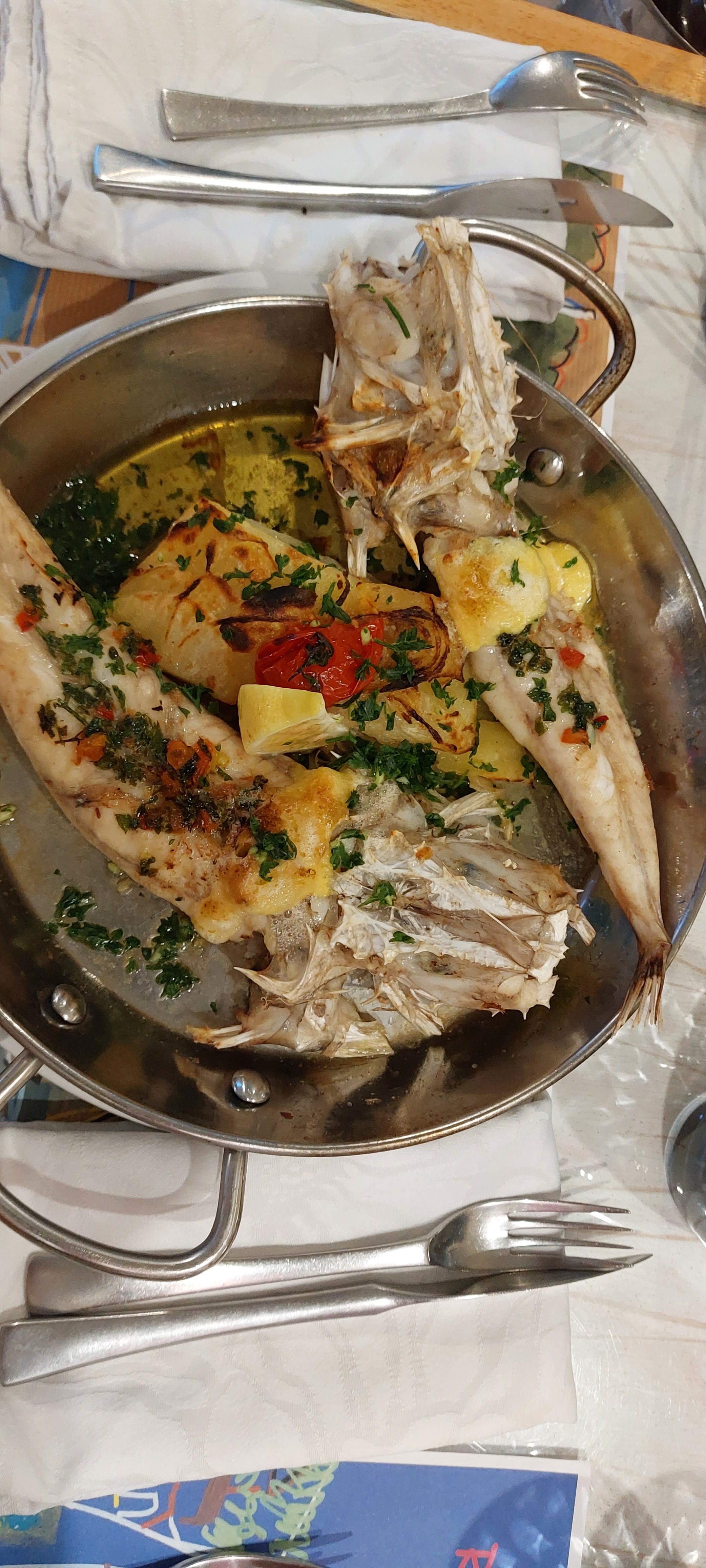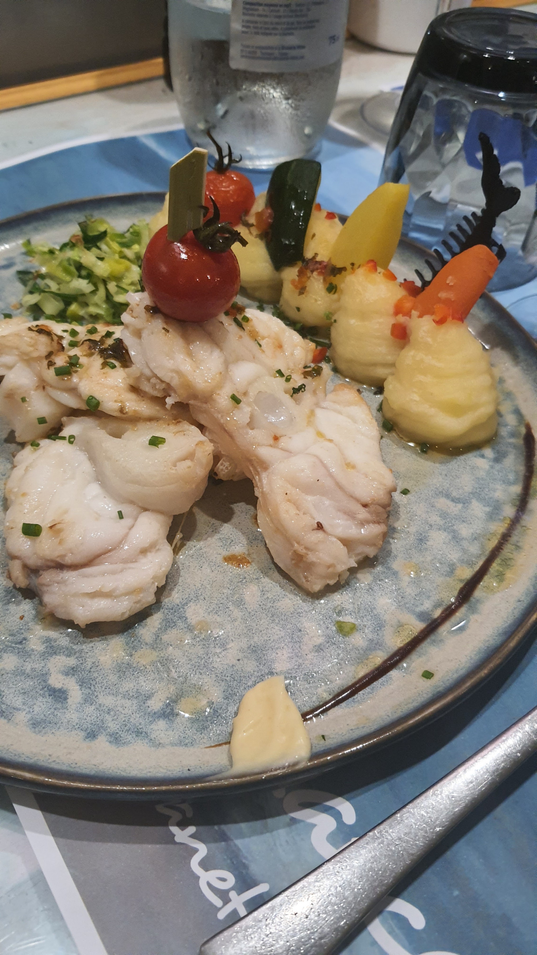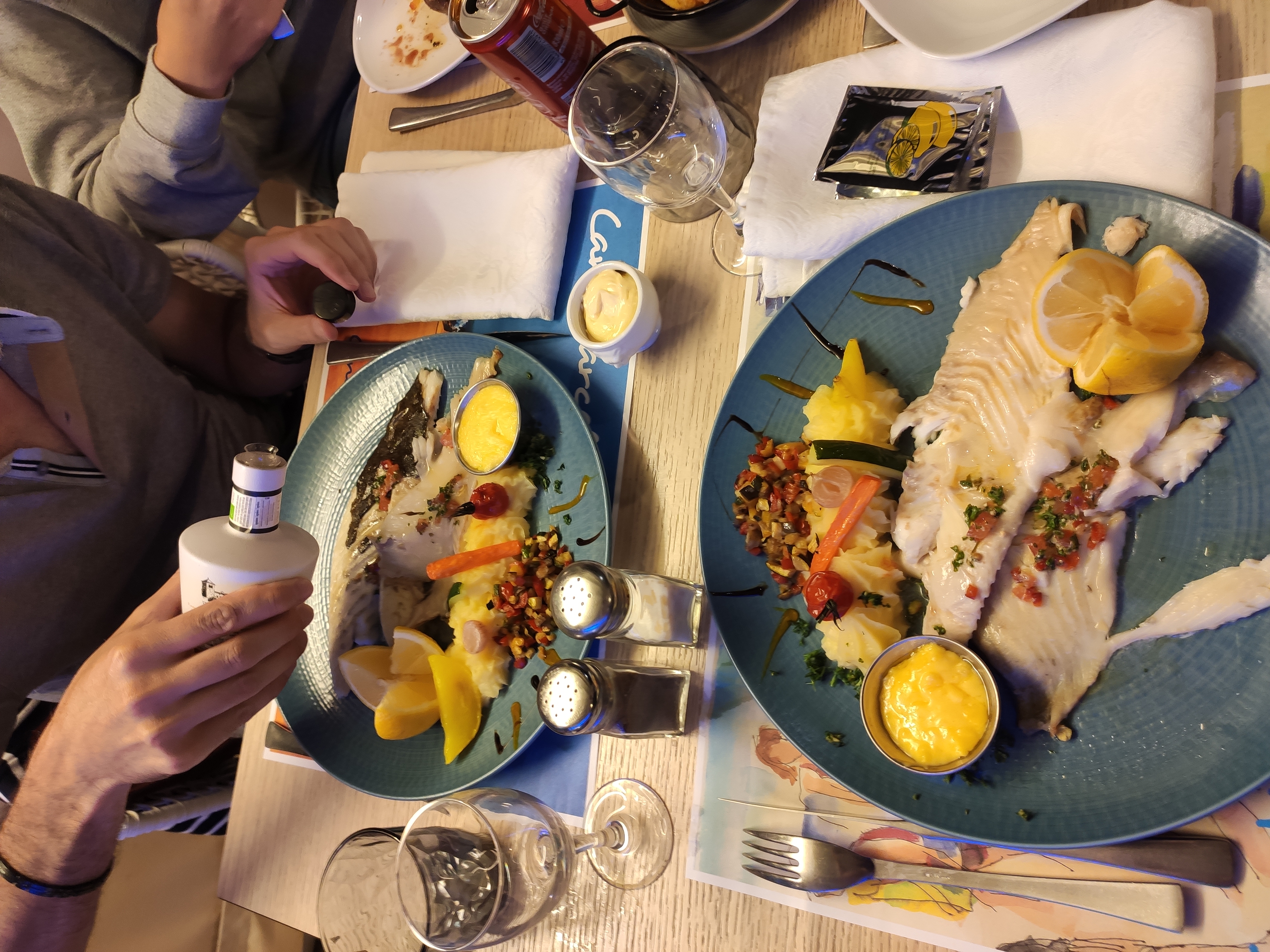 C’est dimanche et on est pas pressé, ça tombe bien les serveuses non plus ! 30 clients 3 serveuses et un temps d’attente record. Ca fait seulement une heure qu’on est à table pour un poisson et on espère le dessert. Mais on a le temps n’est ce pas ?! Arrivé le turbot et la sole 30 euros pièce Les poissons deviennent rares en Méditerranée c’est la crise Qualité des poissons : bonne !! Mais l’écrasé de pomme de terre avec des légumes confits pas cuit euh 😒
